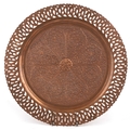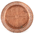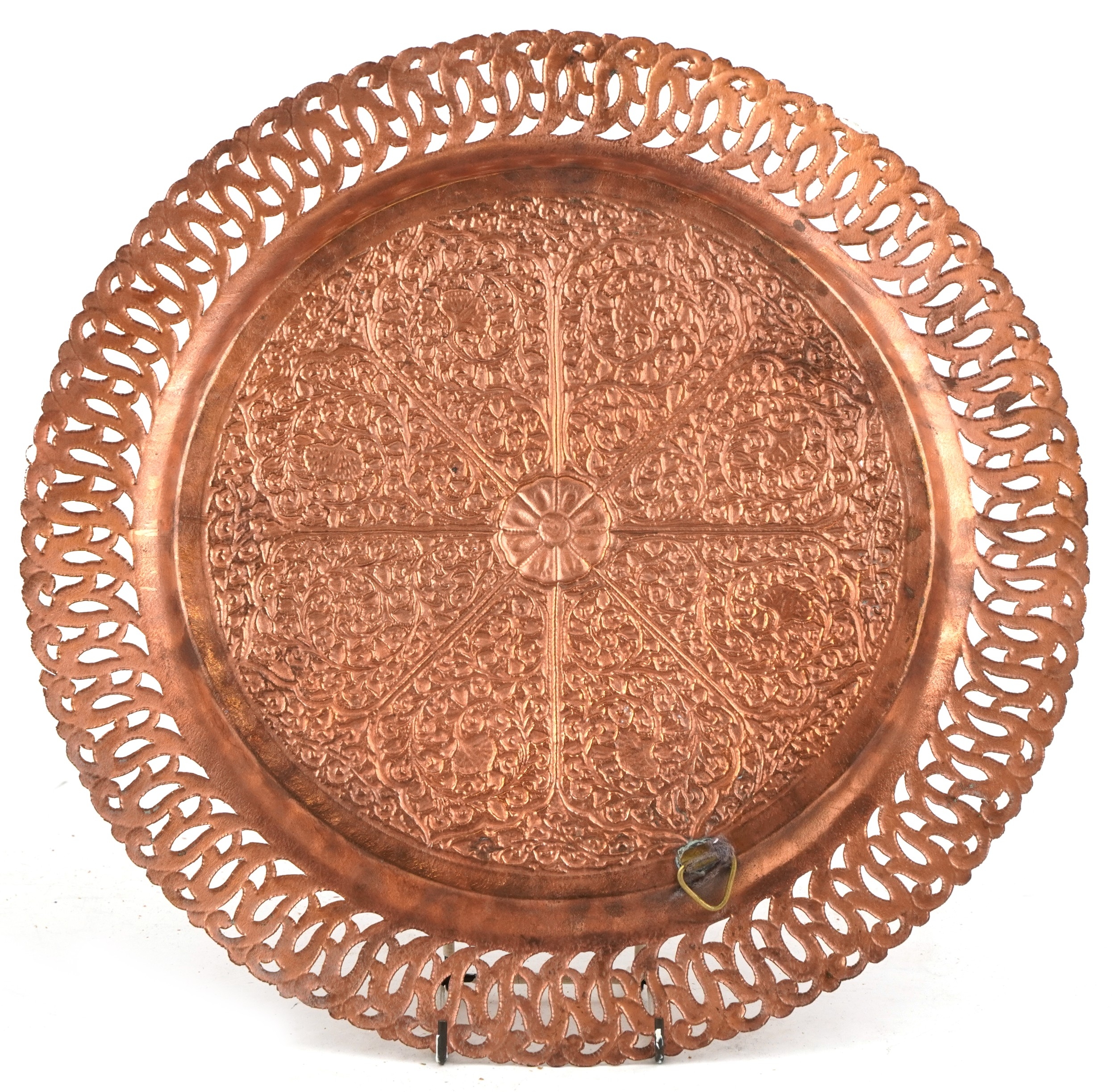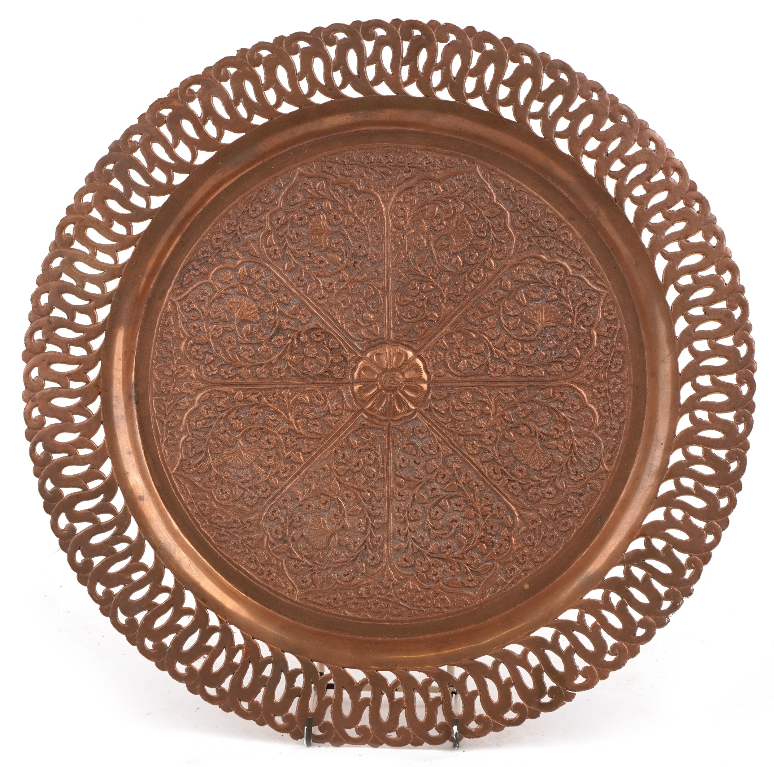 A Middle Eastern copper tray with repousse floral decoration and pierced rim, 38cm in diameter.
