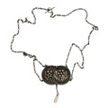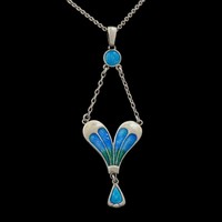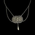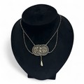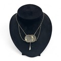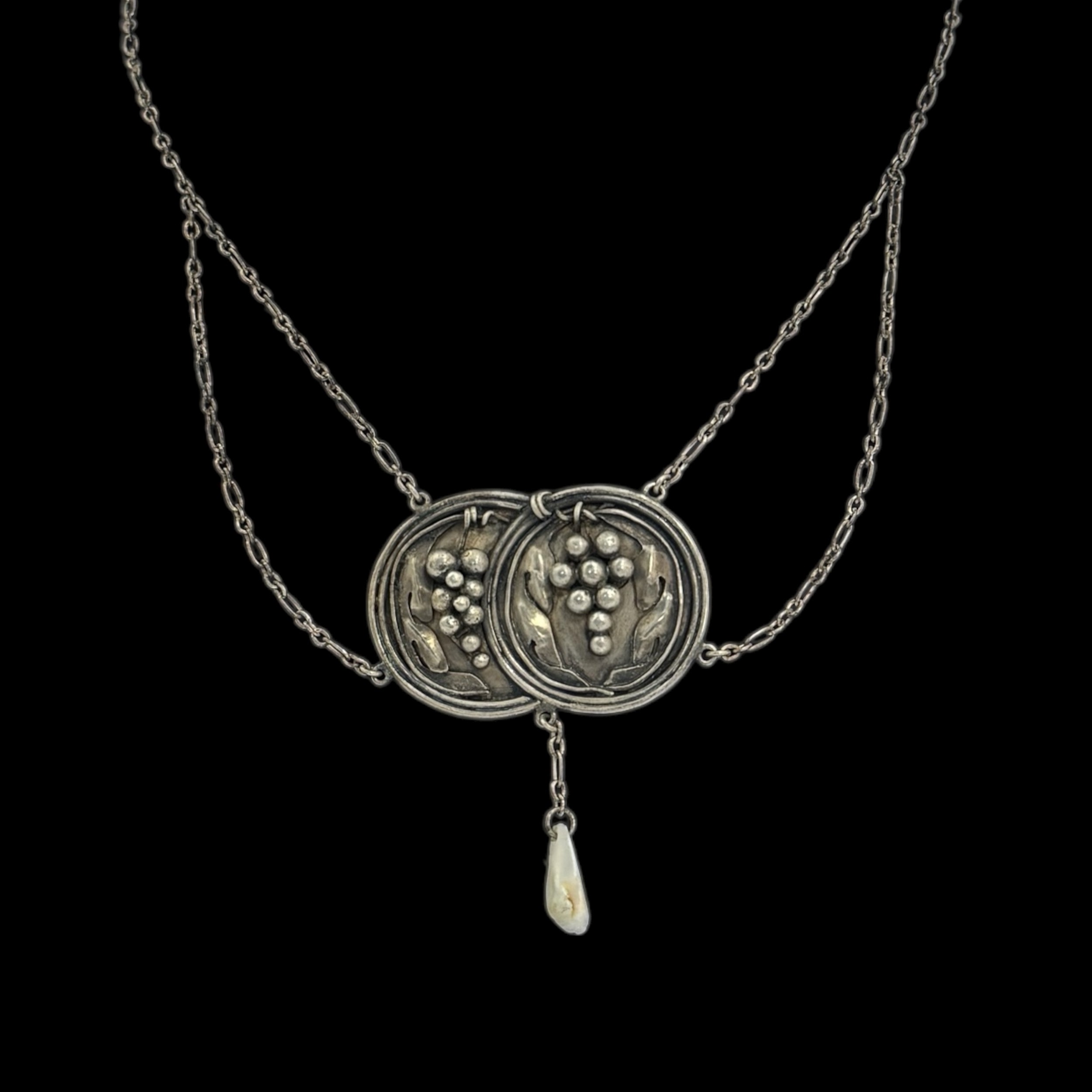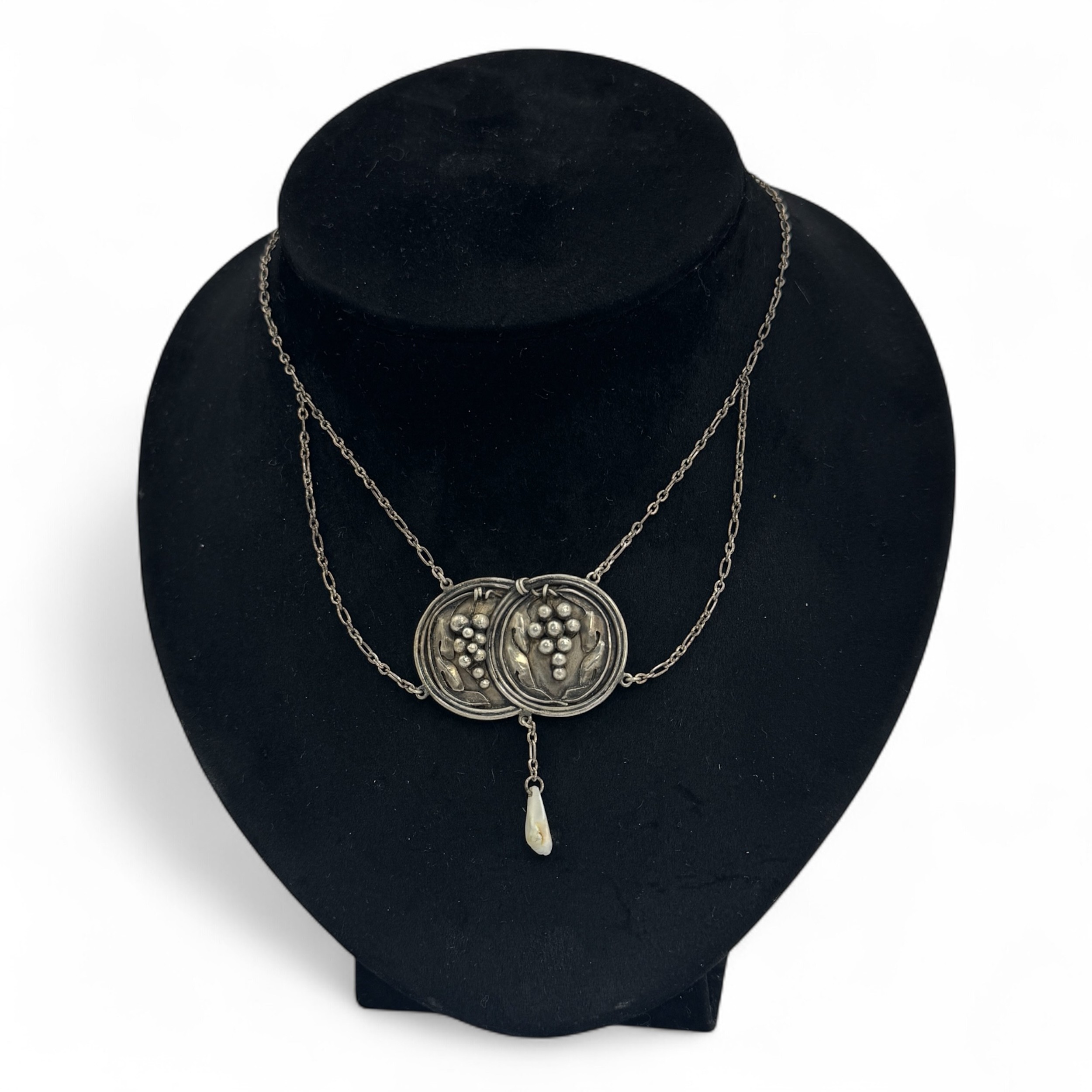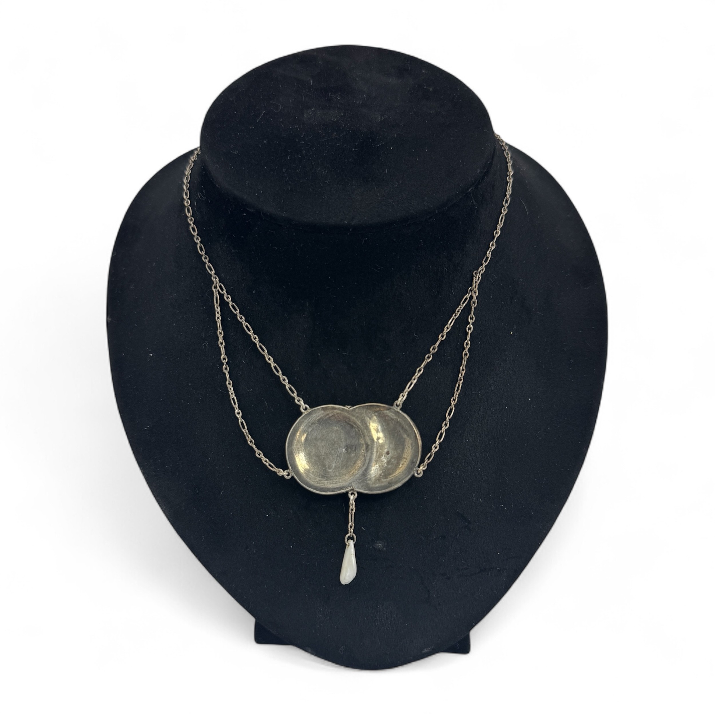 An early 20thC Arts & Crafts silver pendant necklace, two intersecting discs decorated with baroque pearl supported by pair of silver chains, unmarked but tests as silver, 25.5cm total drop with chain, 15g total weight. (LDC14796)