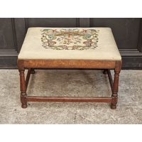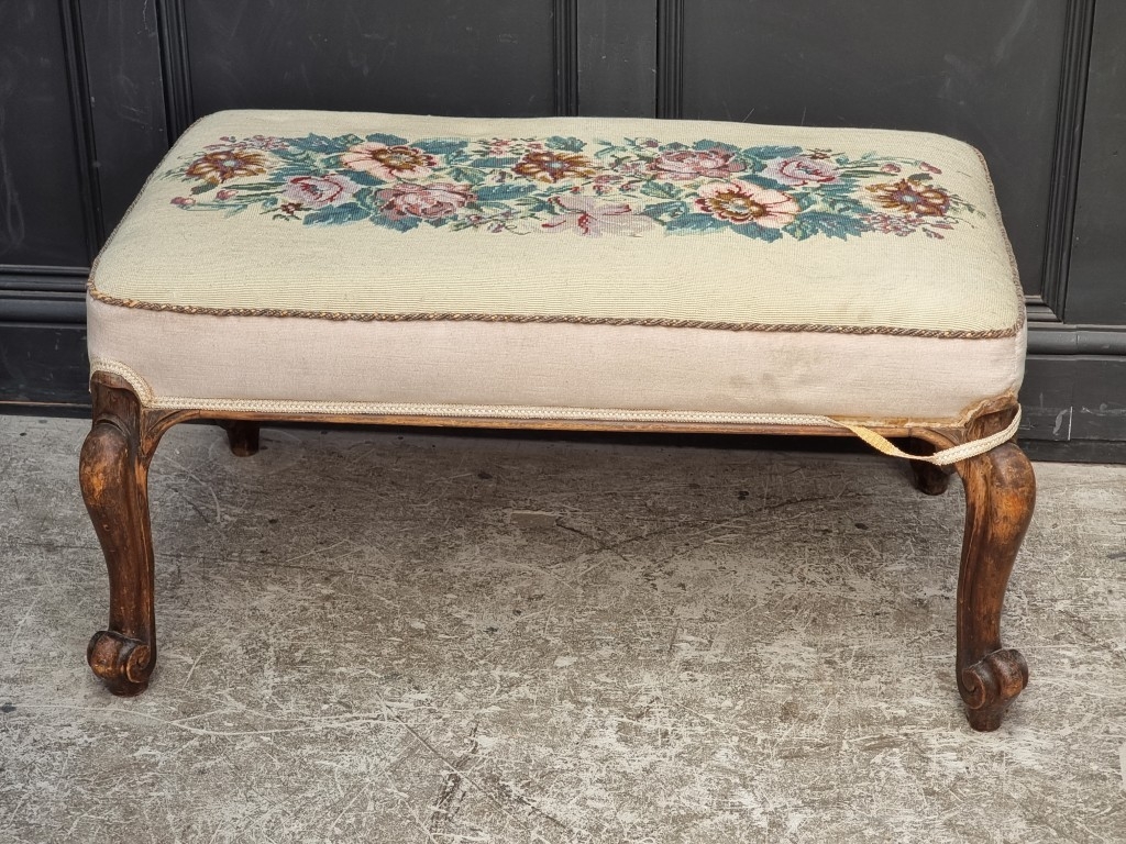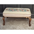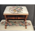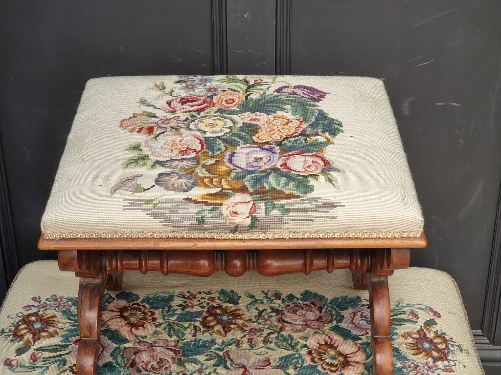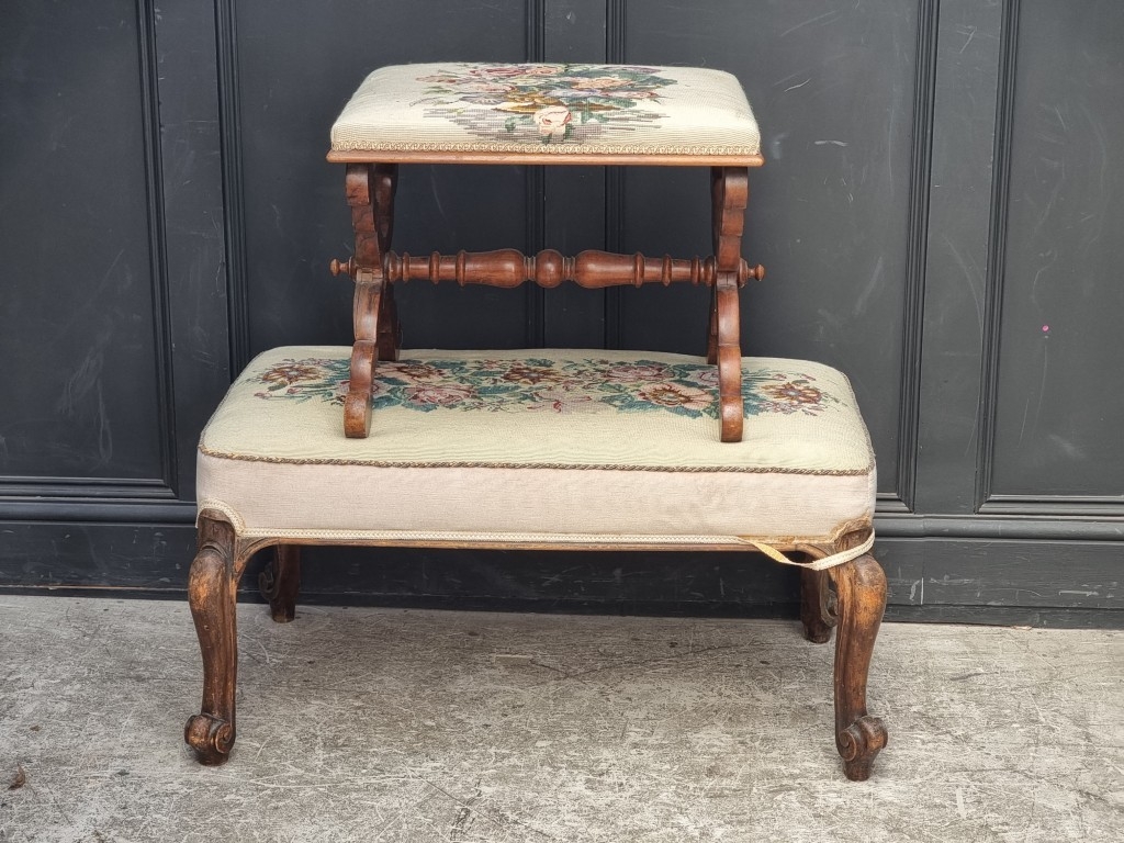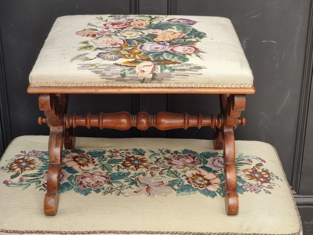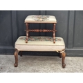 Two Victorian walnut and upholstered stools, largest 95.5cm wide.
