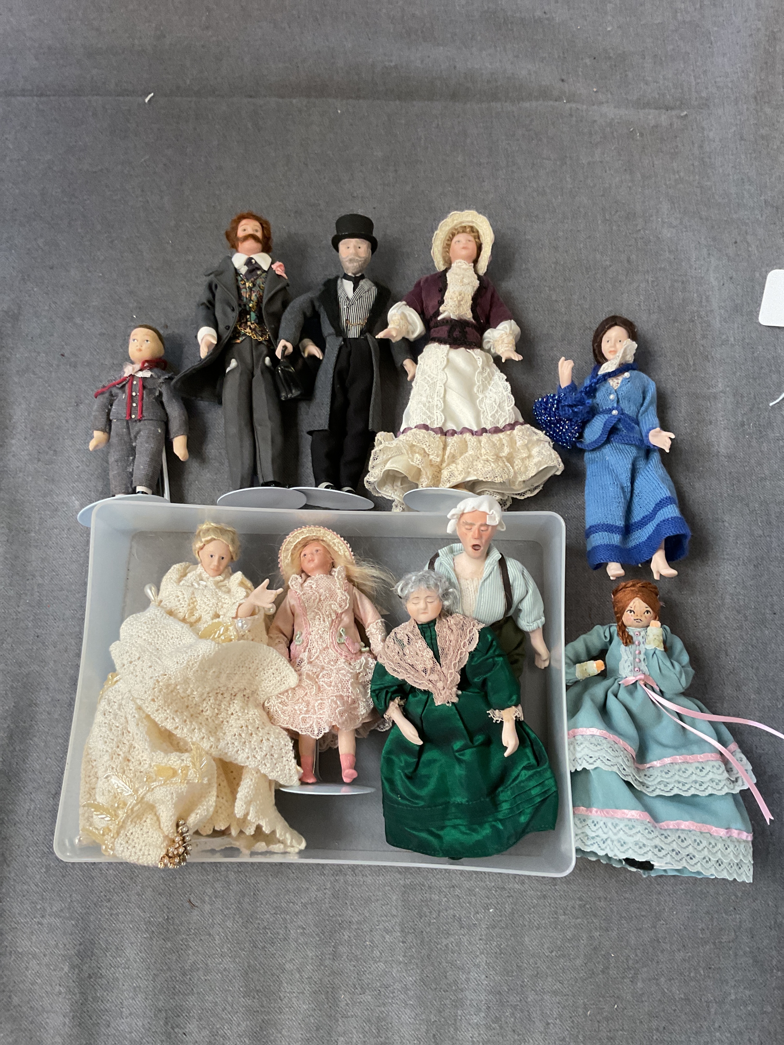 Ten assorted dolls house figurines to include bisque headed and wooden head