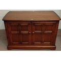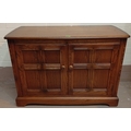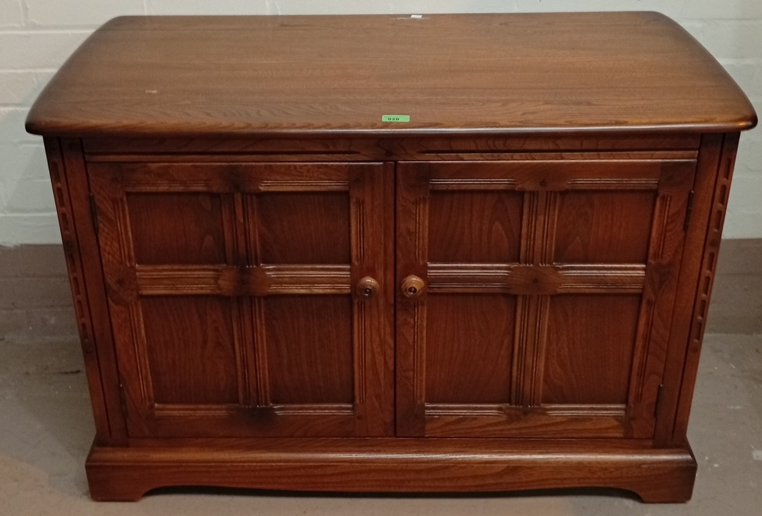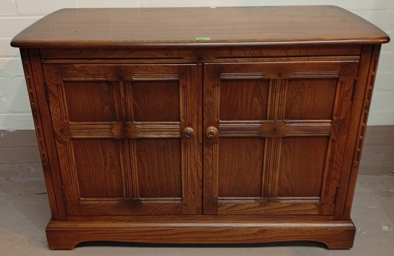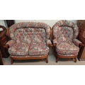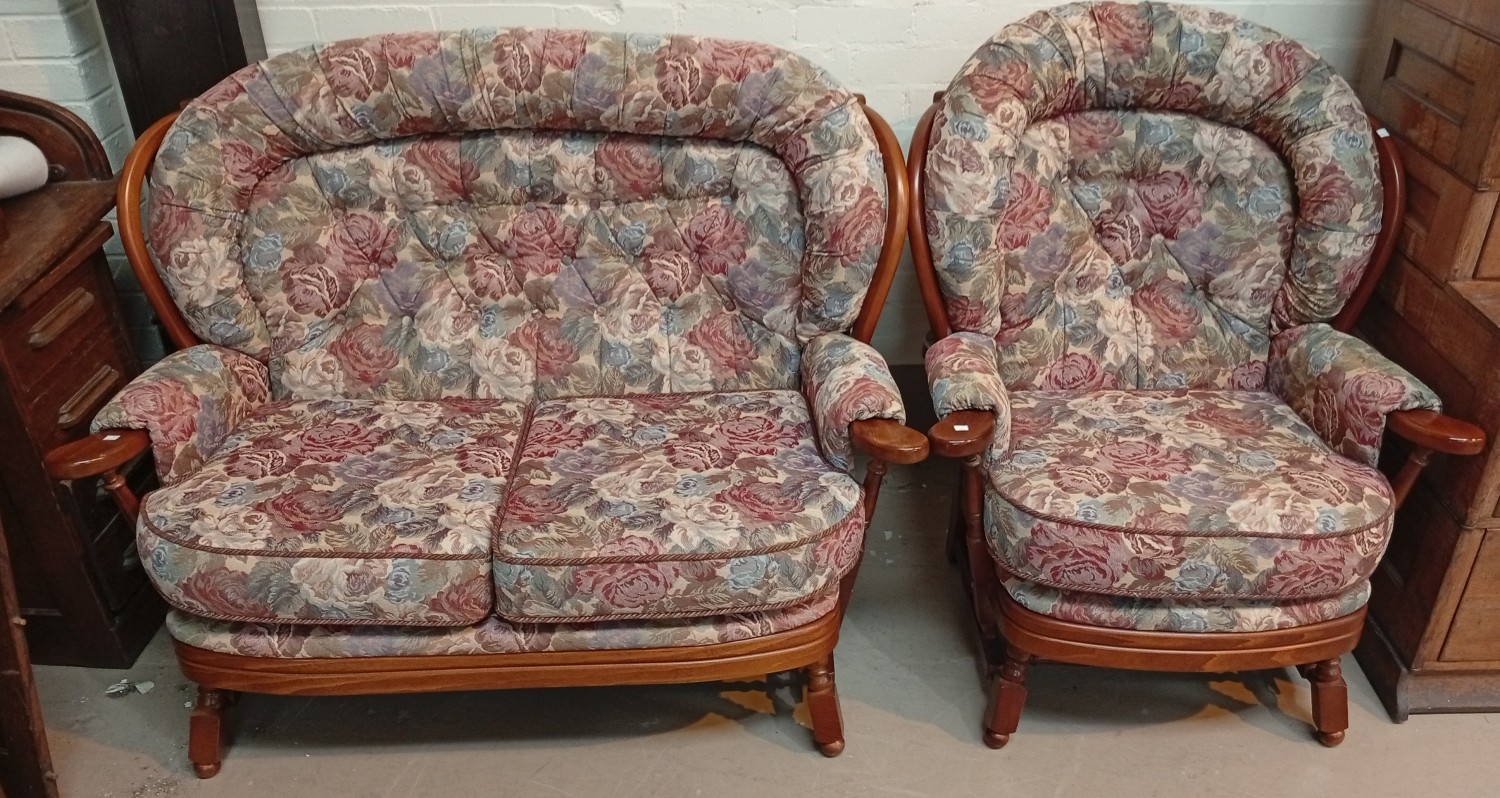 A traditional-style wing back two-piece suite in floral tapestry, comprising two seater settee and armchair; an Ercol record/side cabinet with hinged lid and double doors.