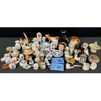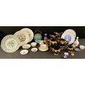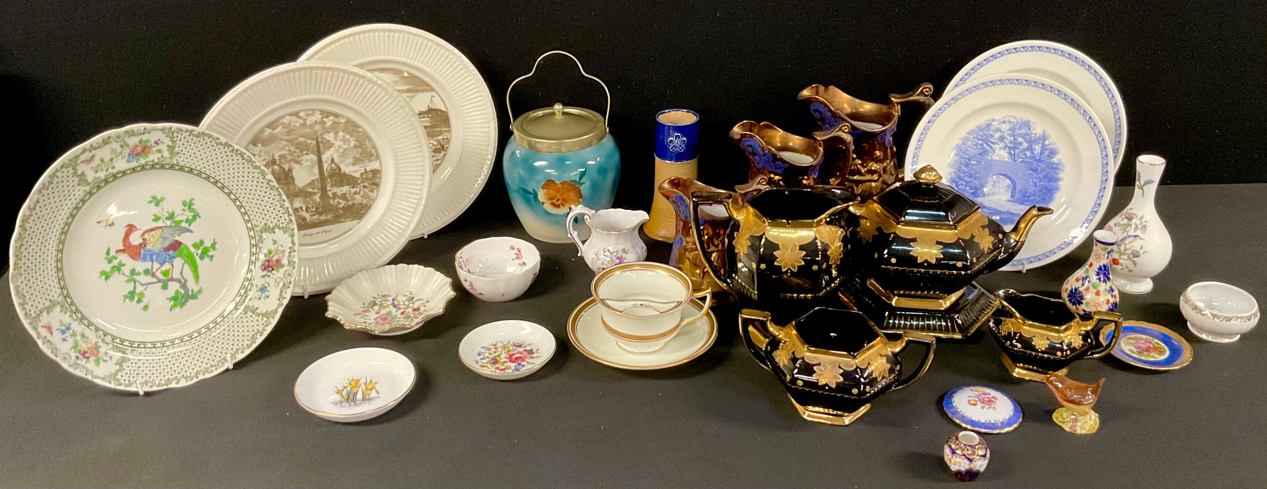 Ceramics - graduated set of three copper lustre jugs, Aynsley moustache cup, Mount Holyoak College plates, Beswick, Royal Worcester etc