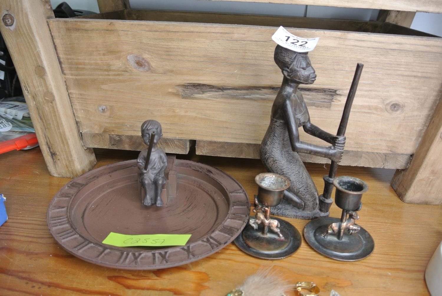A African carved wood figure along with a change dish and candle holders.