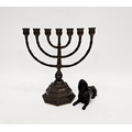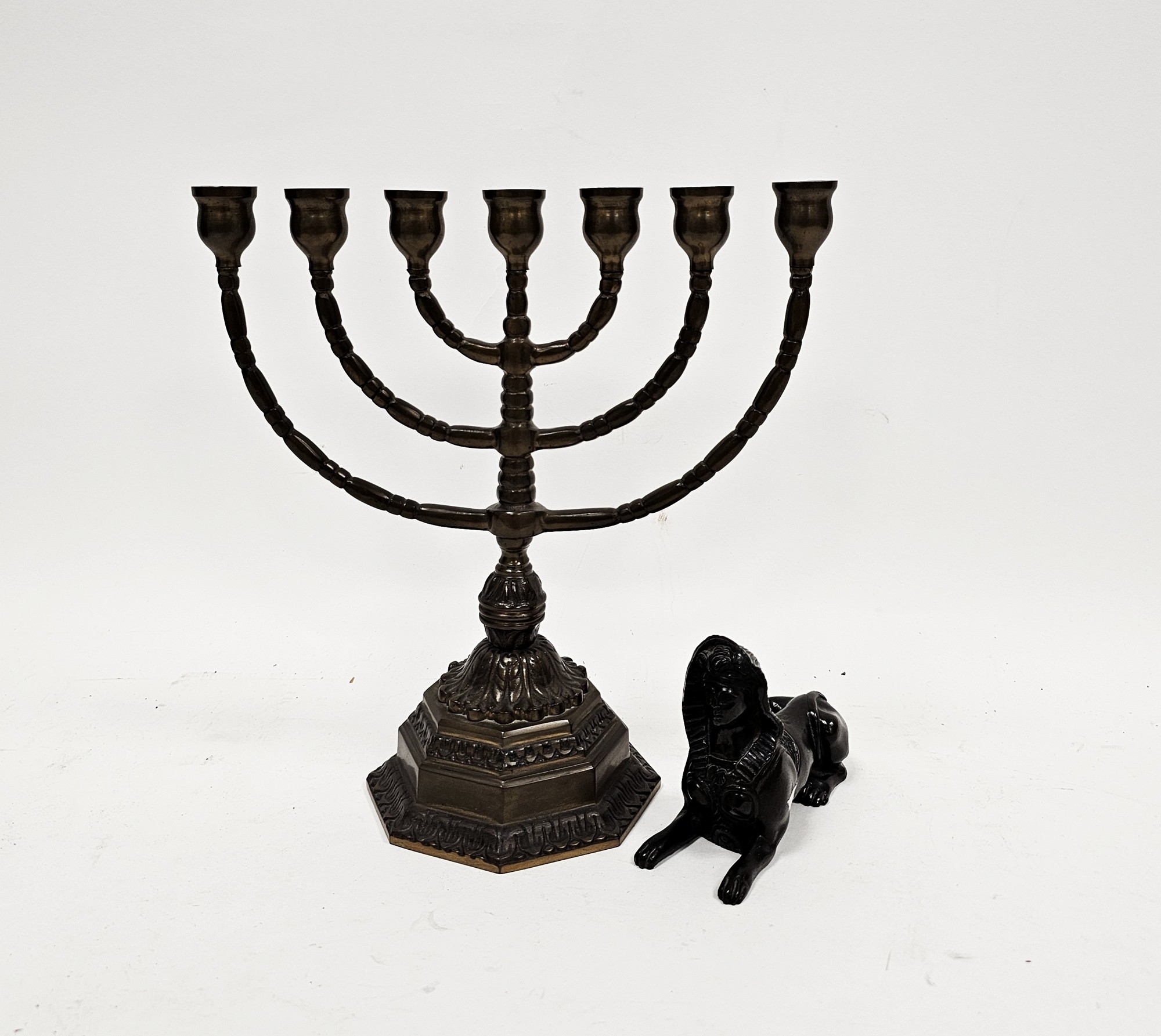Patinated brass model of an Egyptian sphinx, 12.5cm long and a brass menorah candle holder on a hexagonal base, 27cm high (2)