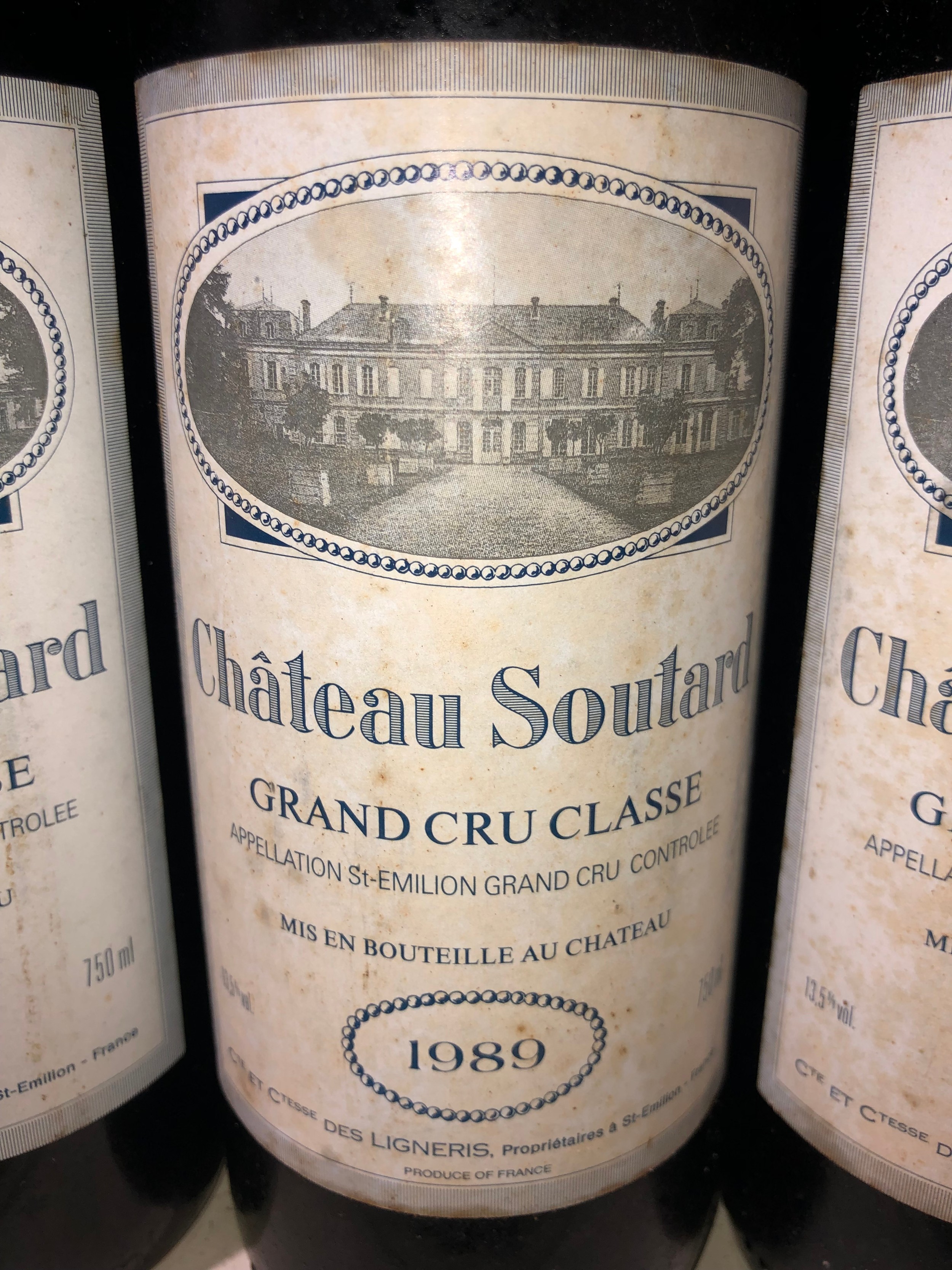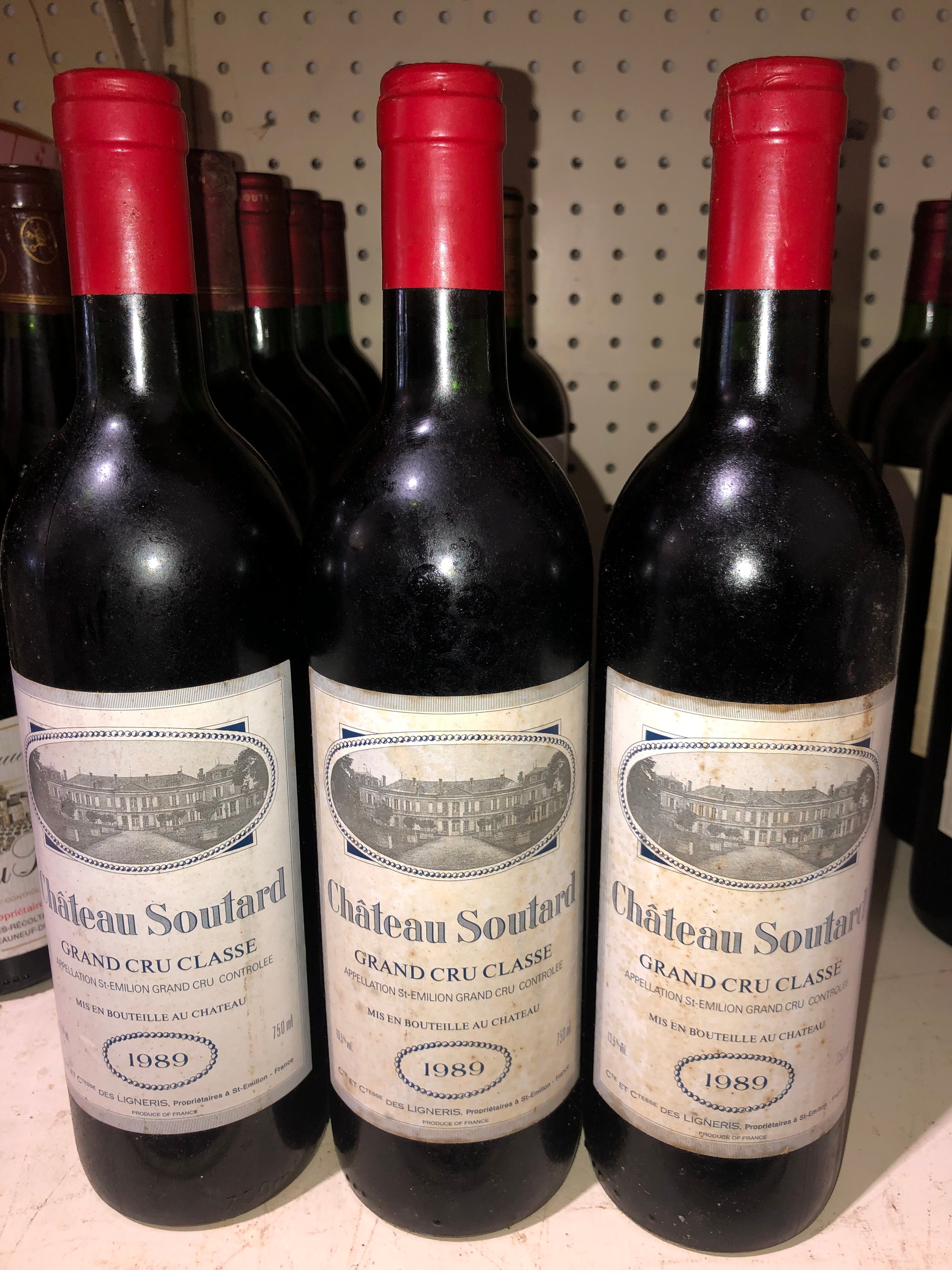 3 bottles of 1989 Chateau Soutard Grand Cru Classe, France. Stored in a temperature and humidity controlled environment whilst aging. See lot 151 for pictures of gauges.