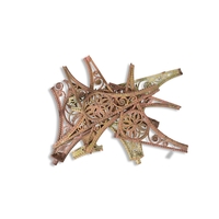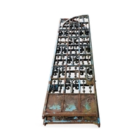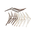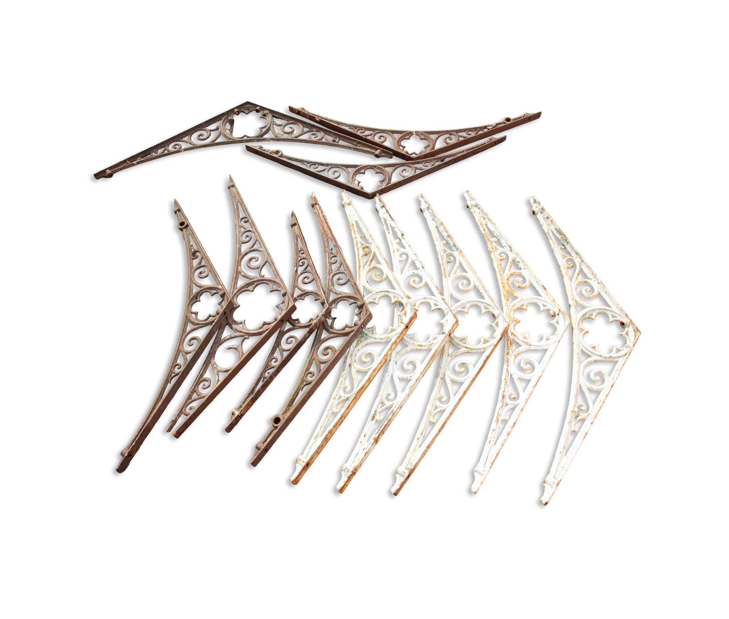 A SET OF TWELVE WHITE-PAINTED CAST IRON CANOPY BRACKETS, LATE 19TH CENTURY, of bowed triangular form with pierced scrolls, 35cm high, 149cm wide, 4.5cm deep, with conforming supports