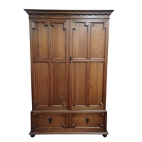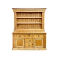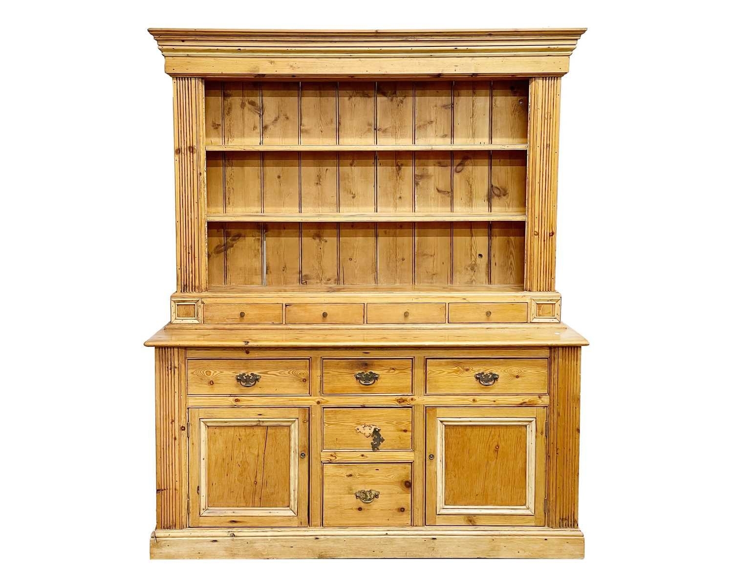 A pine kitchen dresser. The plate rack with two shelves and four spice drawers, the lower part with an arrangement of five drawers and two cupboards on a plinth base, height 188cm, width 156cm, depth 49.5cm.