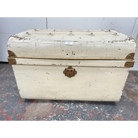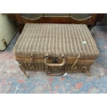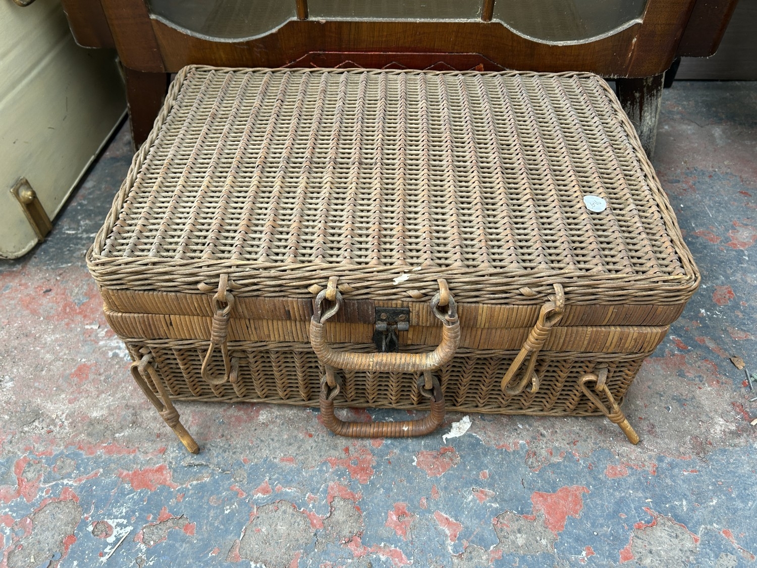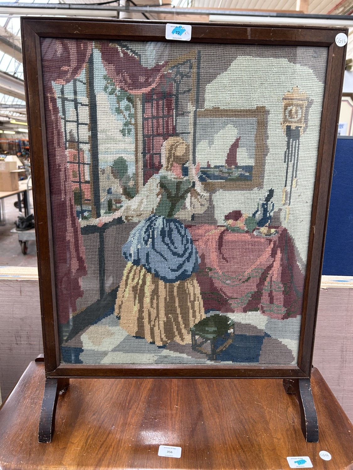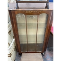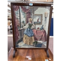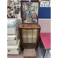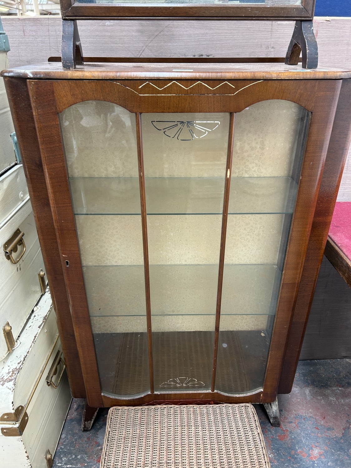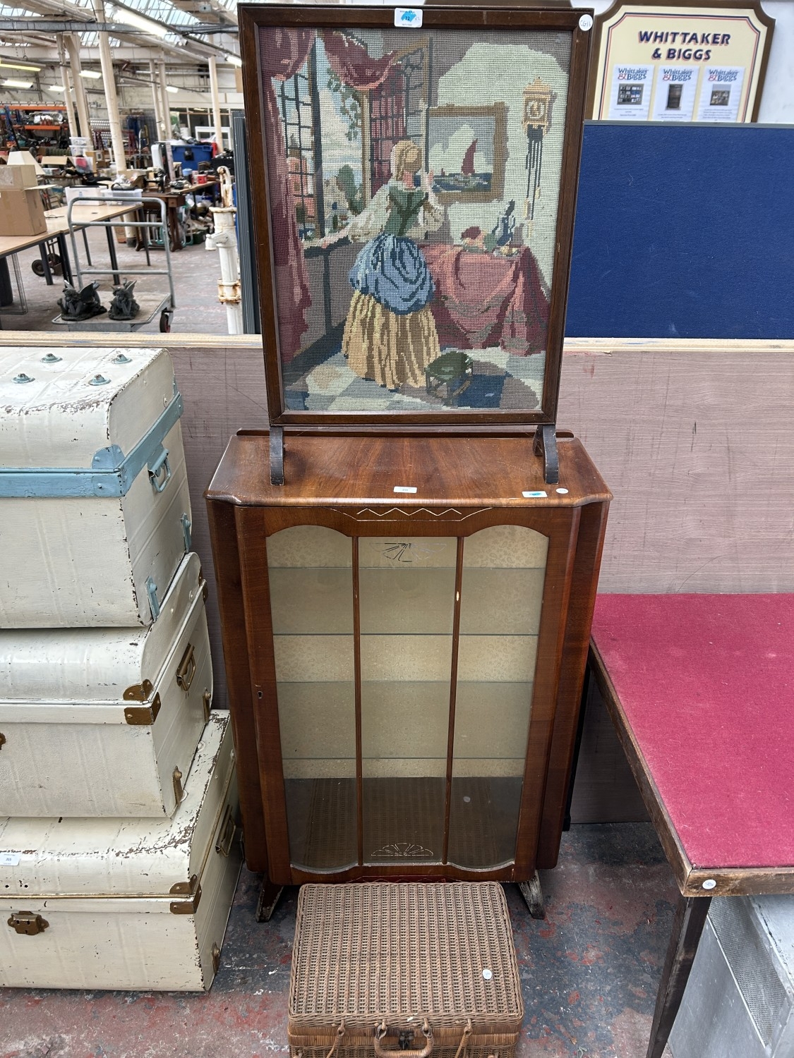 Three items, one walnut display cabinet, one mahogany framed tapestry fire screen and one wicker picnic basket