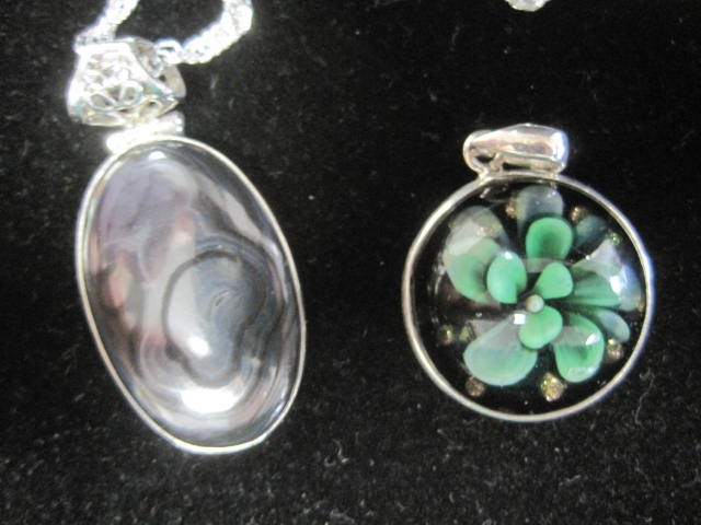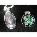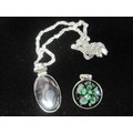 925 silver oval pendant set with a graphite-colour polished stone, pierced suspension loop, on a twist chain stamped ACPL 925, length about 43.5cm. Together with a 925 mounted circular green glass foliate pendant (diameter 2.1cm)