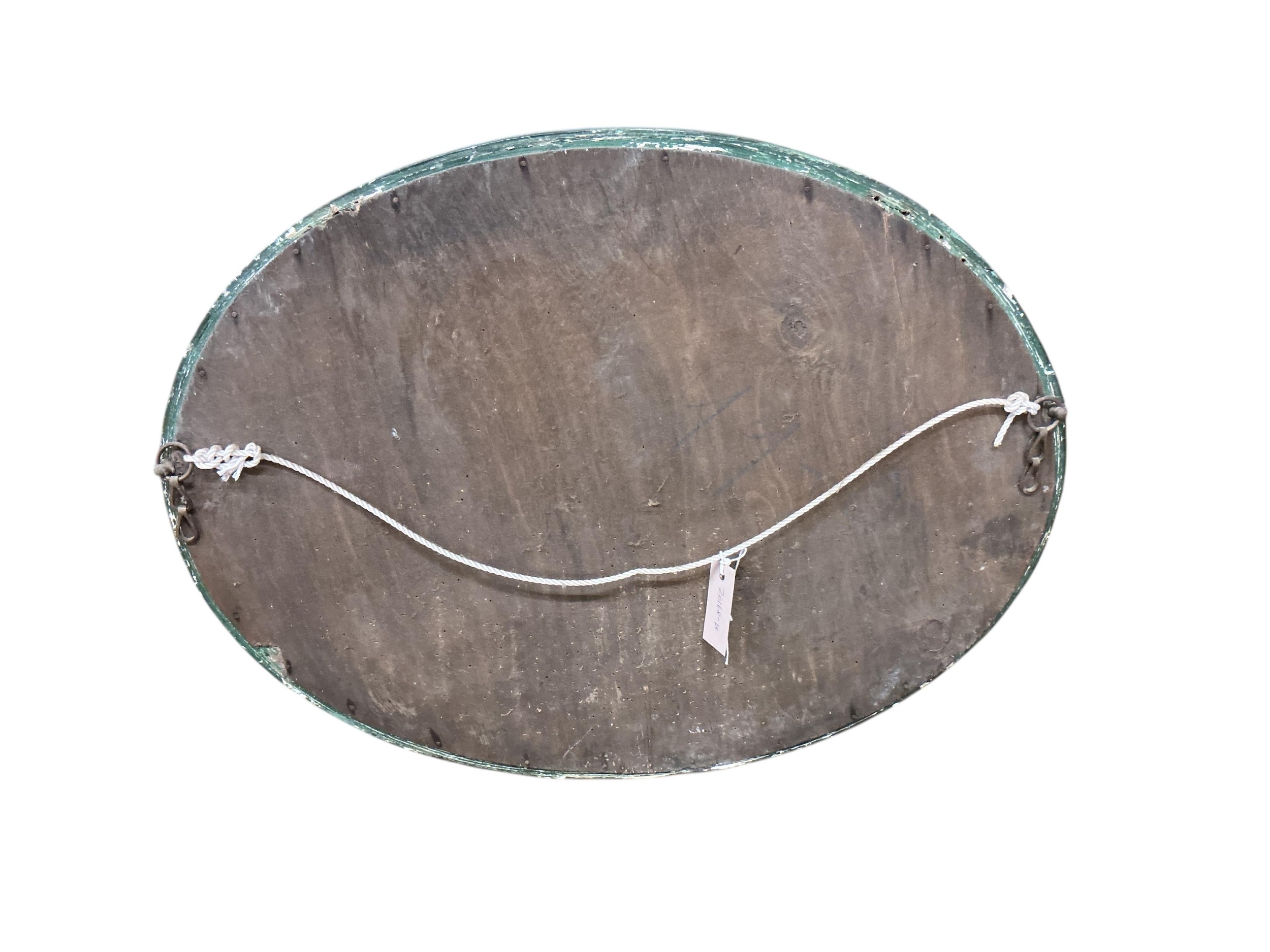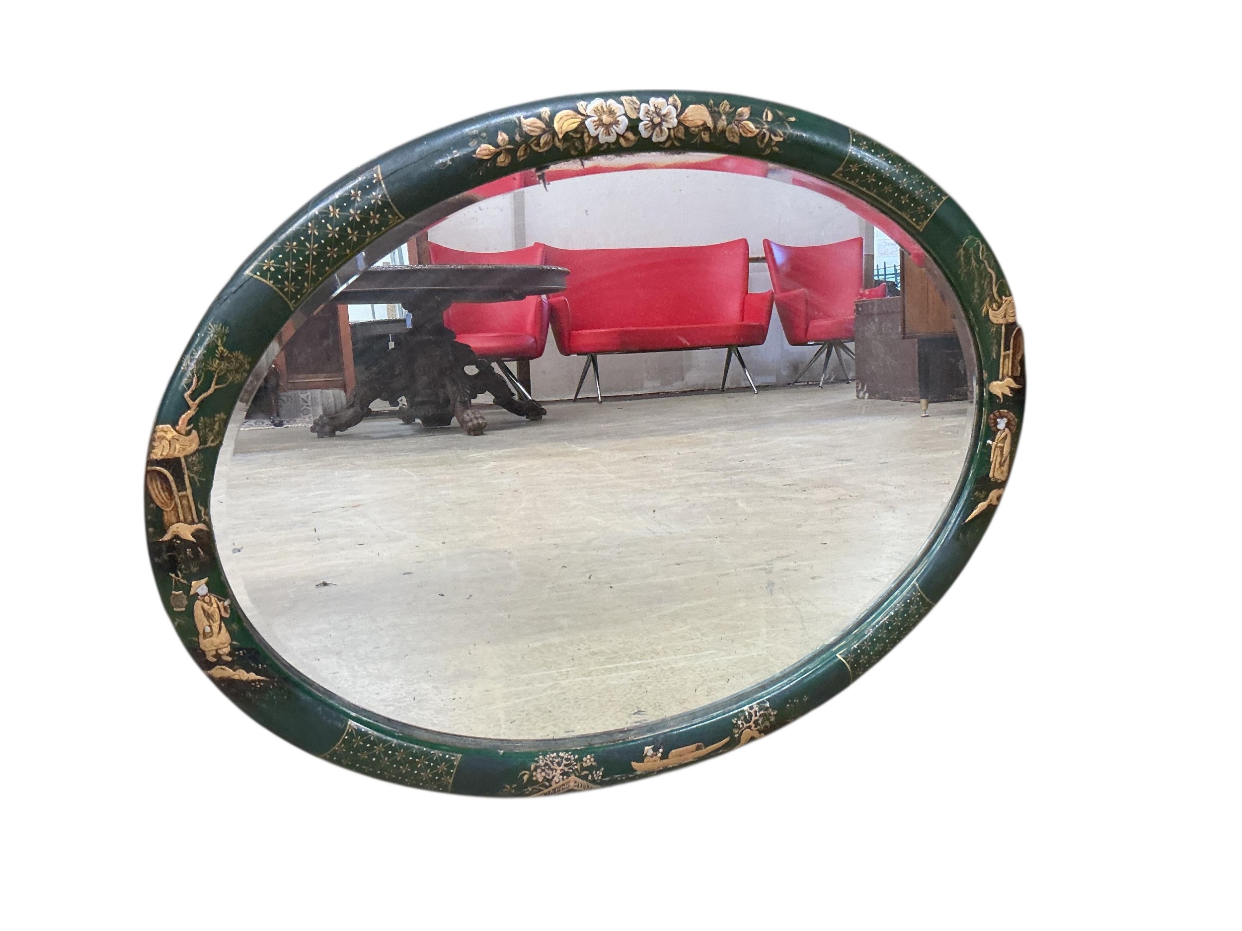 An early 20th century oval chinoiserie lacquer wall mirror, width 68cm, height 53cm