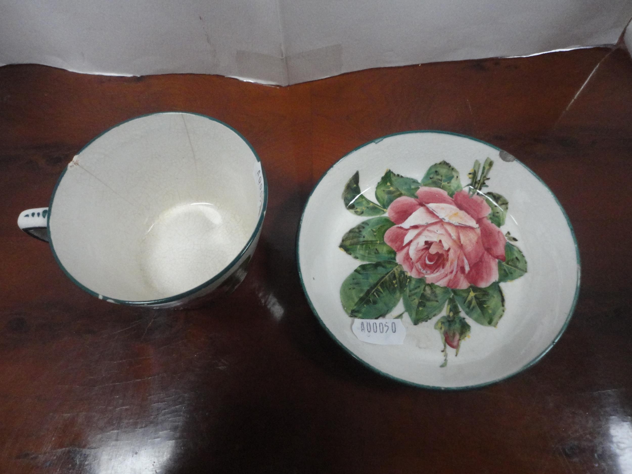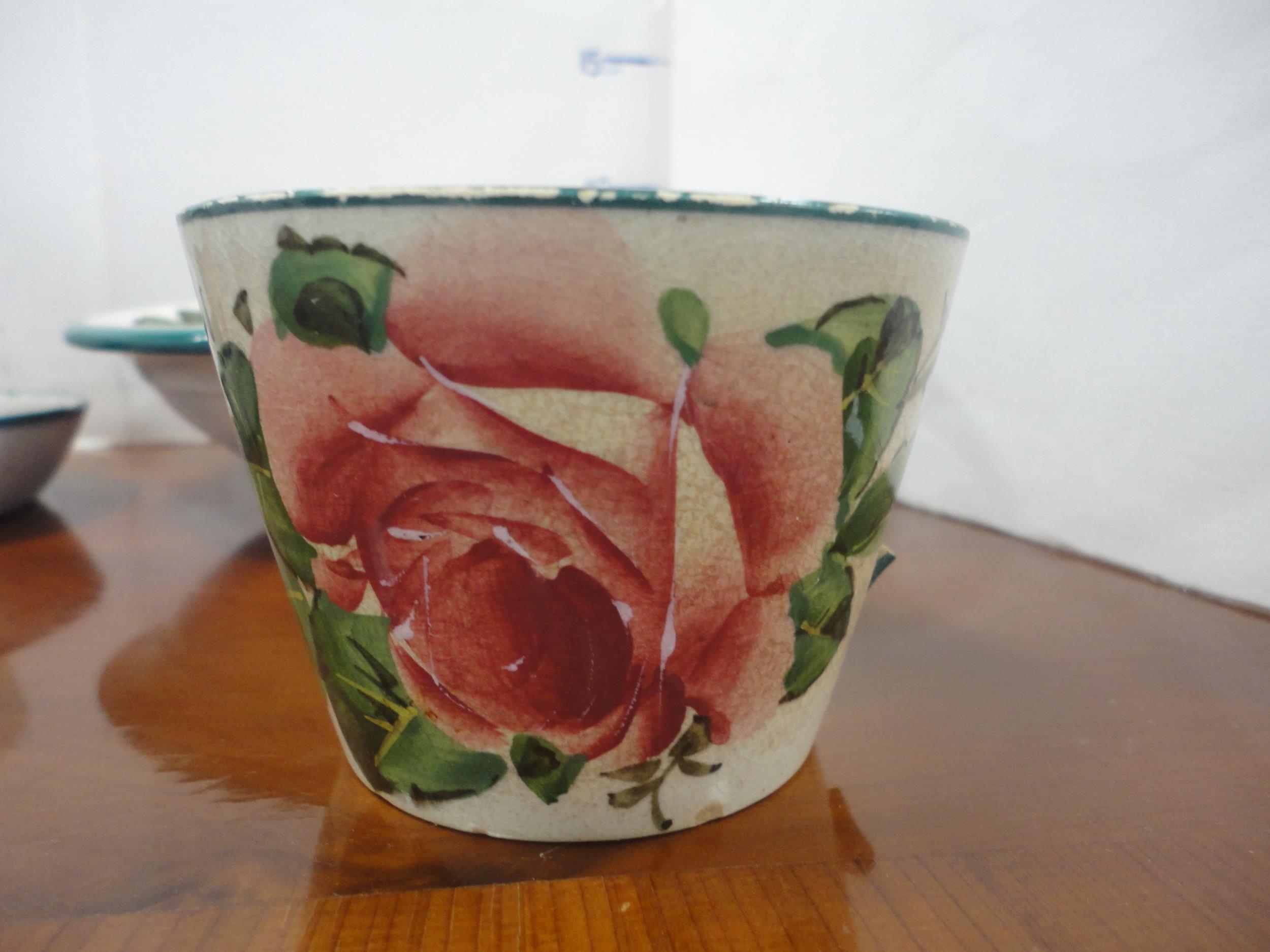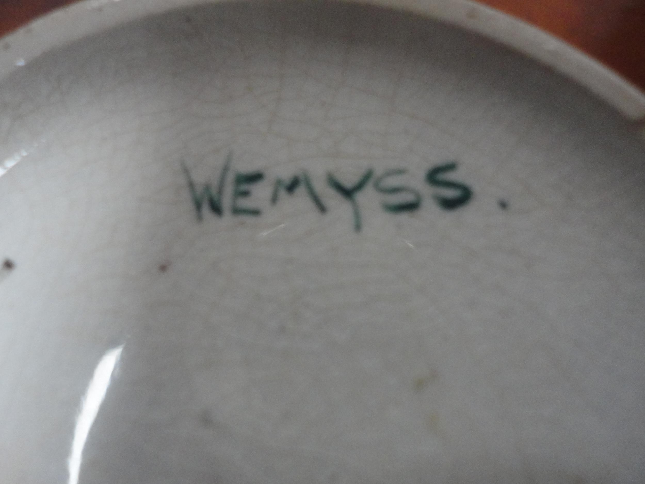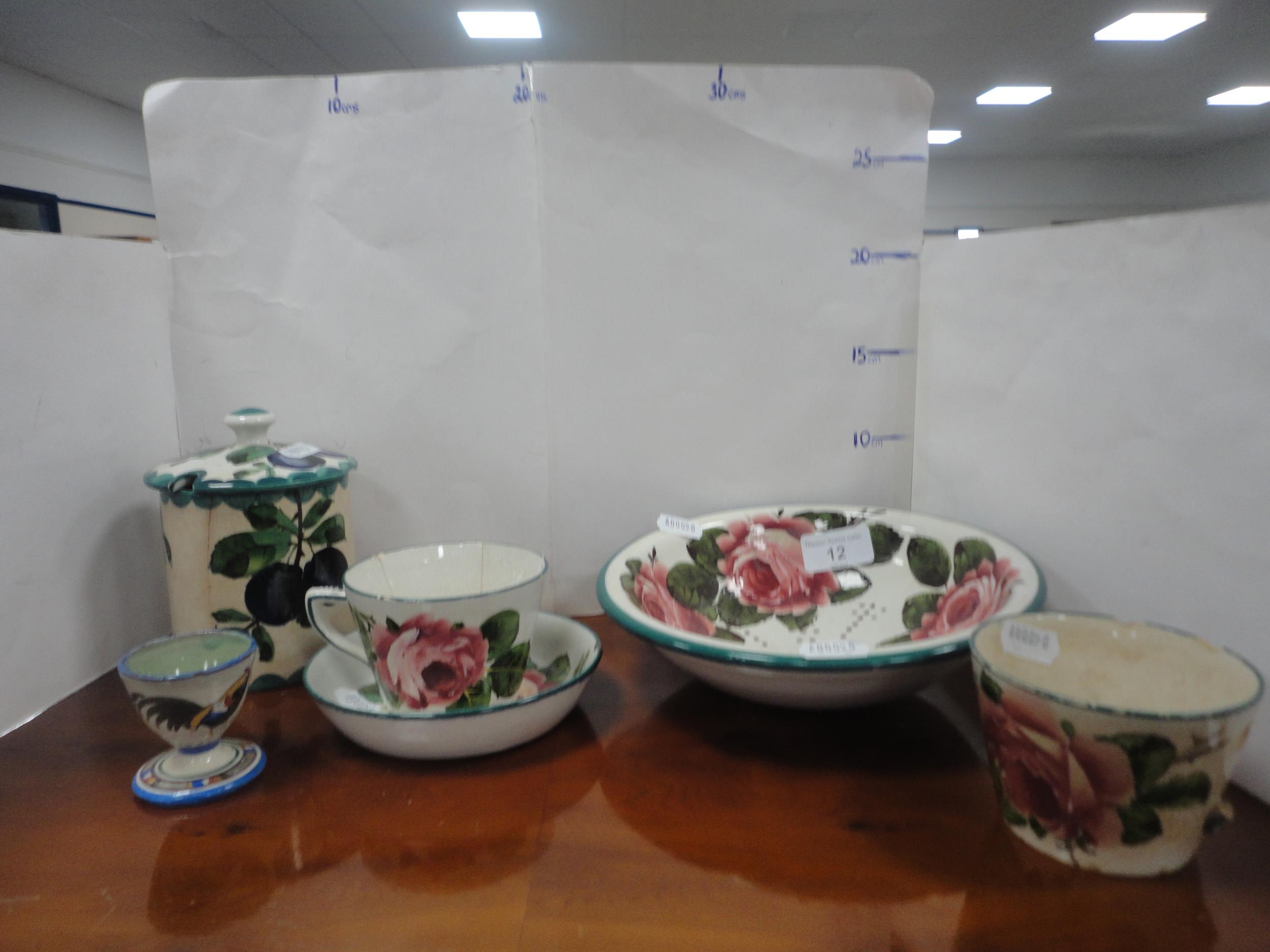 Group of Wemyss pottery to include a lidded preserve pot, tea cup and saucer, egg cup, strainer and another tea cup, decorated in the pink cabbage rose pattern and fallen fruit. (6)