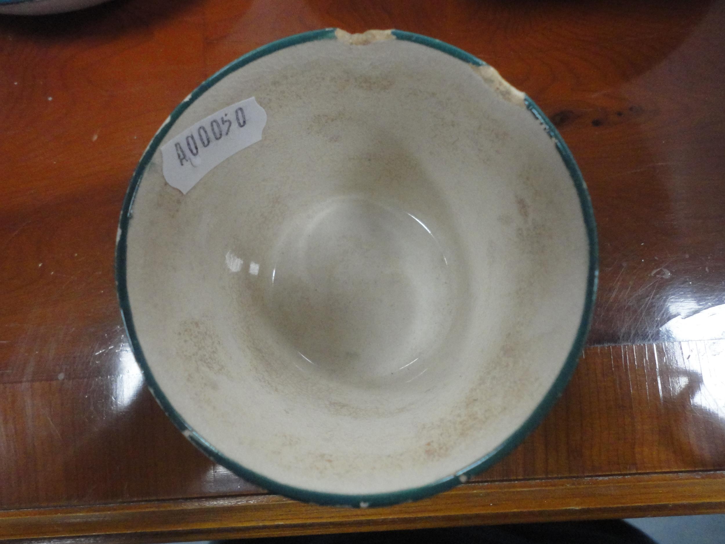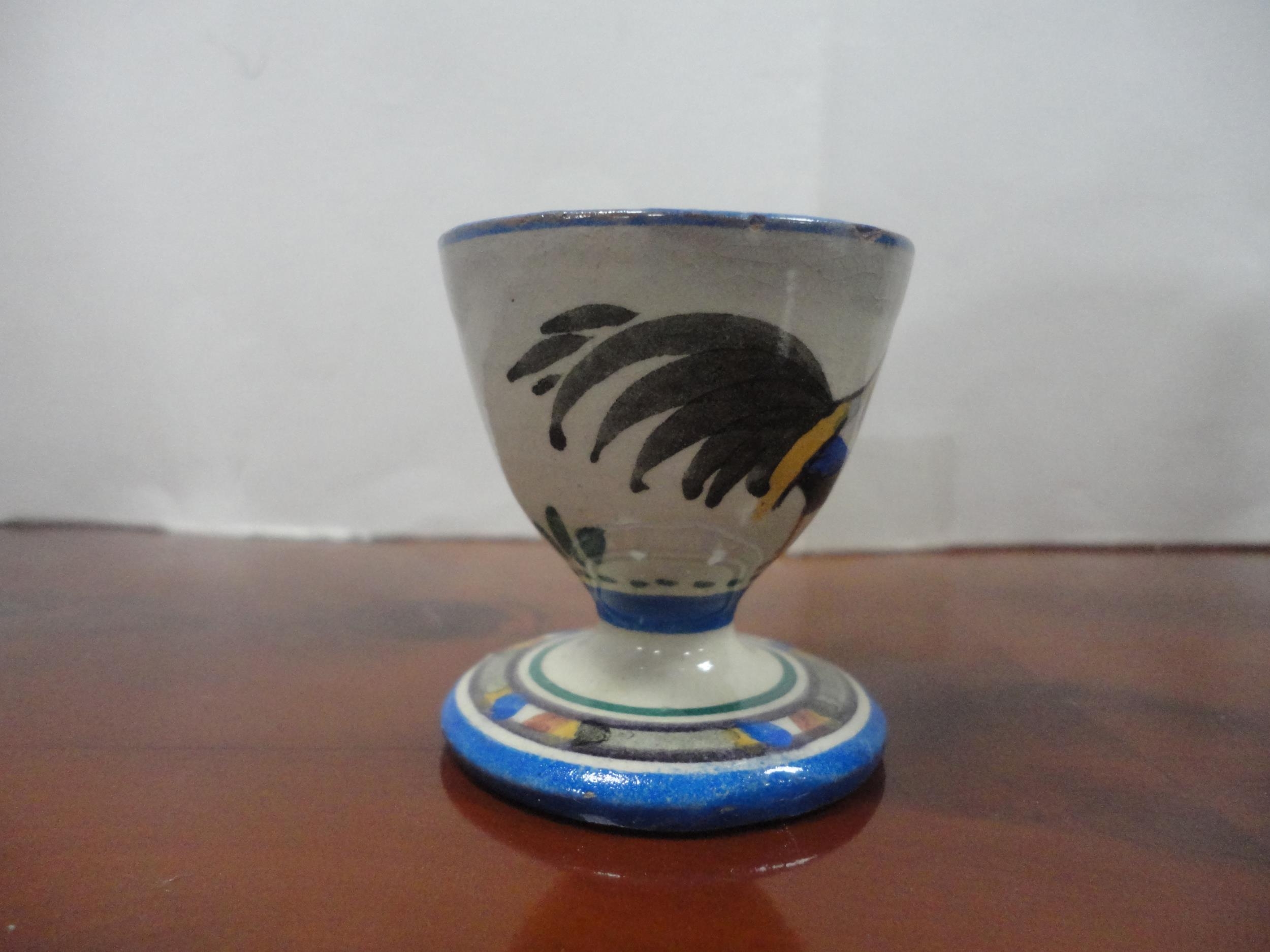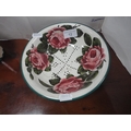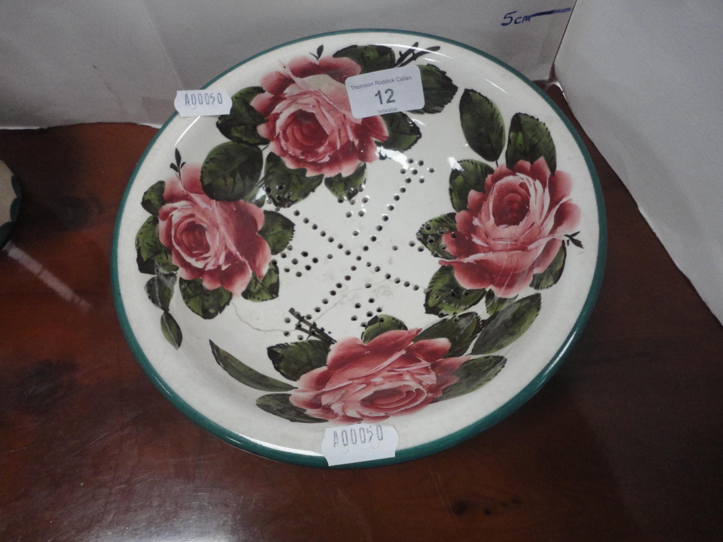 Group of Wemyss pottery to include a lidded preserve pot, tea cup and saucer, egg cup, strainer and another tea cup, decorated in the pink cabbage rose pattern and fallen fruit. (6)
