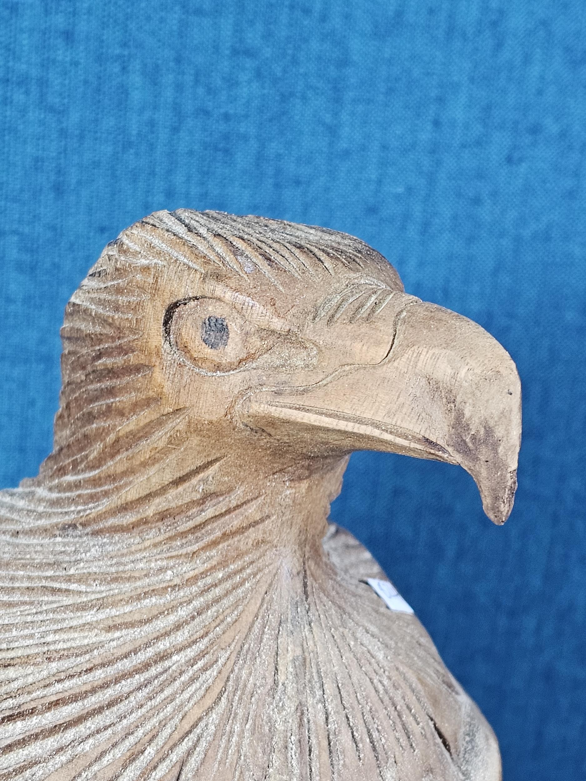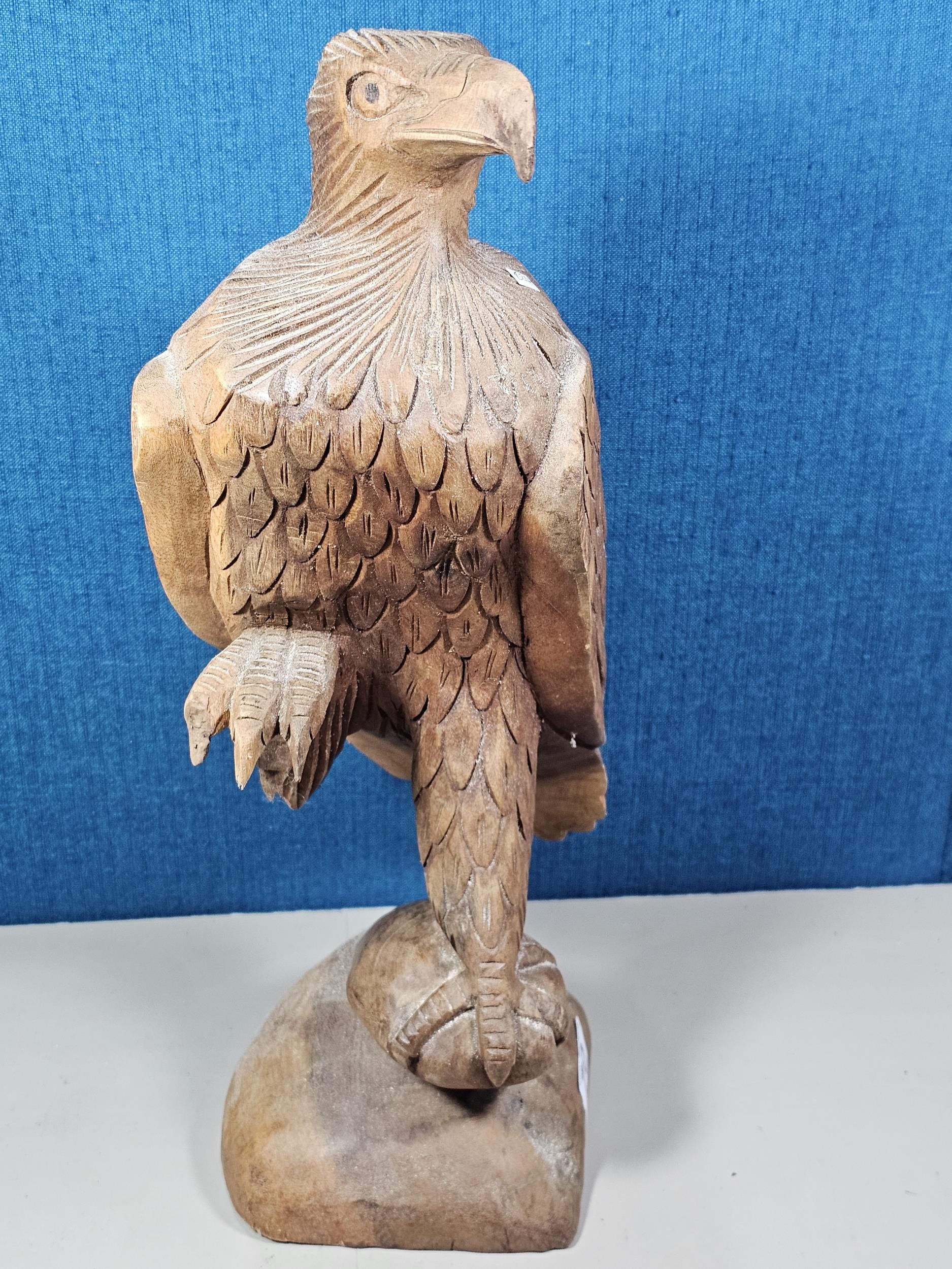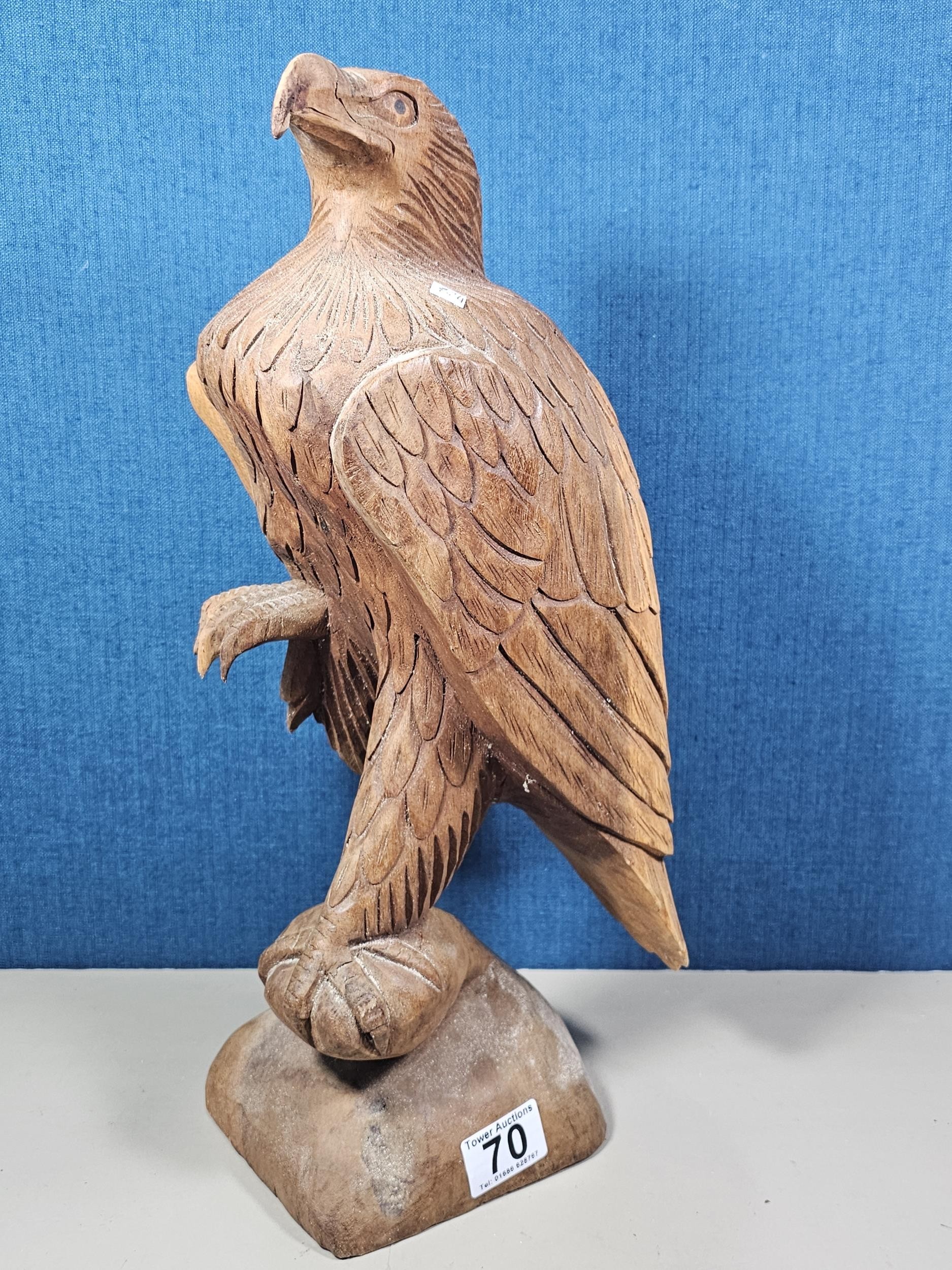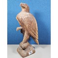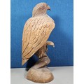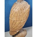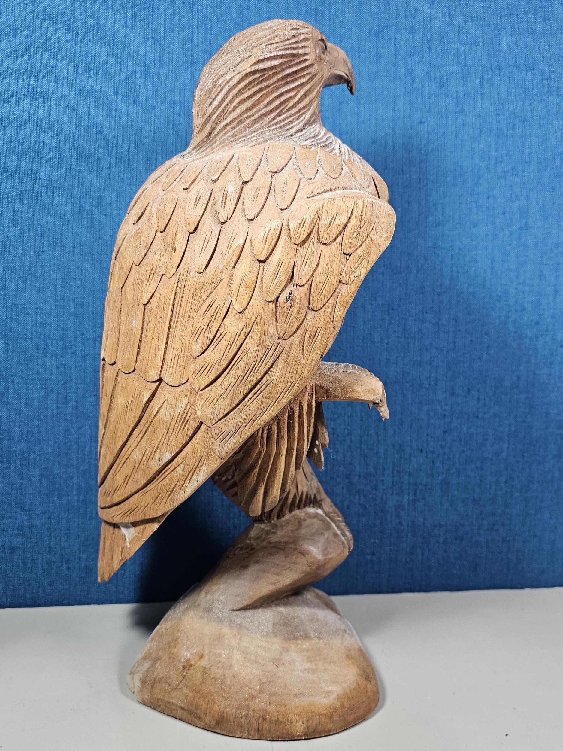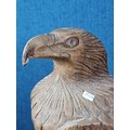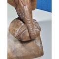 A good quality hand carved solid wood eagle figure standing on a plinth, in very good detail. Has a height of 43cm, a length of 20cm and a depth of 14cm.