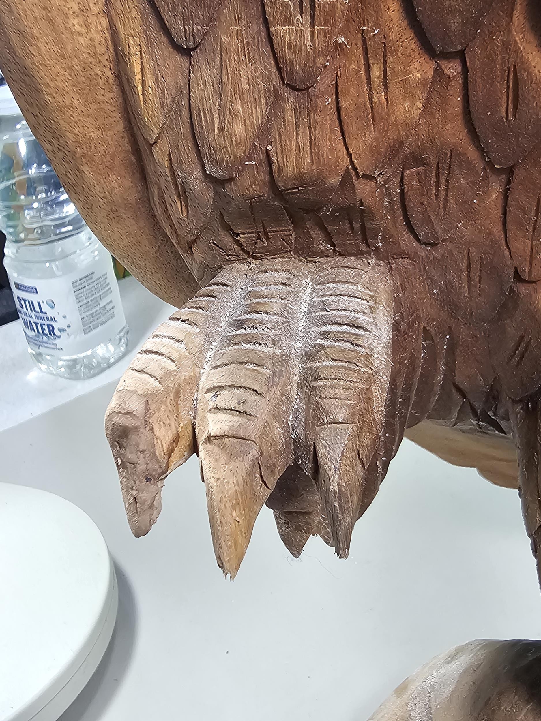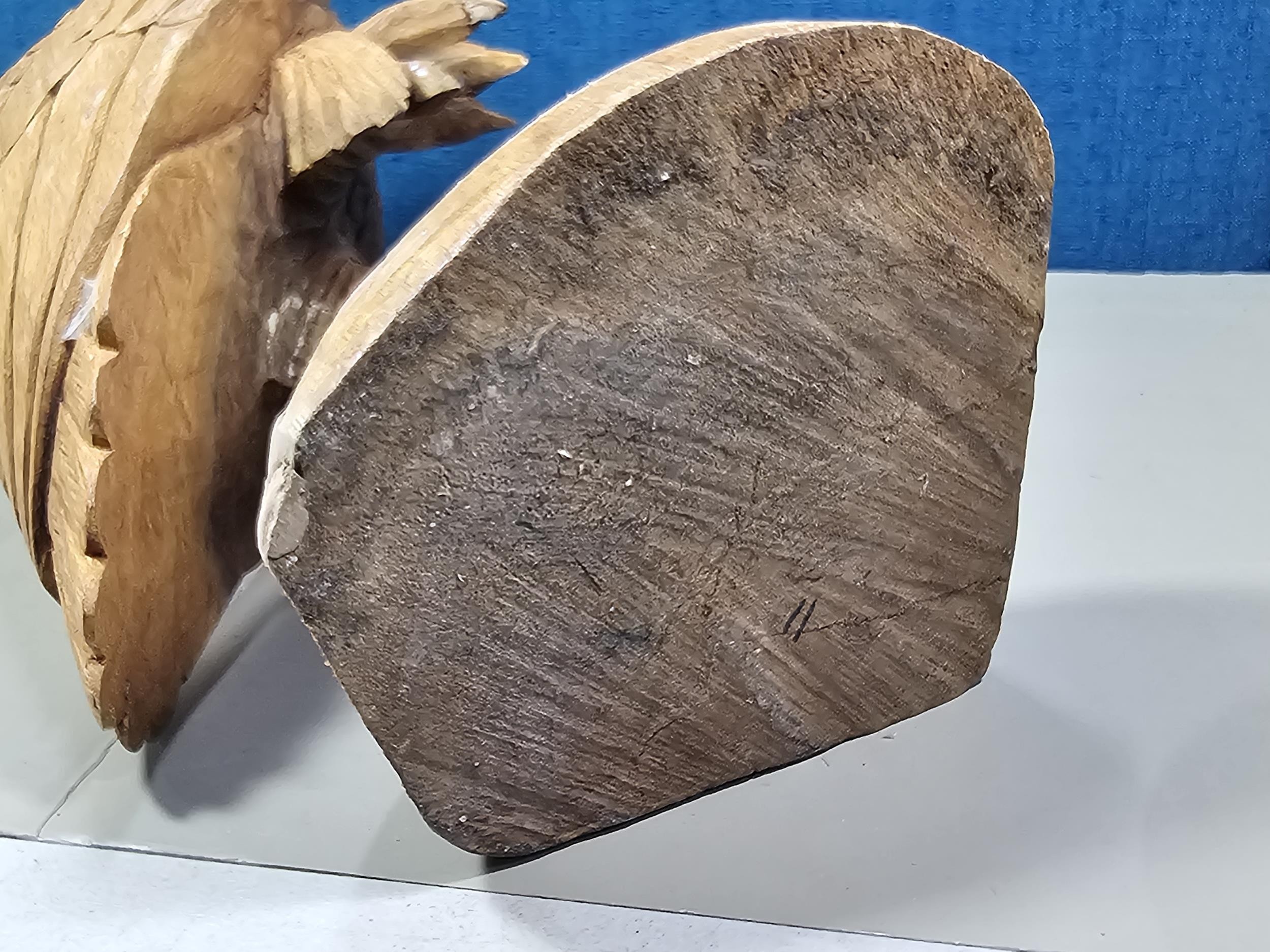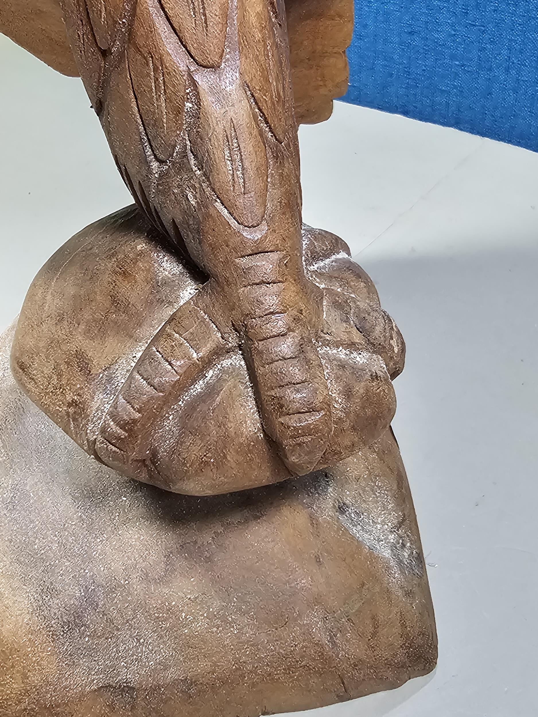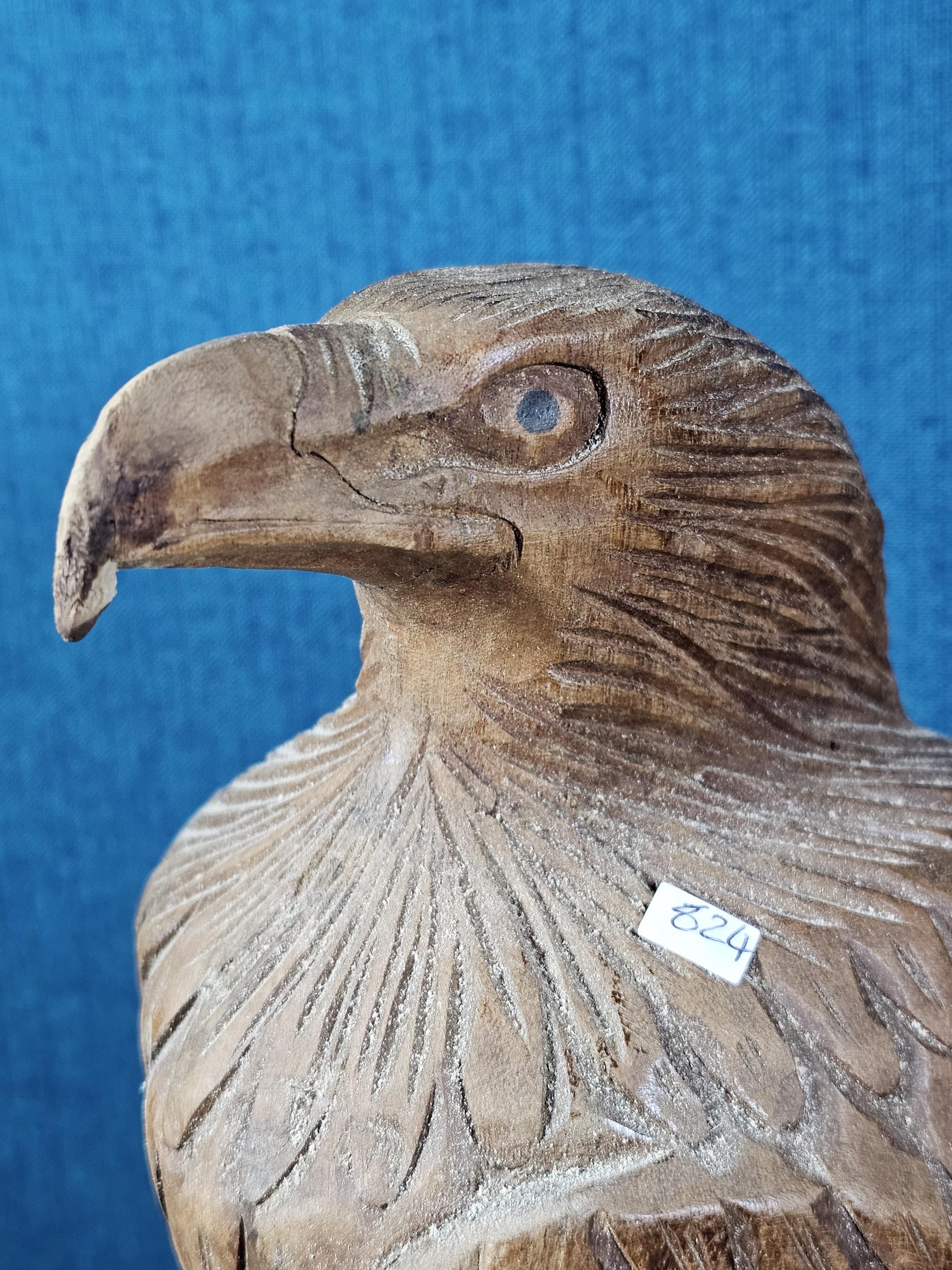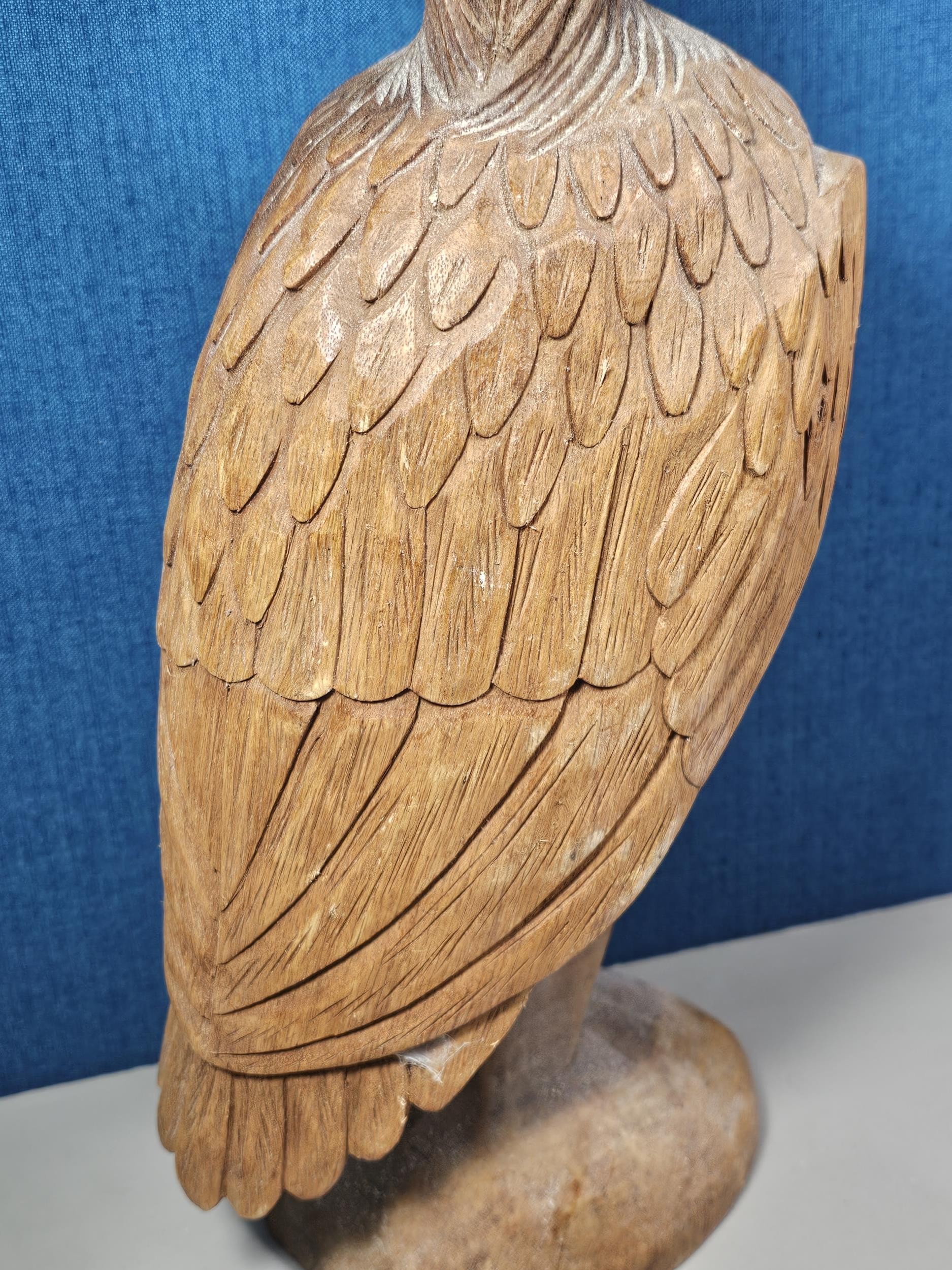 A good quality hand carved solid wood eagle figure standing on a plinth, in very good detail. Has a height of 43cm, a length of 20cm and a depth of 14cm.