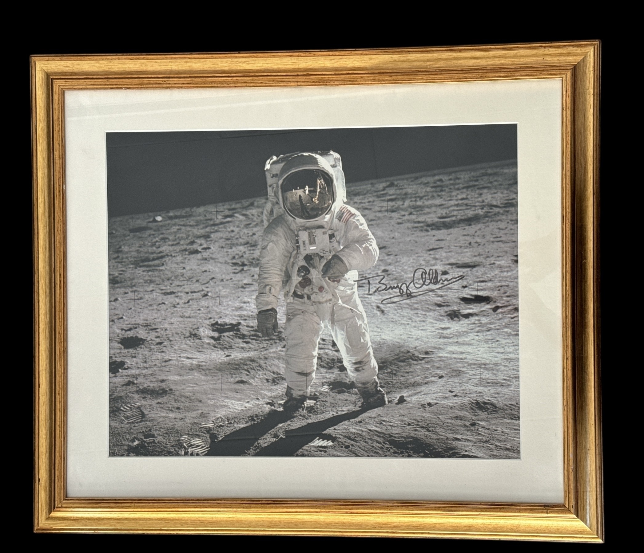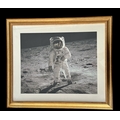 Buzz Aldrin astronaut signed colour photo of Buzz on the Moon. Mounted and framed, measures 24x26 inch appx.