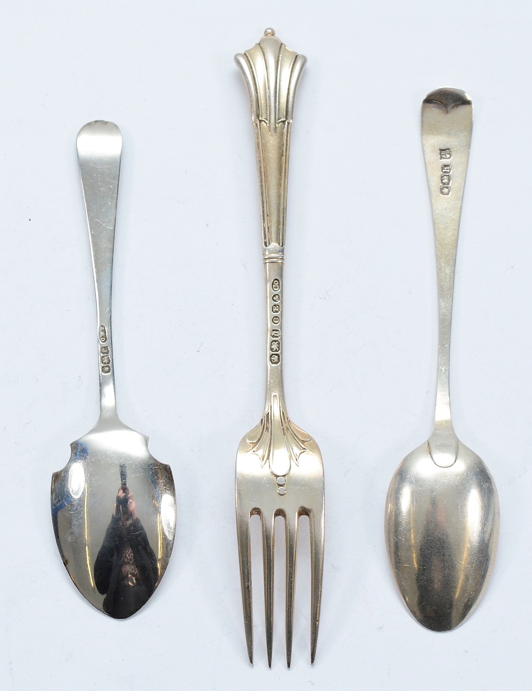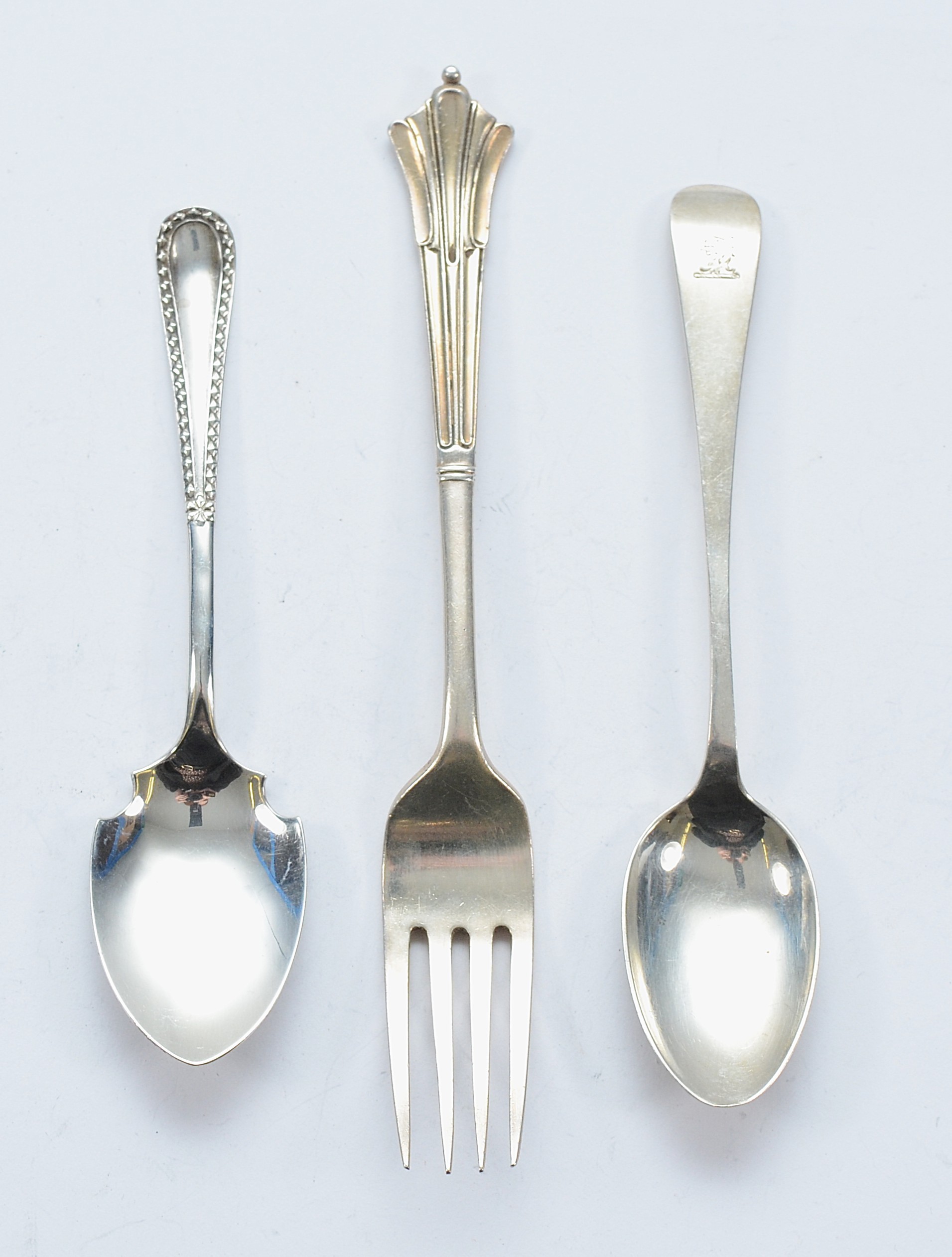 A Victorian silver Albany pattern fork, Sheffield 1896, 15cm, together with a silver bead pattern preserve spoon, Sheffield 1923, and a silver teaspoon, Sheffield 1925, 57gm.