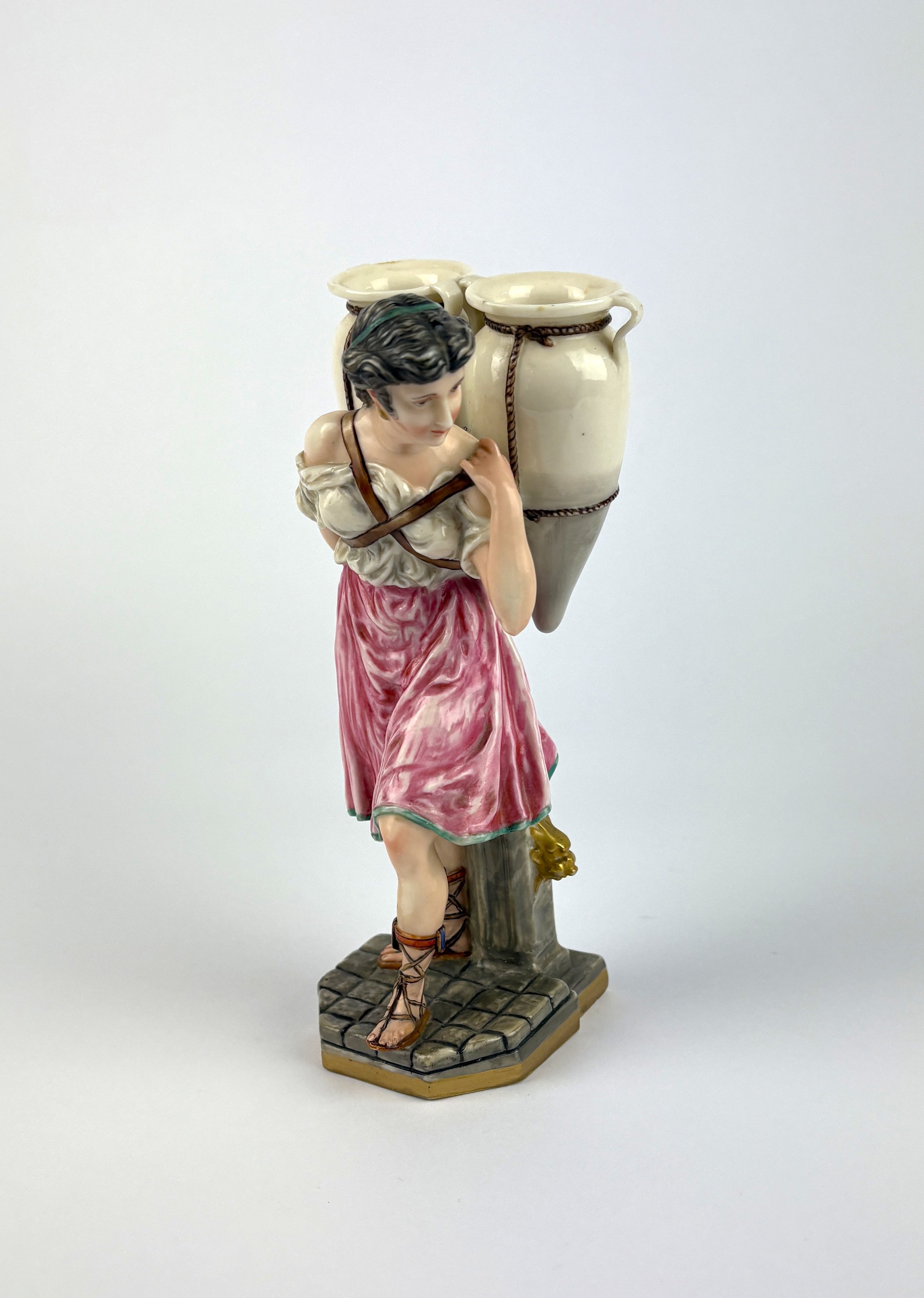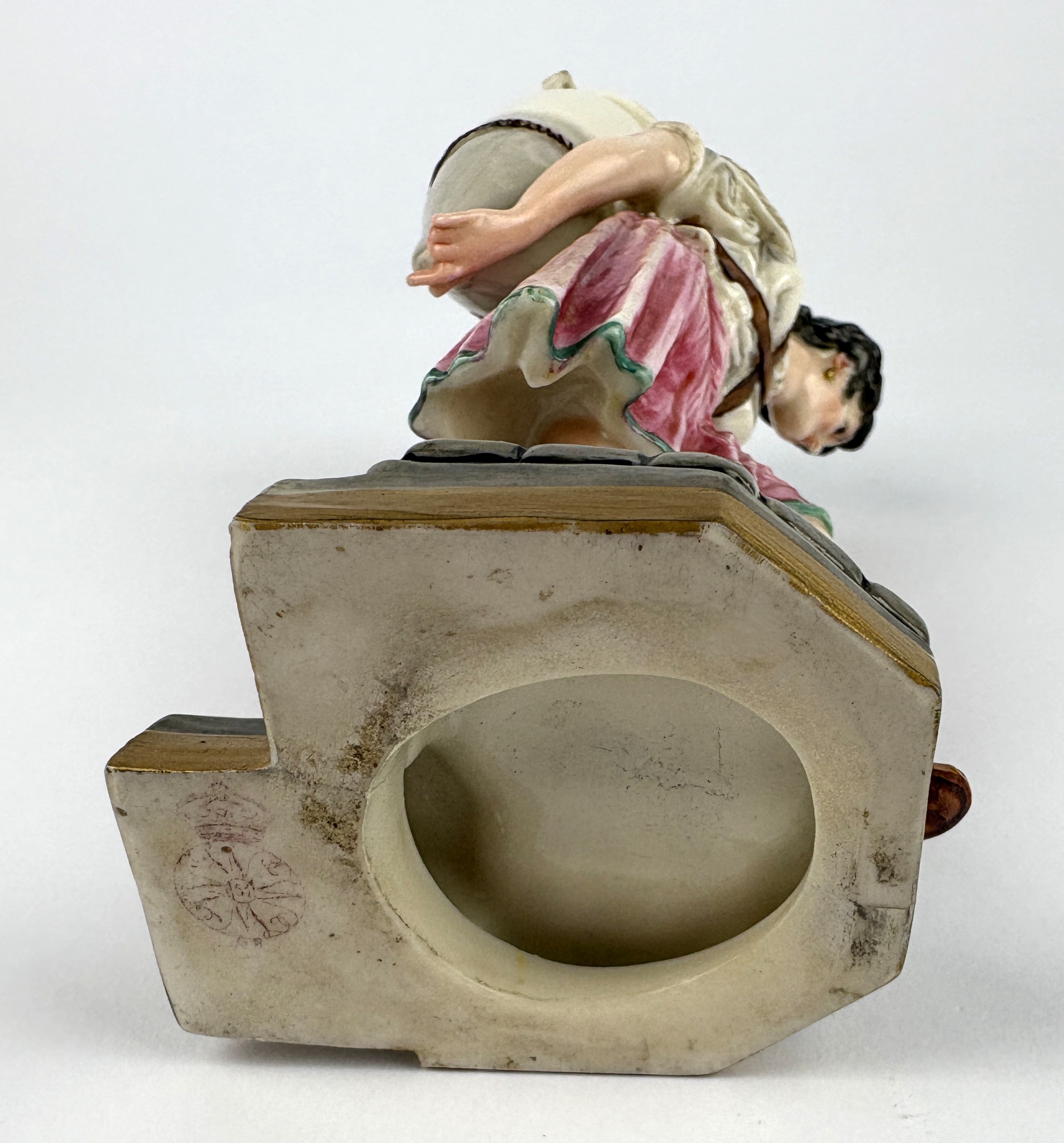 A 19th century Worcester porcelain figure of an ancient female water carrier, factory mark underside, dated 1868, 19cm high, (af - restored).