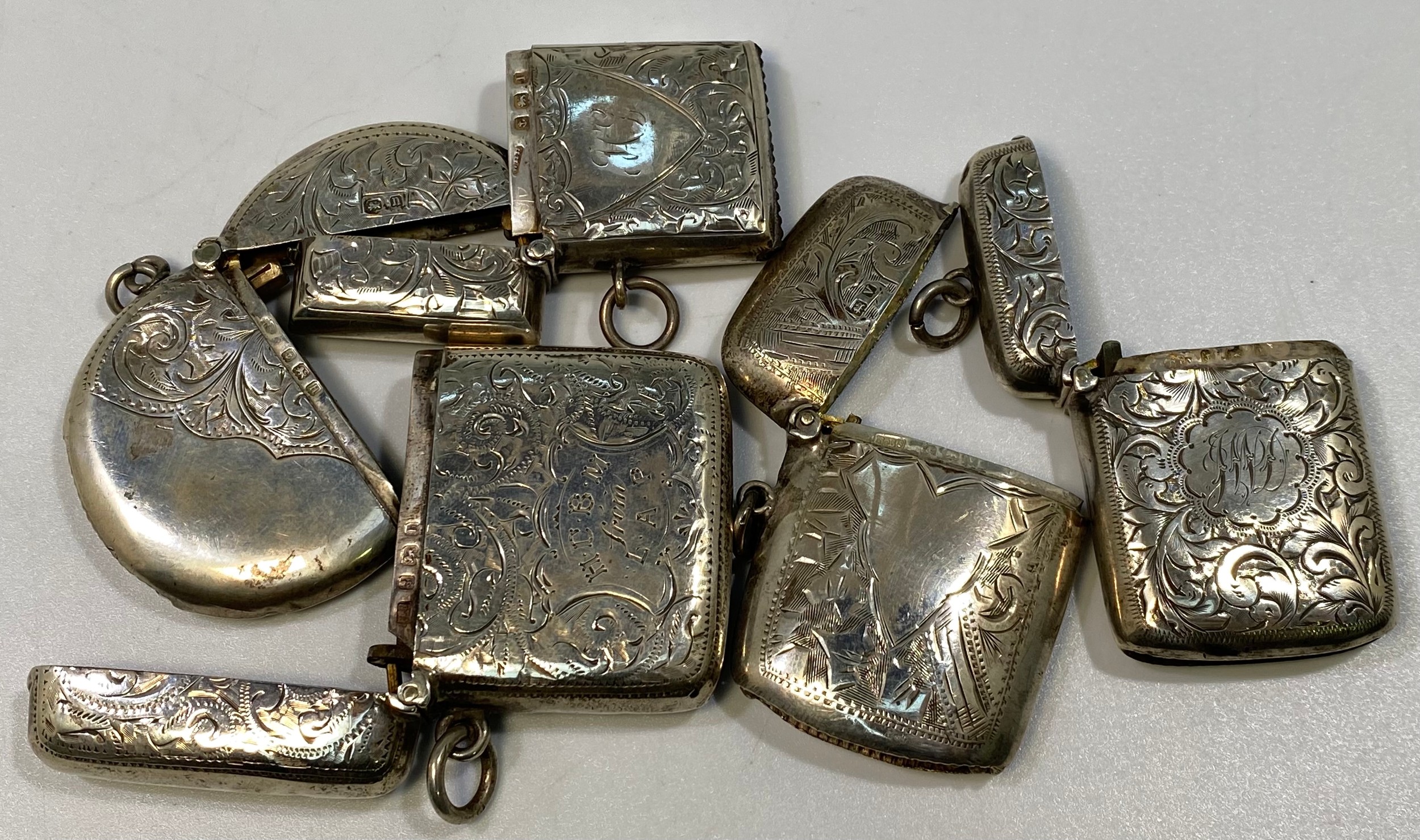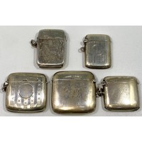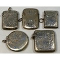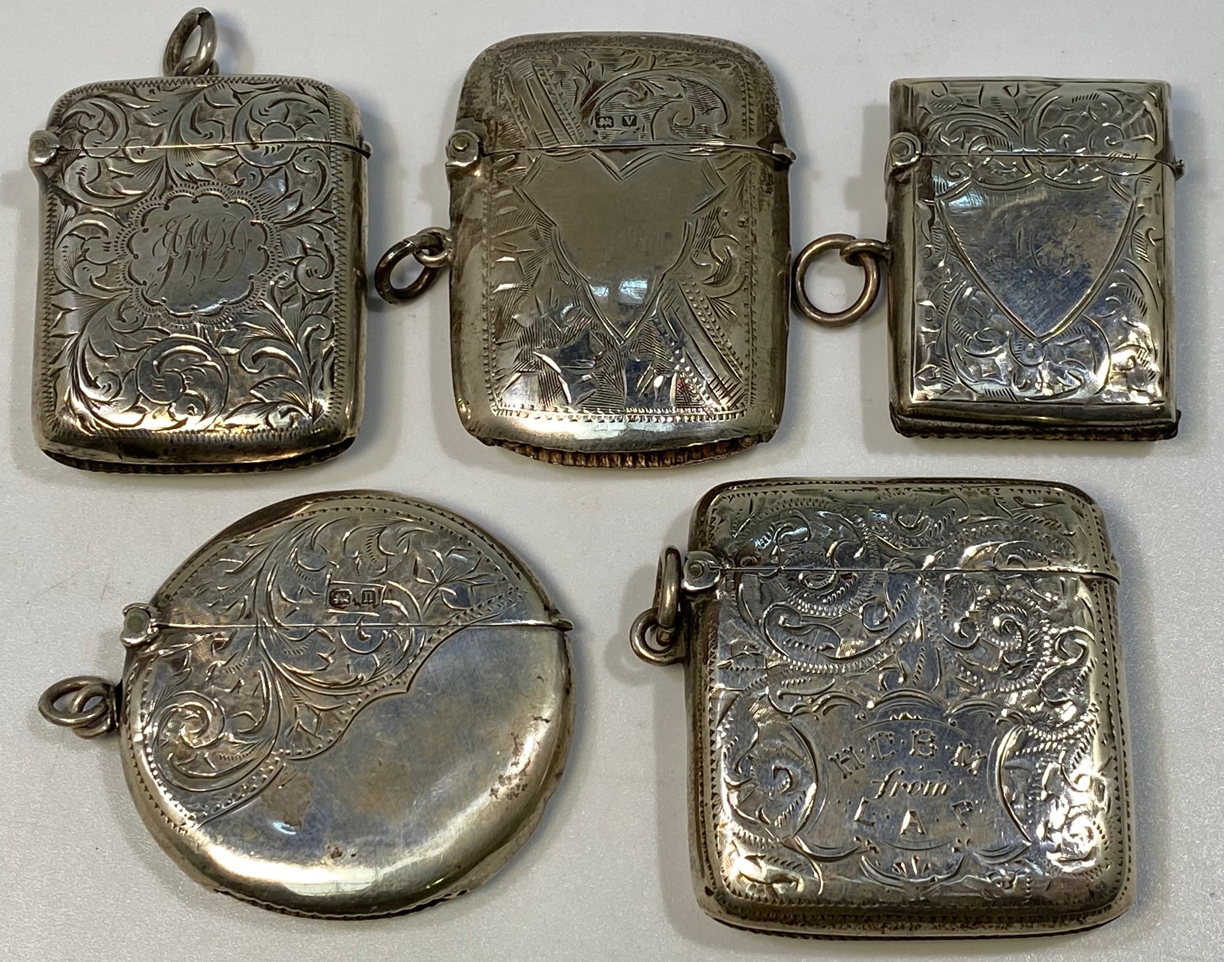 Five various silver vesta cases including a circular example with half the body engraved with flowers and foliage, Birmingham, 1912, makers probably T Heatley, Gross weight 2.88 ozt