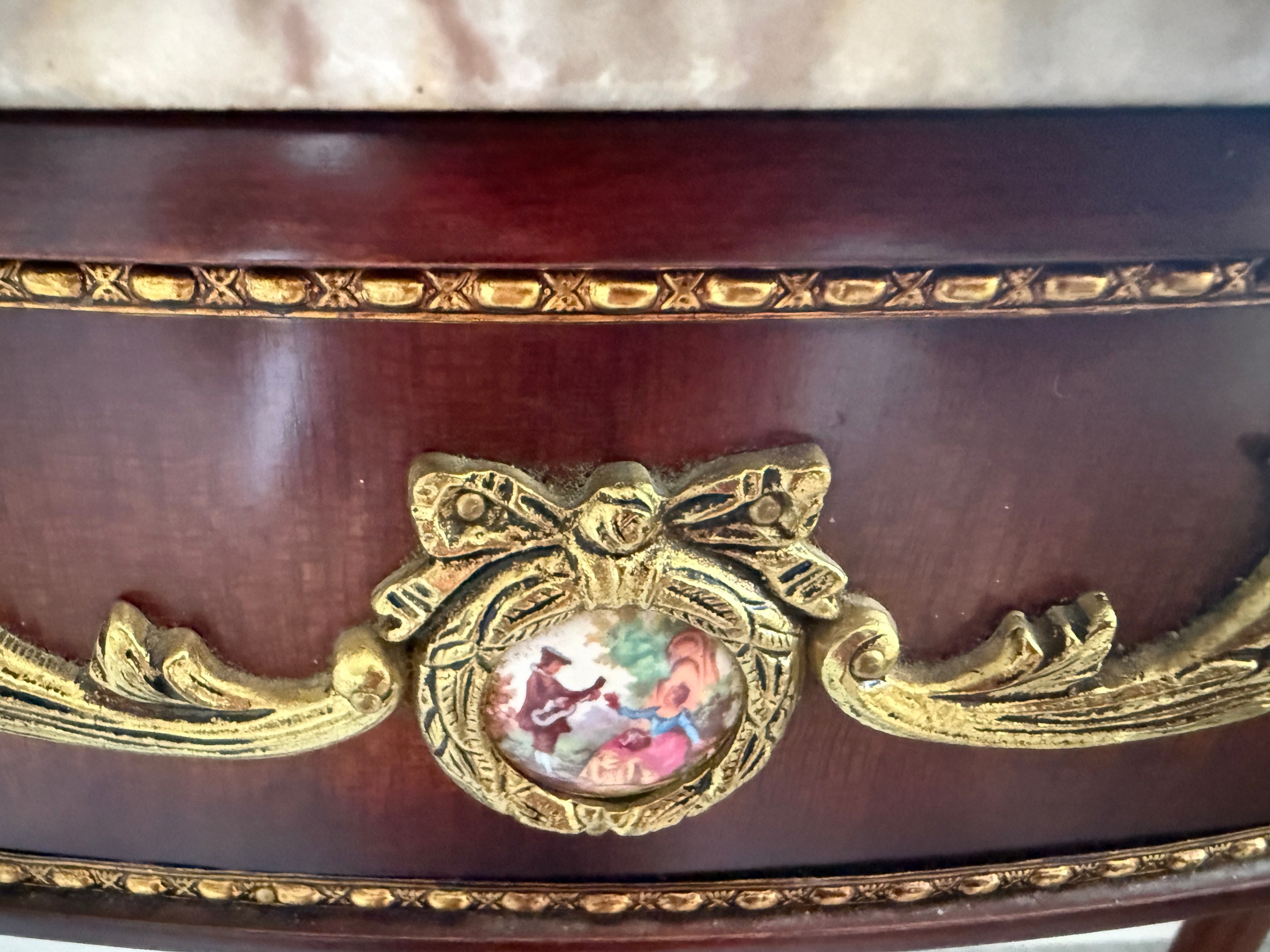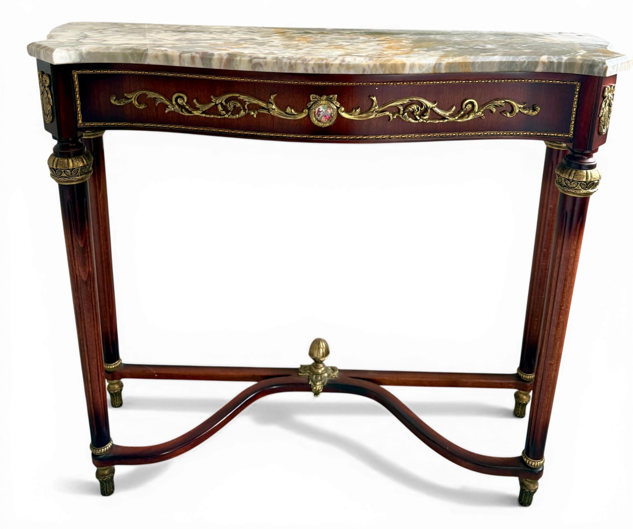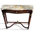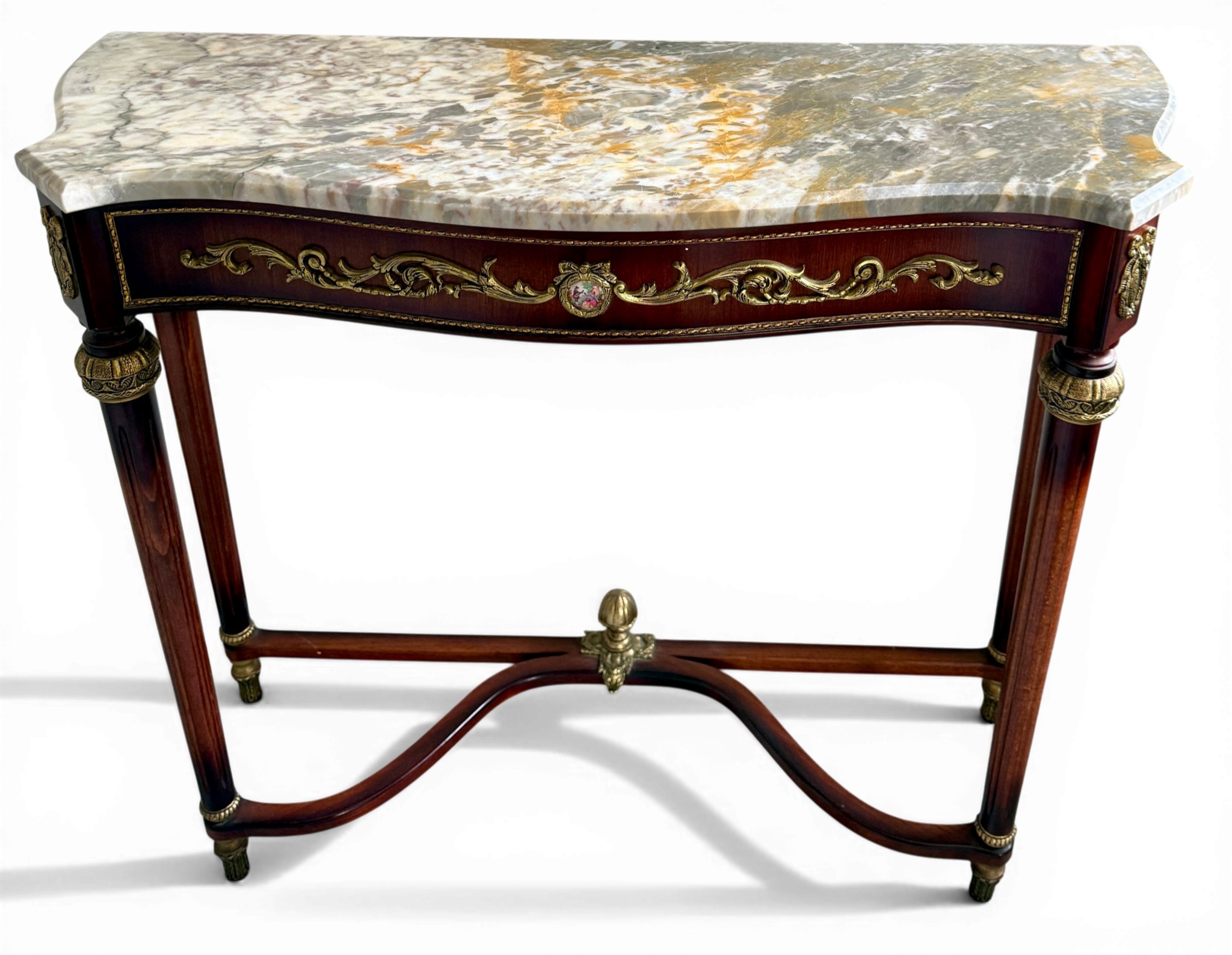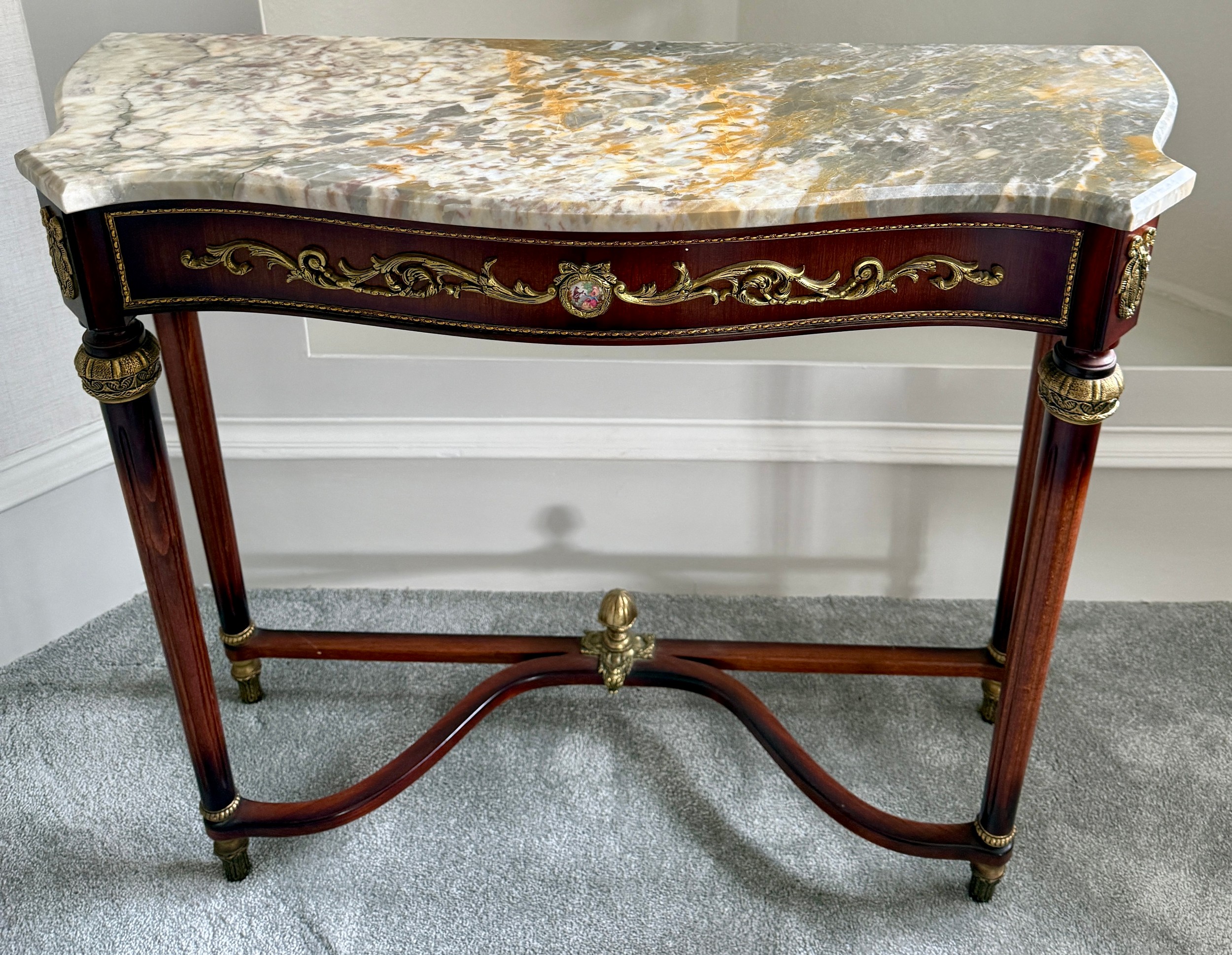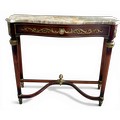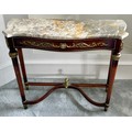 A 20thC marble topped mahogany console table with gilt metal and porcelain mounts. 89 w x 31 d x 76cm h.