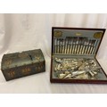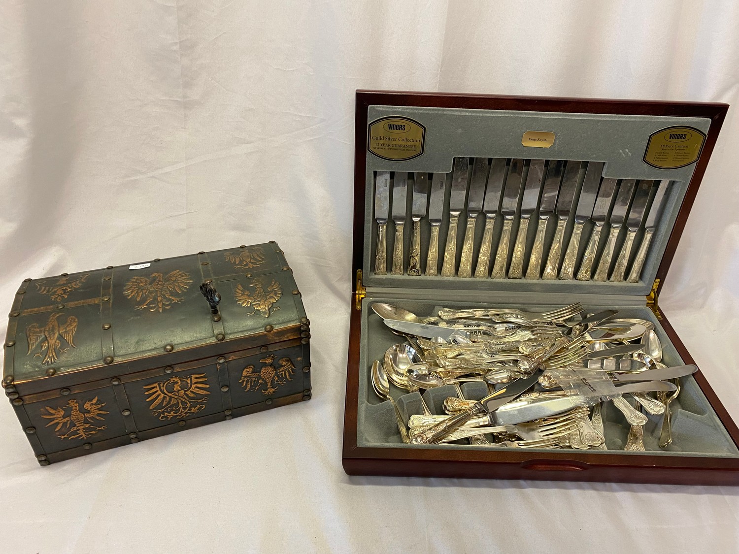 A Viners canteen of Kings pattern plated flatware and a decorative wooden box with dome shaped lid