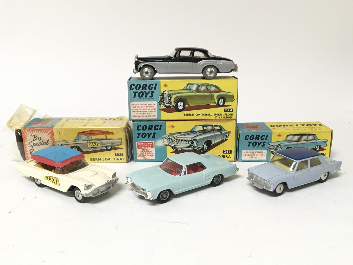 Corgi toys, #245 Buick Riviera, #430 Bermuda taxi, #217 Fiat 1800 and #224 Bentley Continental sports saloon, boxed