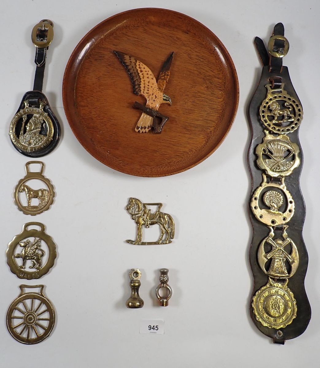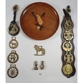 Various horse brasses and a wooden tray with bird