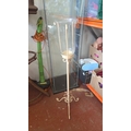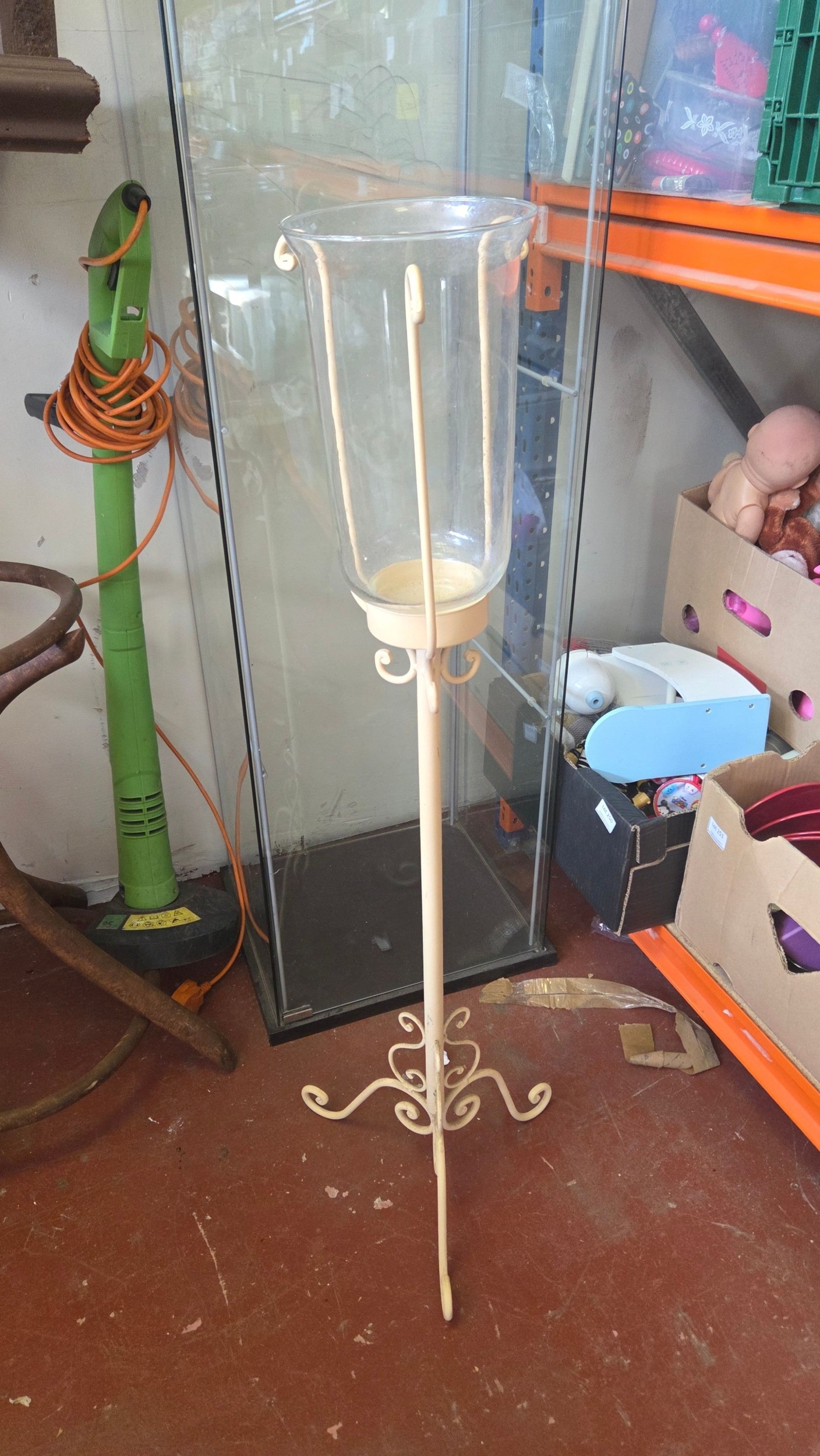 A cream-painted metal floor-standing hurricane lantern