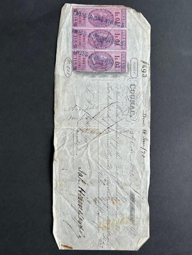 Banknotes - 1869 First of Exchange for Cognac signed for Hennessy & Co for £249-6-11 with 3 x 1/- Foreign Bill stamps. (1) (S)