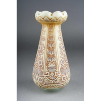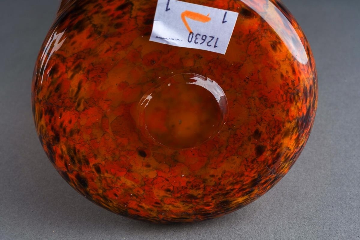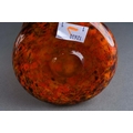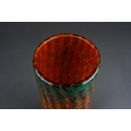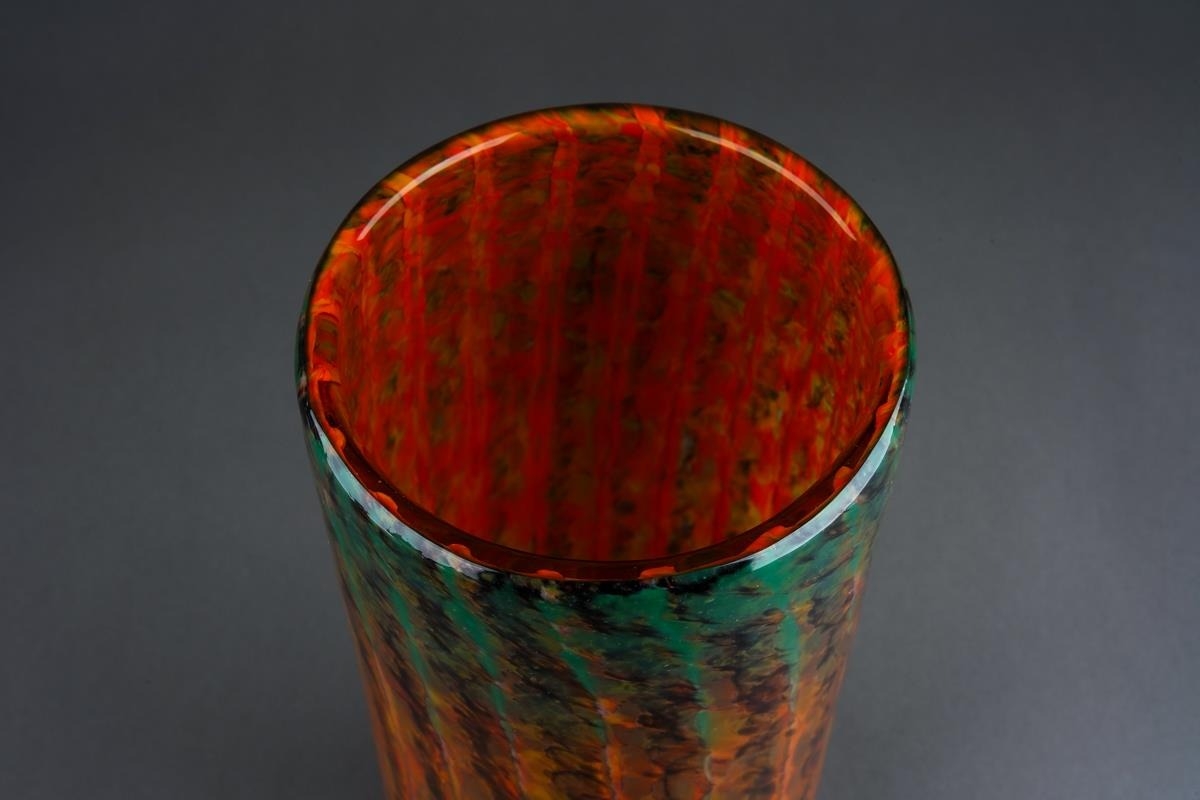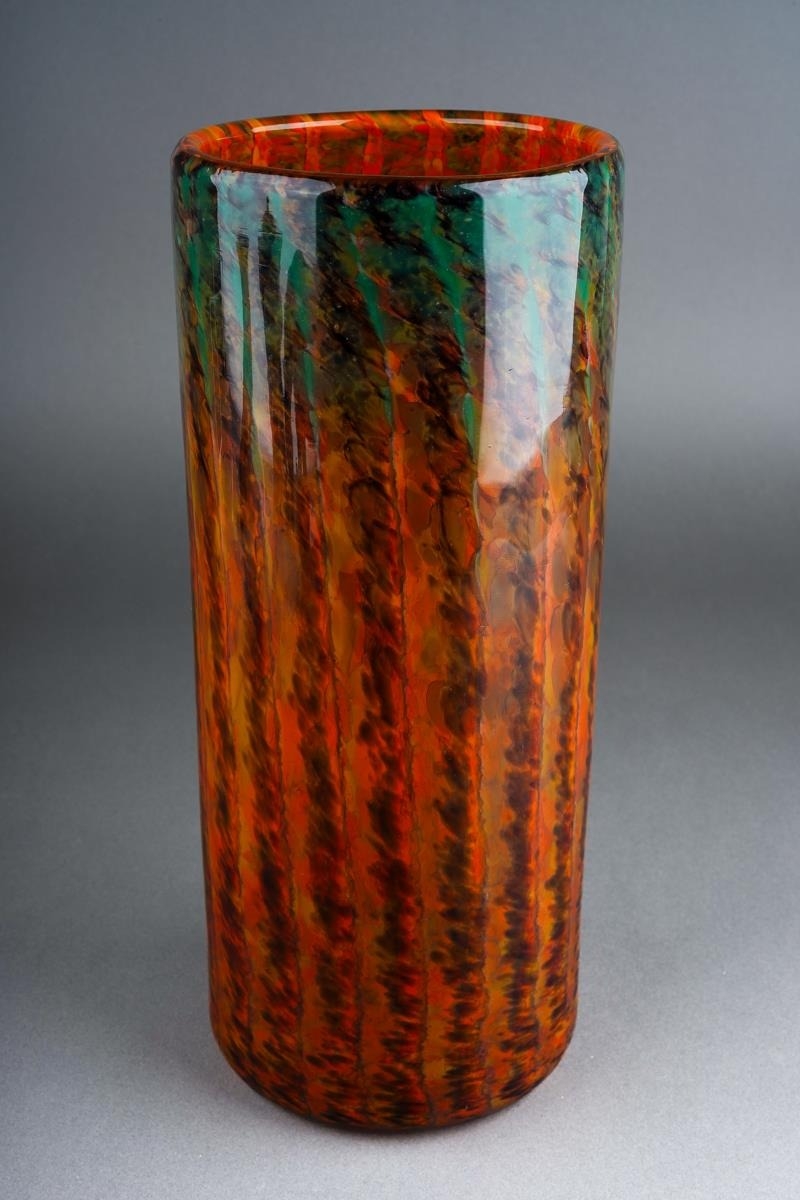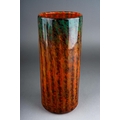A Monart cylindrical glass vase, circa 1924-1939, mottled green, orange and brown vertical bands, ground pontil, unmarked, height 25cm