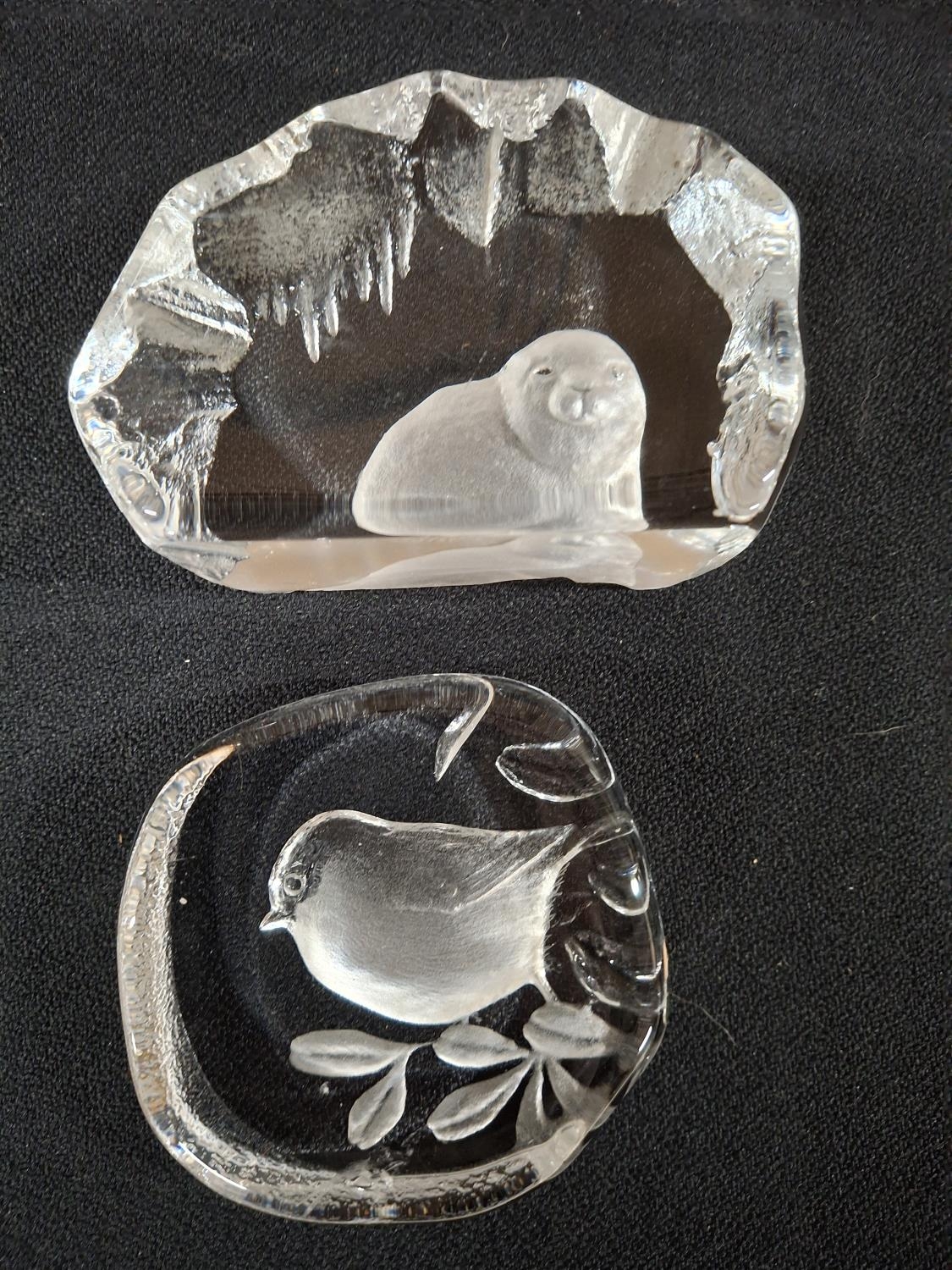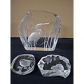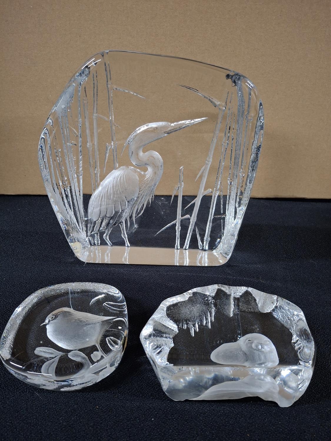 Three various Mats Jonasson signed bird, Seal and large wading bird paper weights (3)