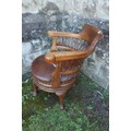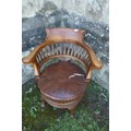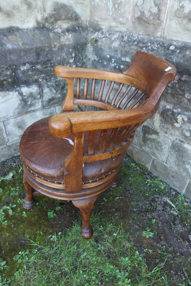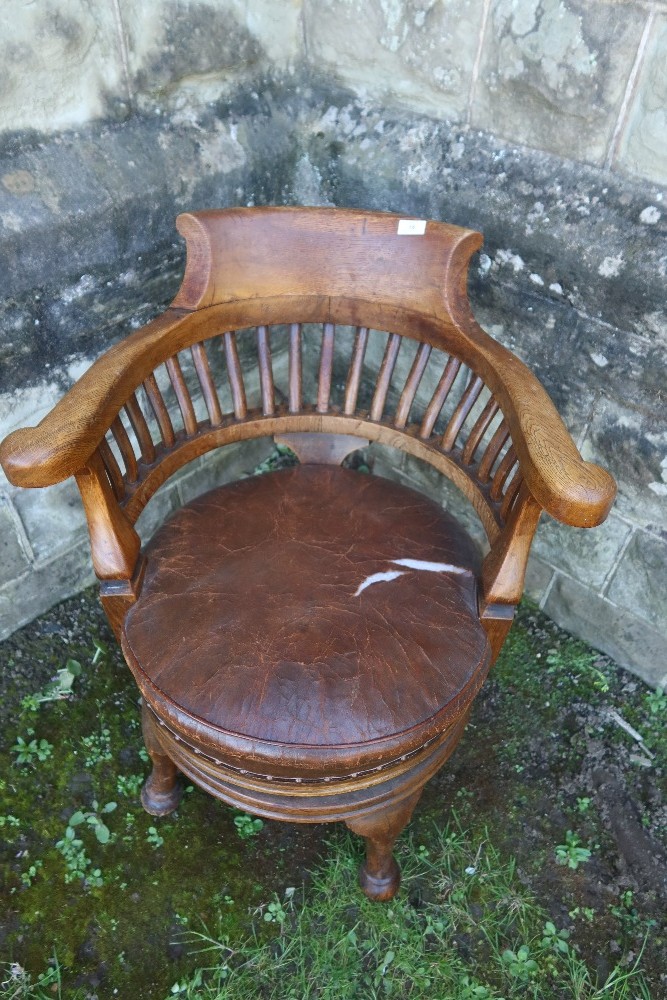 An oak office chair, with leather seat