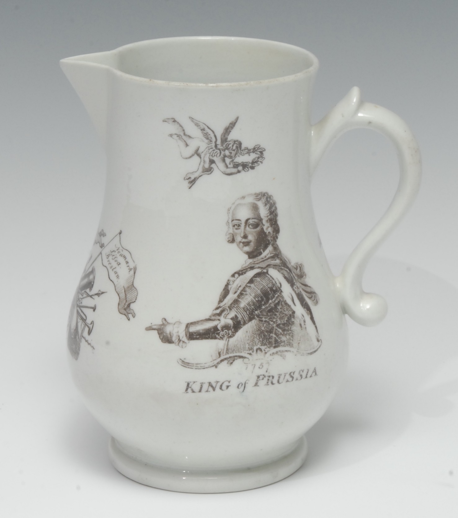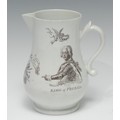 A Worcester King of Prussia bulbous jug, printed in monochrome with an engraving after Robert Hancock, with half-length portrait of the King of Prussia, above Cupid with laurel wreath, trophy of arms, of drums, pikes, muskets, cannon and Fame, blowing a trumpet and three flags, inscribed with the Kings nine battle victories, marked R .H. Worcester and Josiah Holdship Anchor Rebus, 14cm high, c.1760