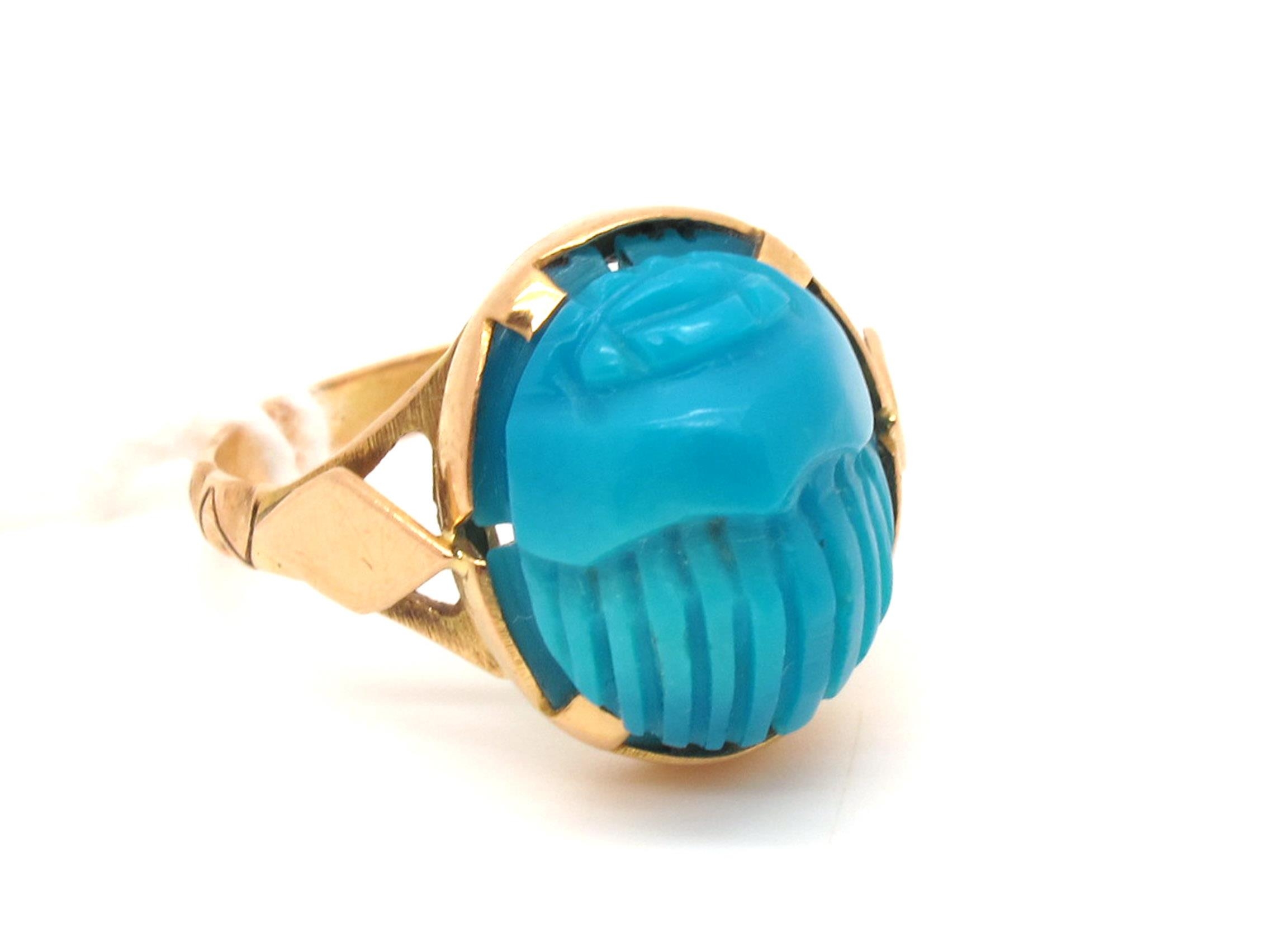 An Egyptian Scarab Beetle Design Dress Ring, oval set between textured shoulders (stamped marks) (finger size P).