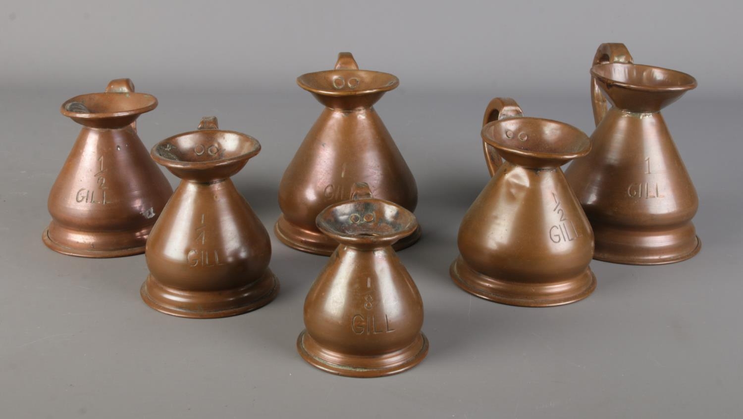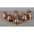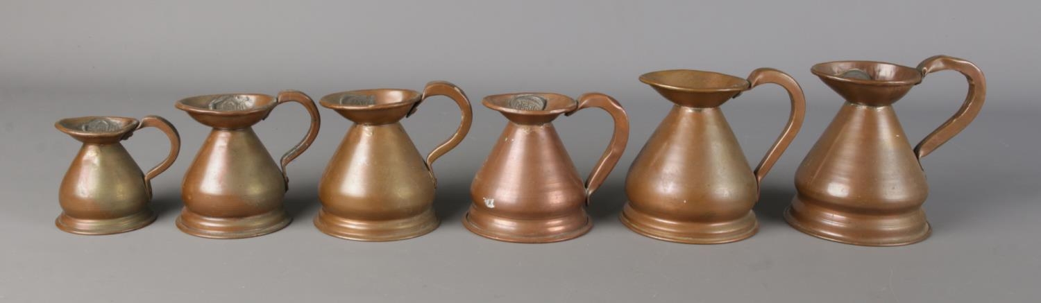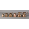 A set of six graduated copper measuring jugs.