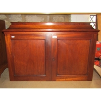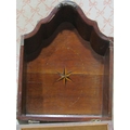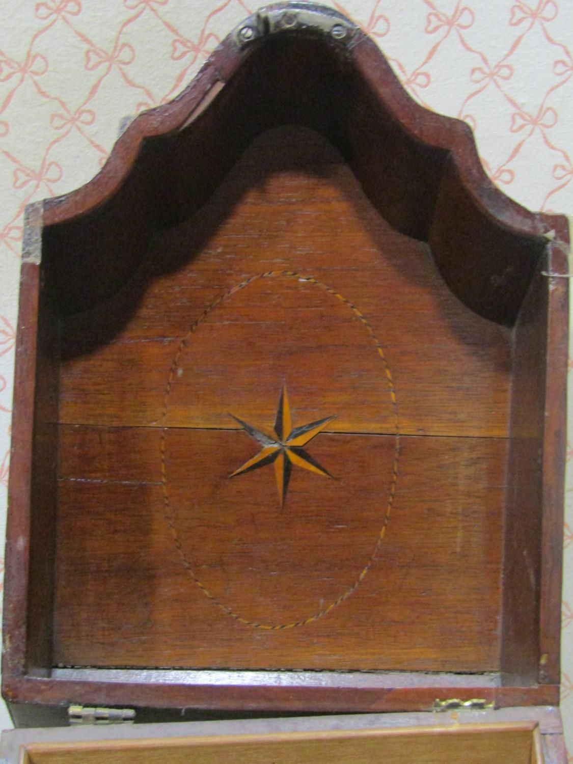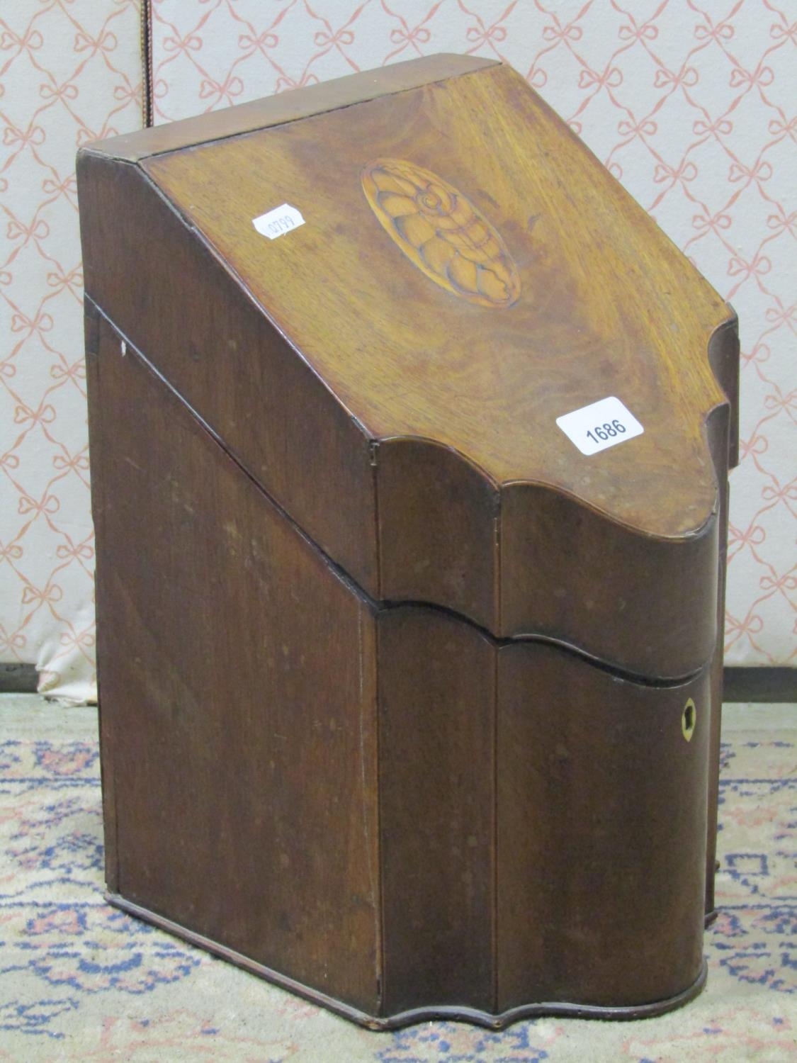 A Georgian mahogany oval shell inlaid stationery or possible ex knife box, with segmented interior and serpentine shaped front, together with a small mahogany tray with shaped outline (2)