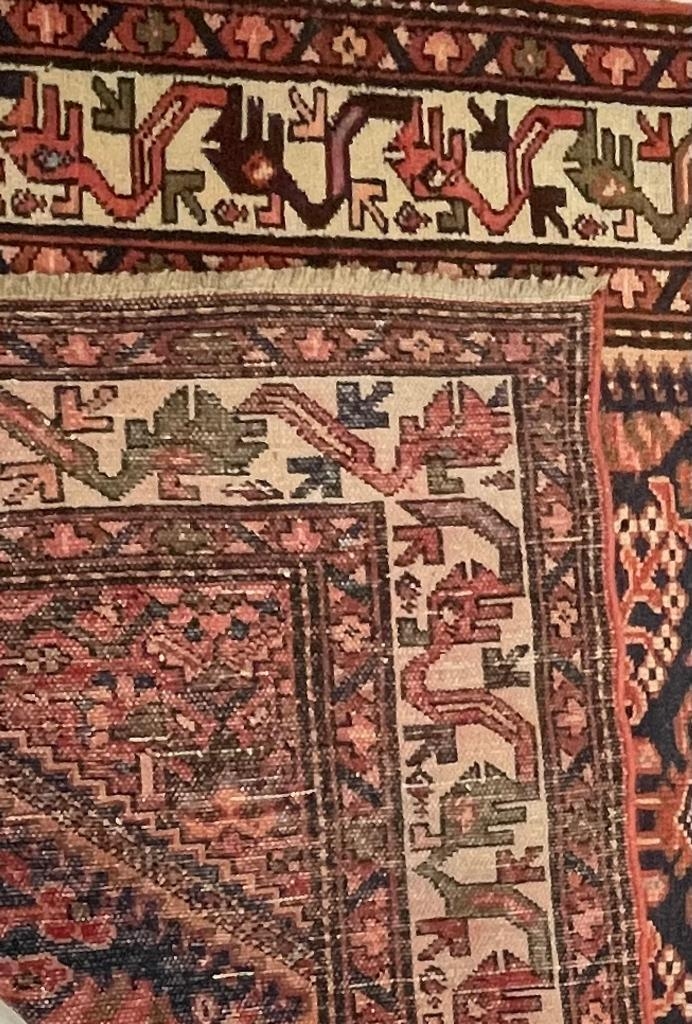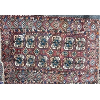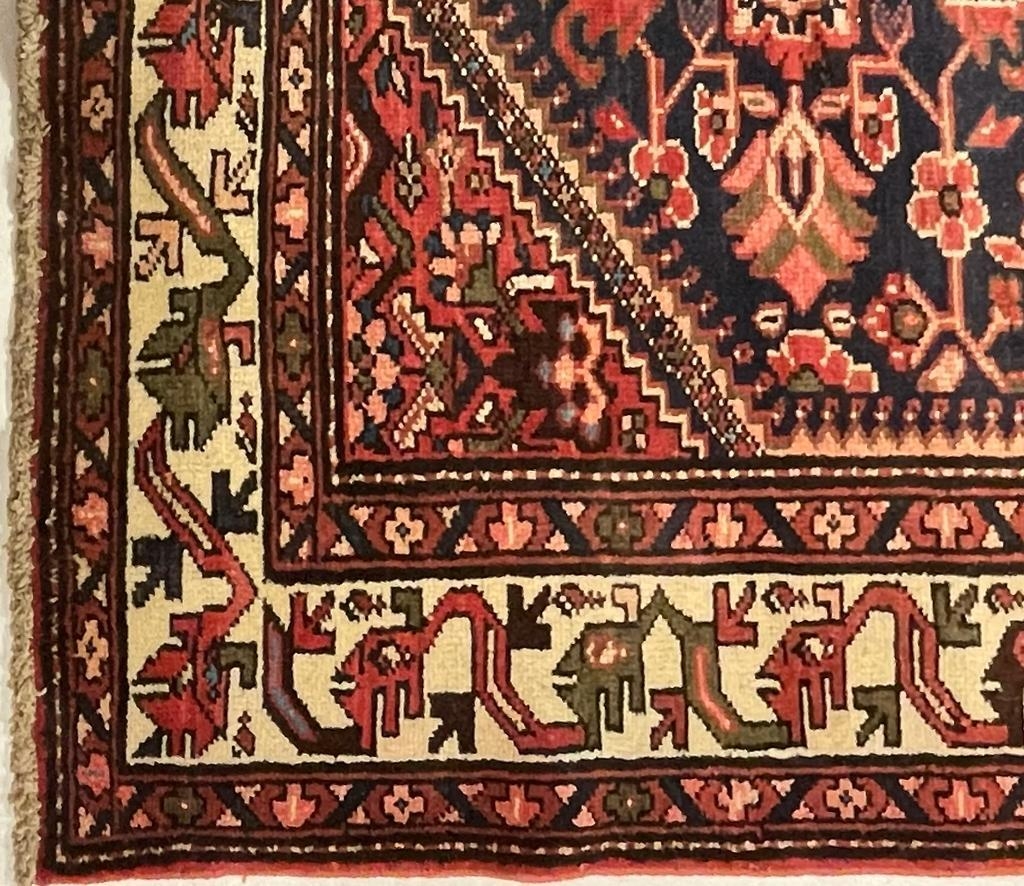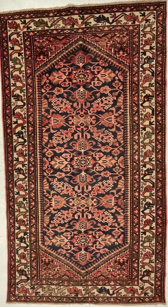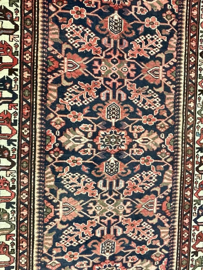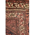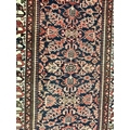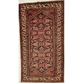 A 20th century North West Persian Islamic Malayer floor rug carpet having a central panel decorated with foliate shaped patterns encapsulated with a series of outer borders. With tassels to ends. Measures approx. 290 x 150cm.