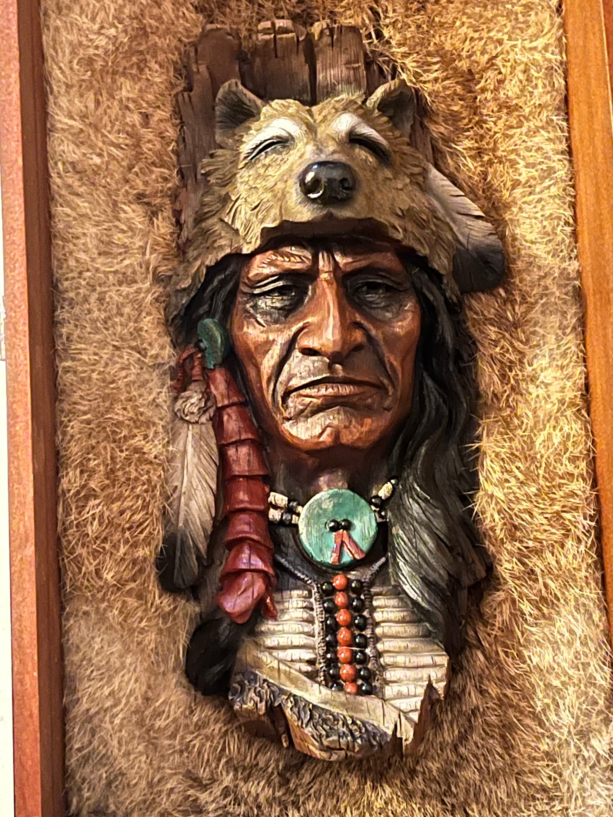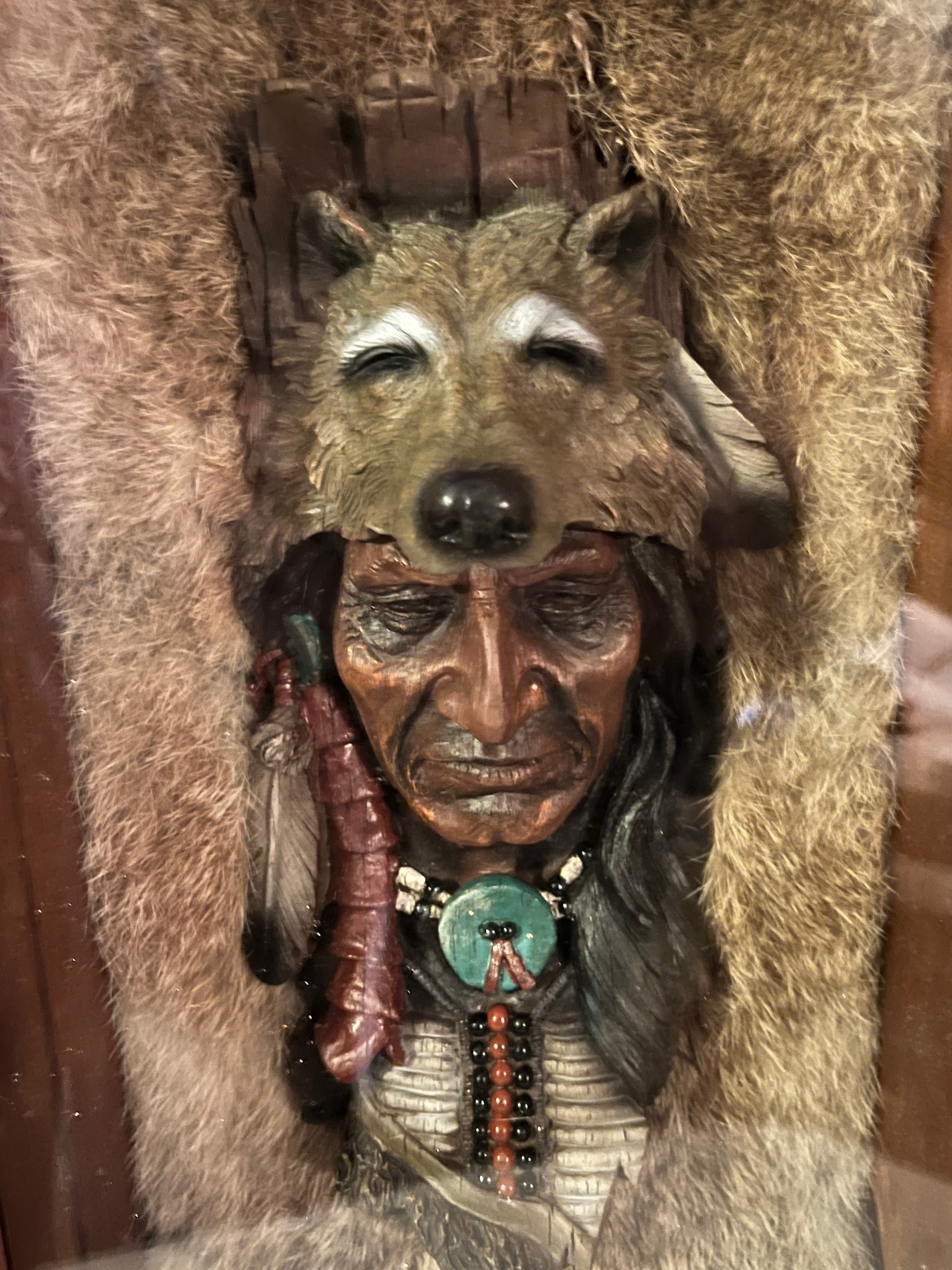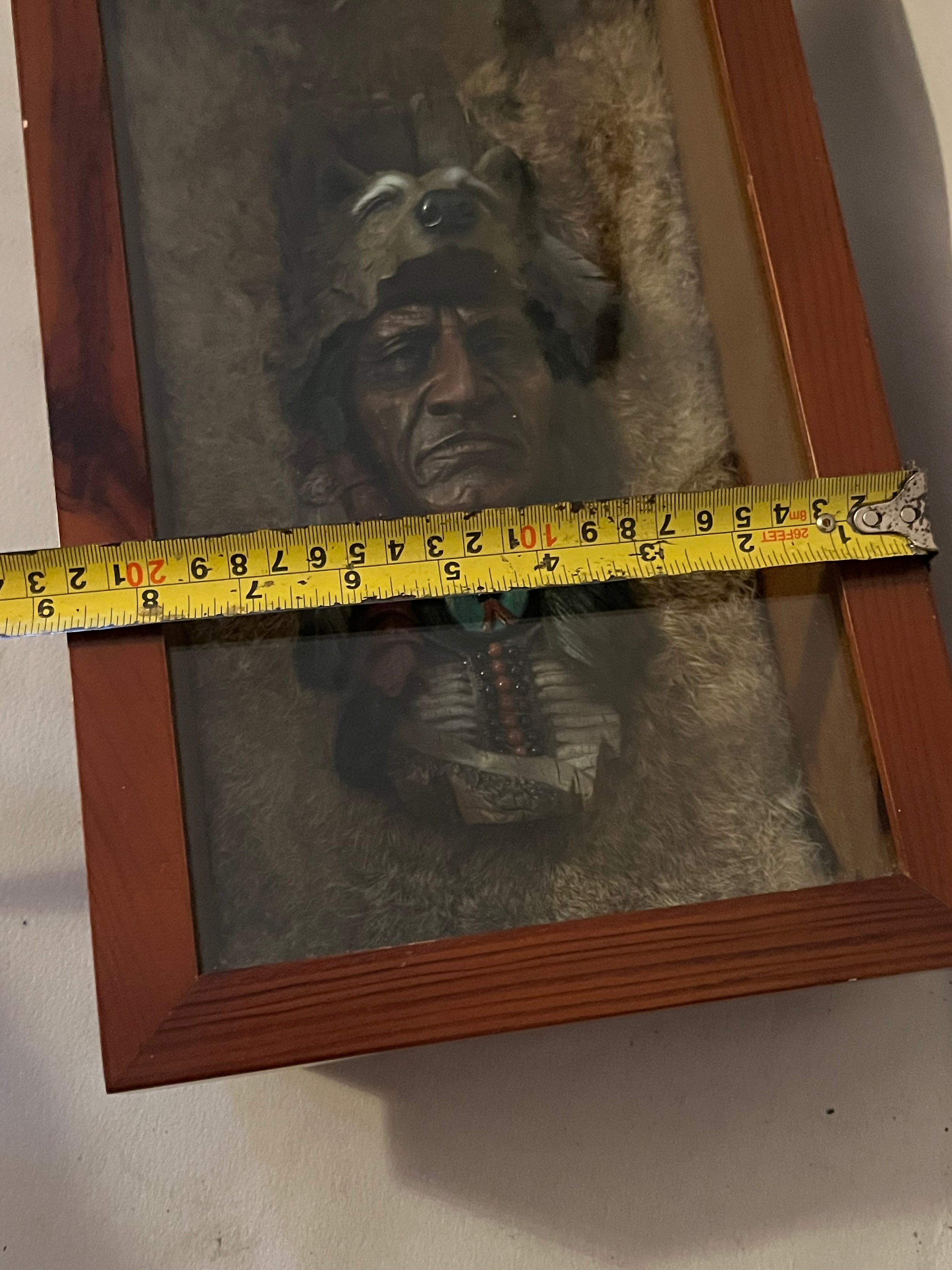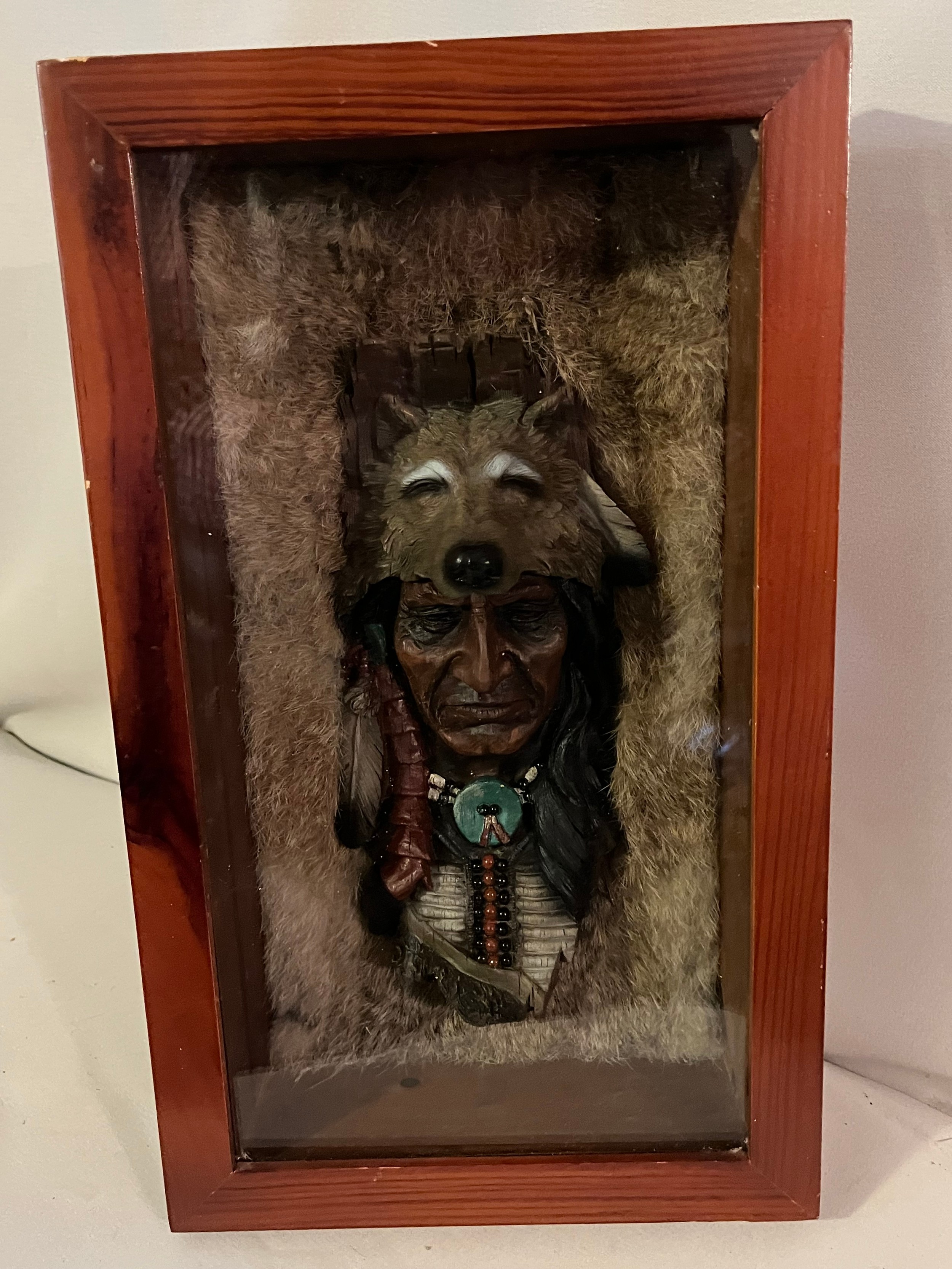 Resin bust of a Red Indian chief set in rabbit fur framed and glazed
