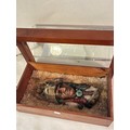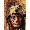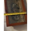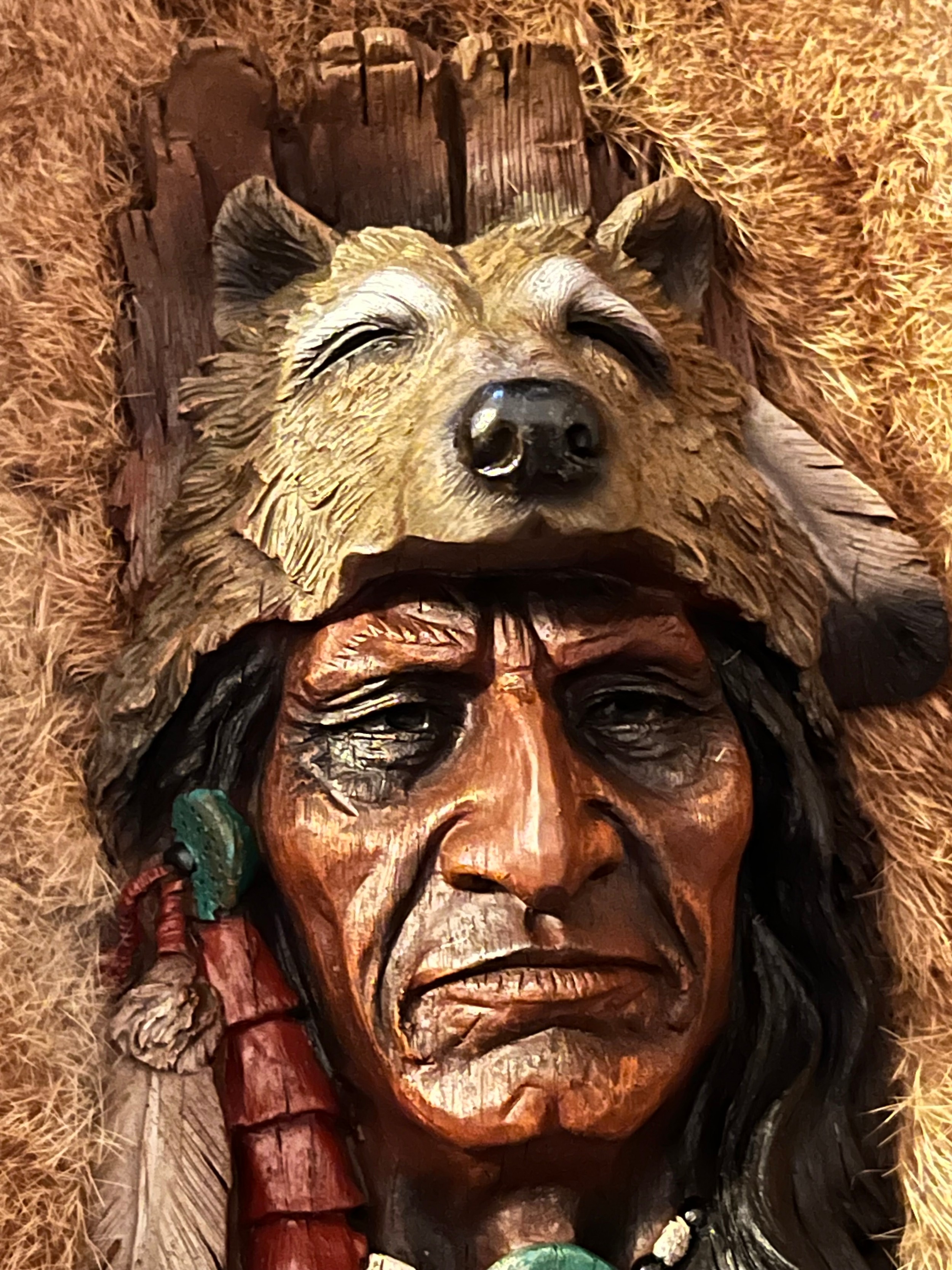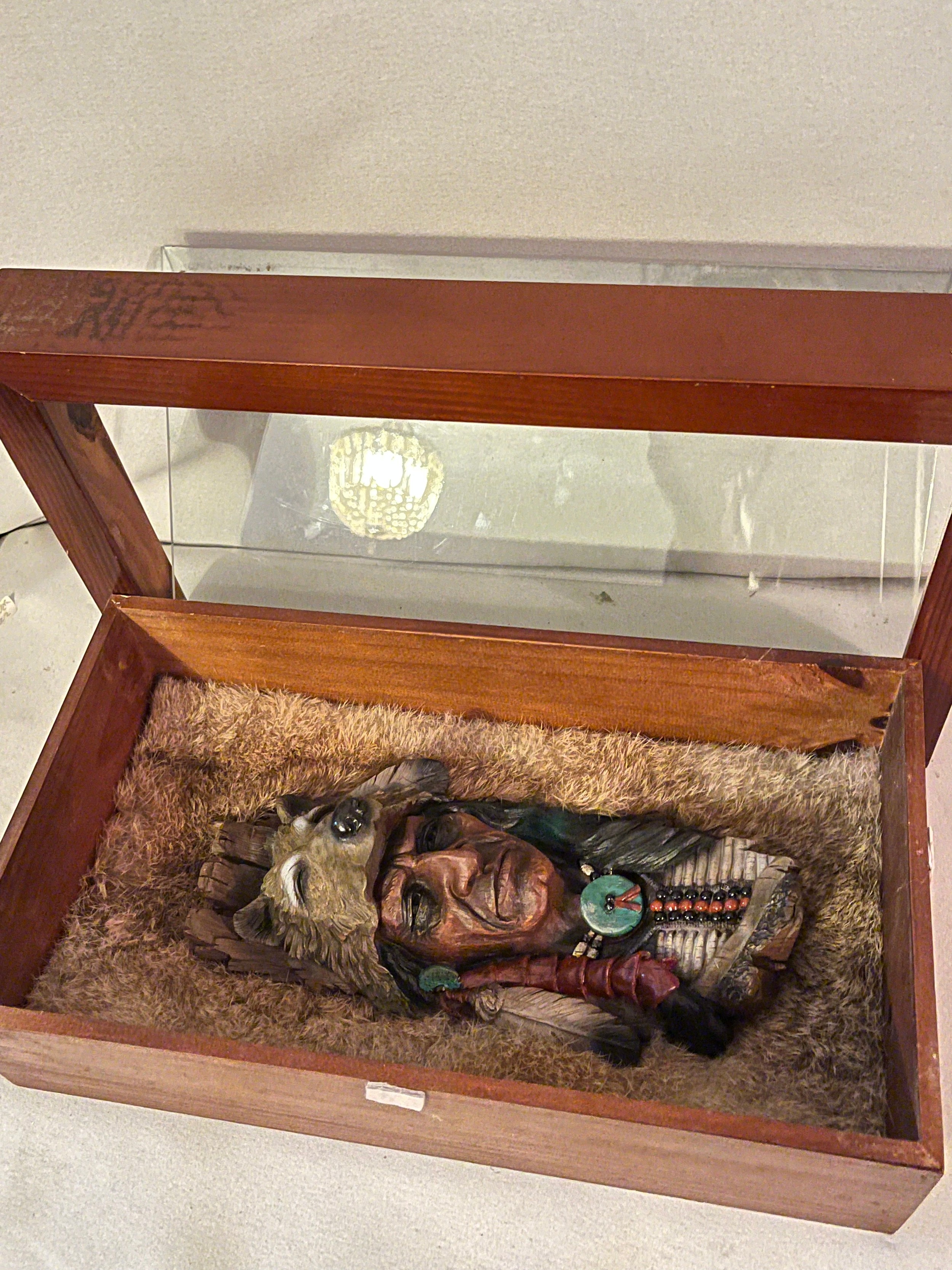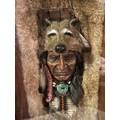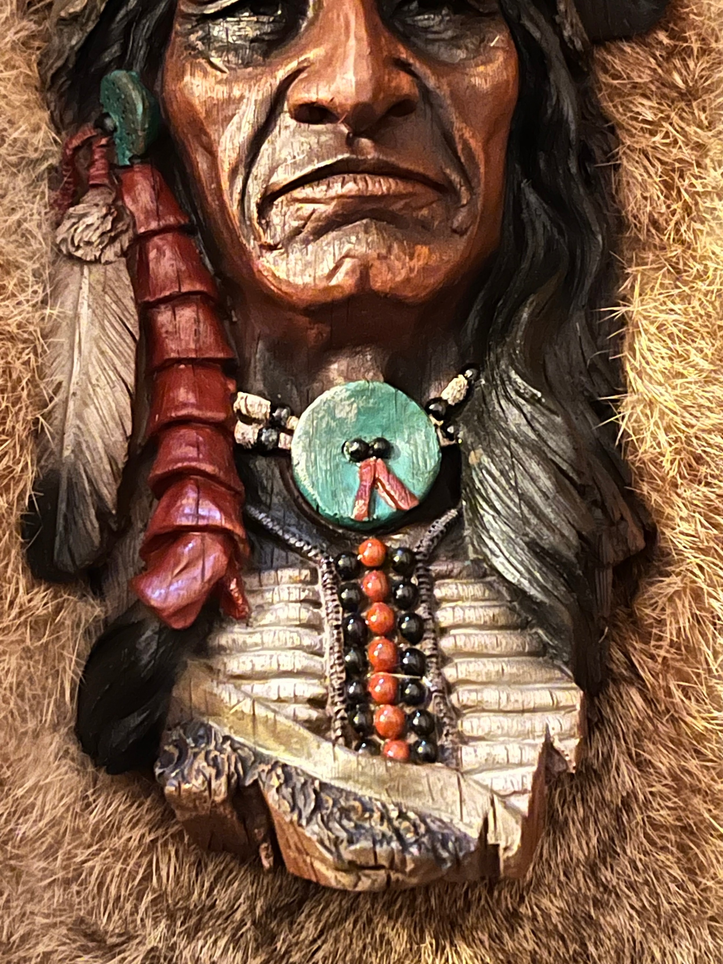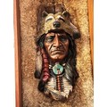 Resin bust of a Red Indian chief set in rabbit fur framed and glazed