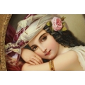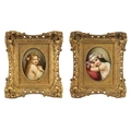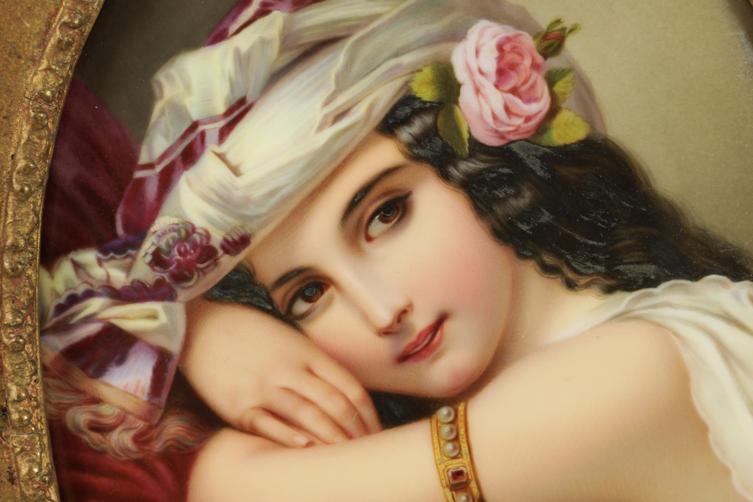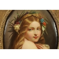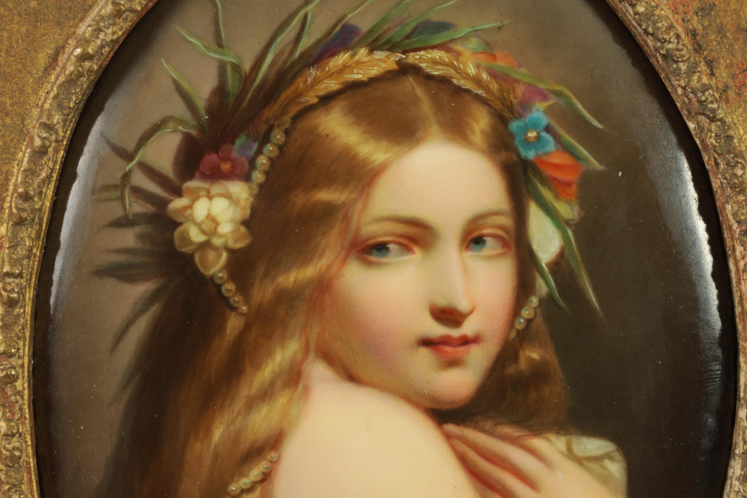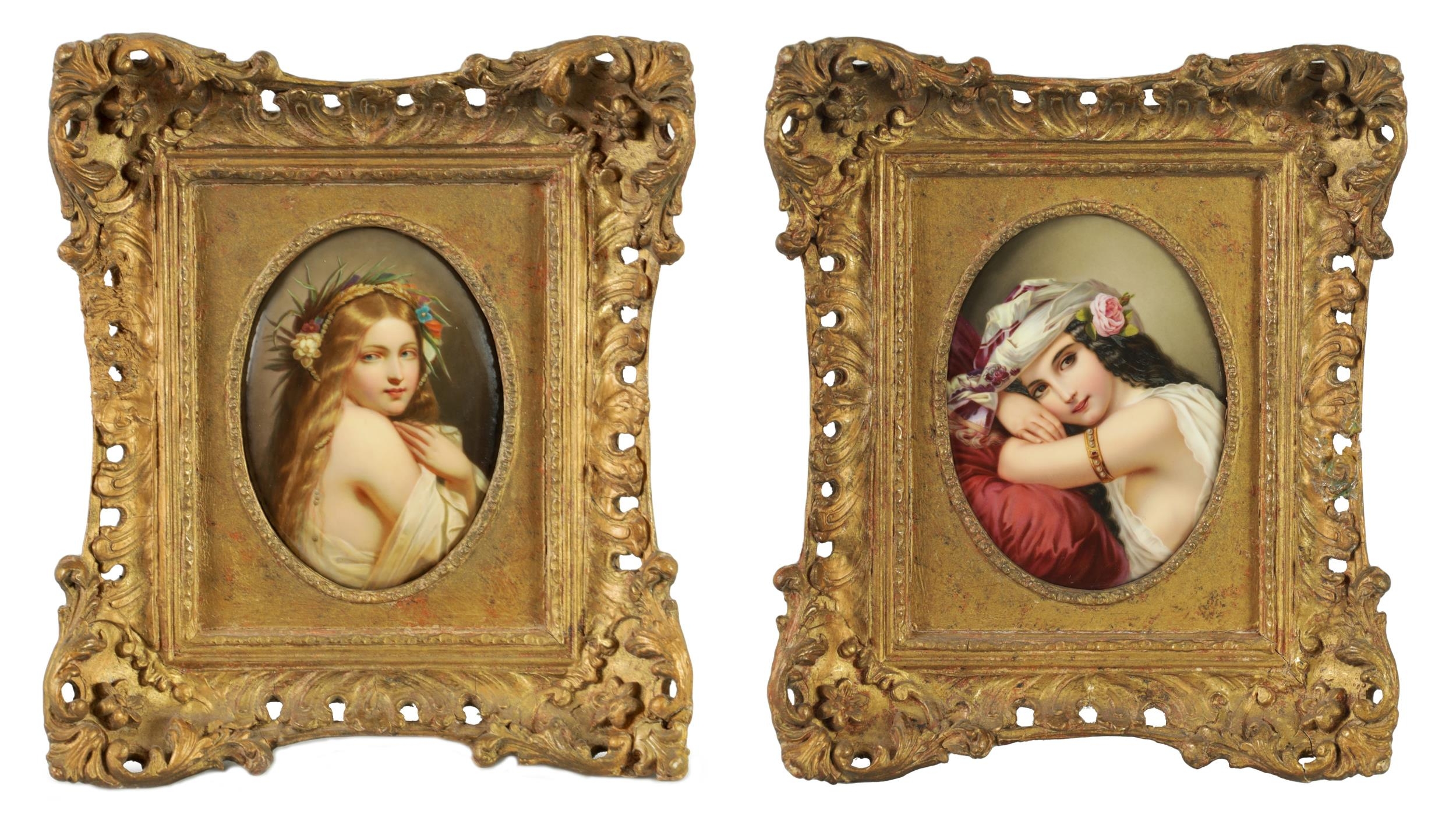 A FINE MATCHED PAIR OF LATE 19TH CENTURY VIENNA OVAL CONVEX FRAMED PORCELAIN PLAQUES each depicting half-length side portraits of young ladies wearing elaborate headdress - gilt mounts and pierced swept frames with leaf work corners (17.5cm high by 12.5cm & 18.5cm by 14cm)