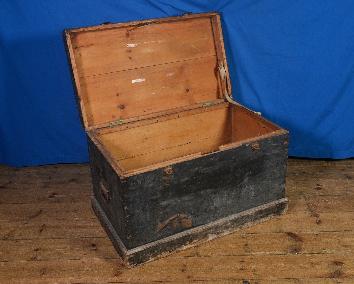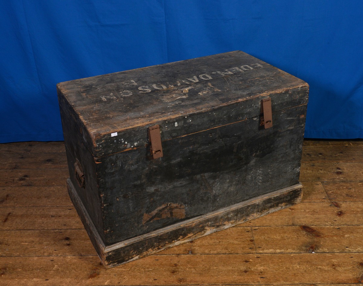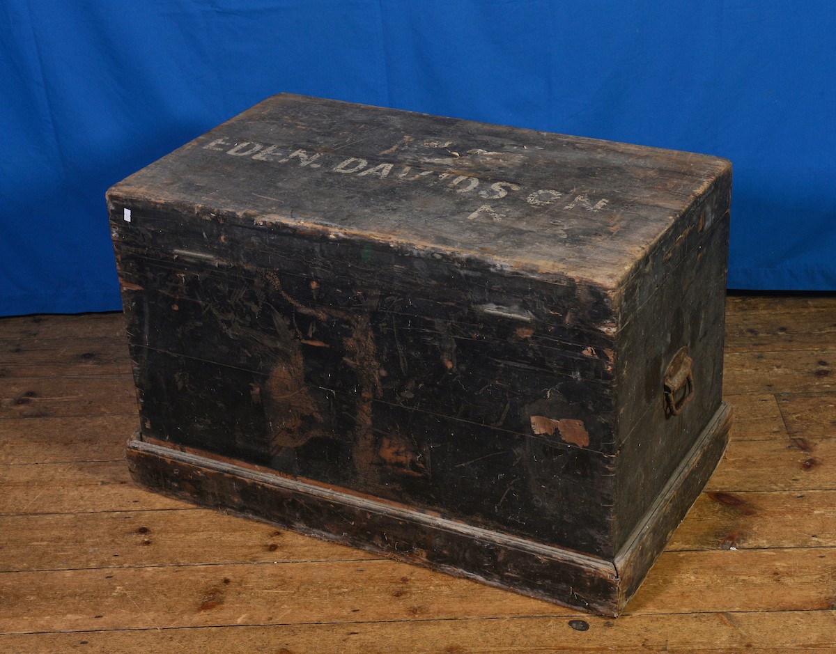 An Antique Wood Trunk marked "Eden Davidson" N.Z. with Iron Carrying Handles. Measuring: 90cms across x 53cms deep x 59cms high.