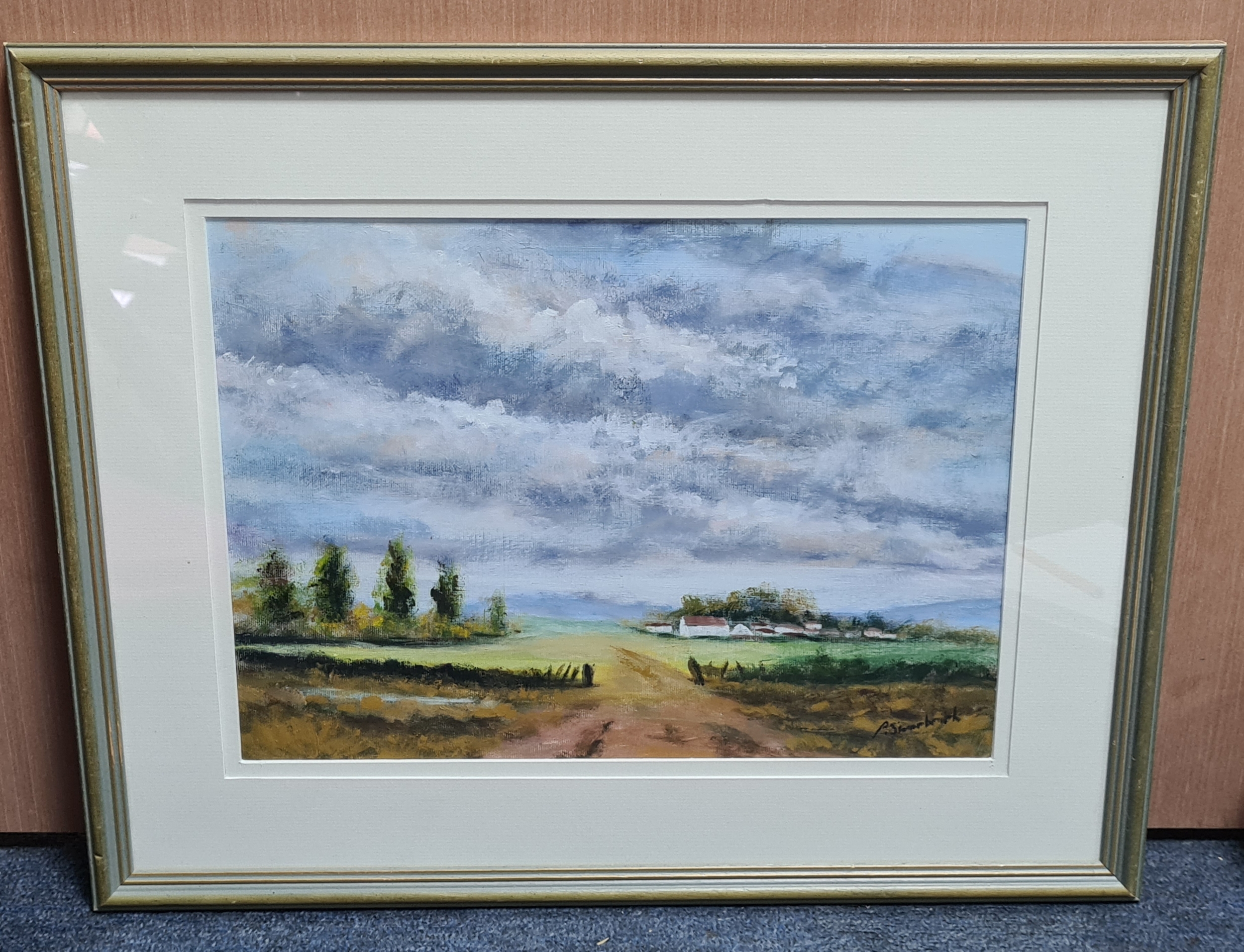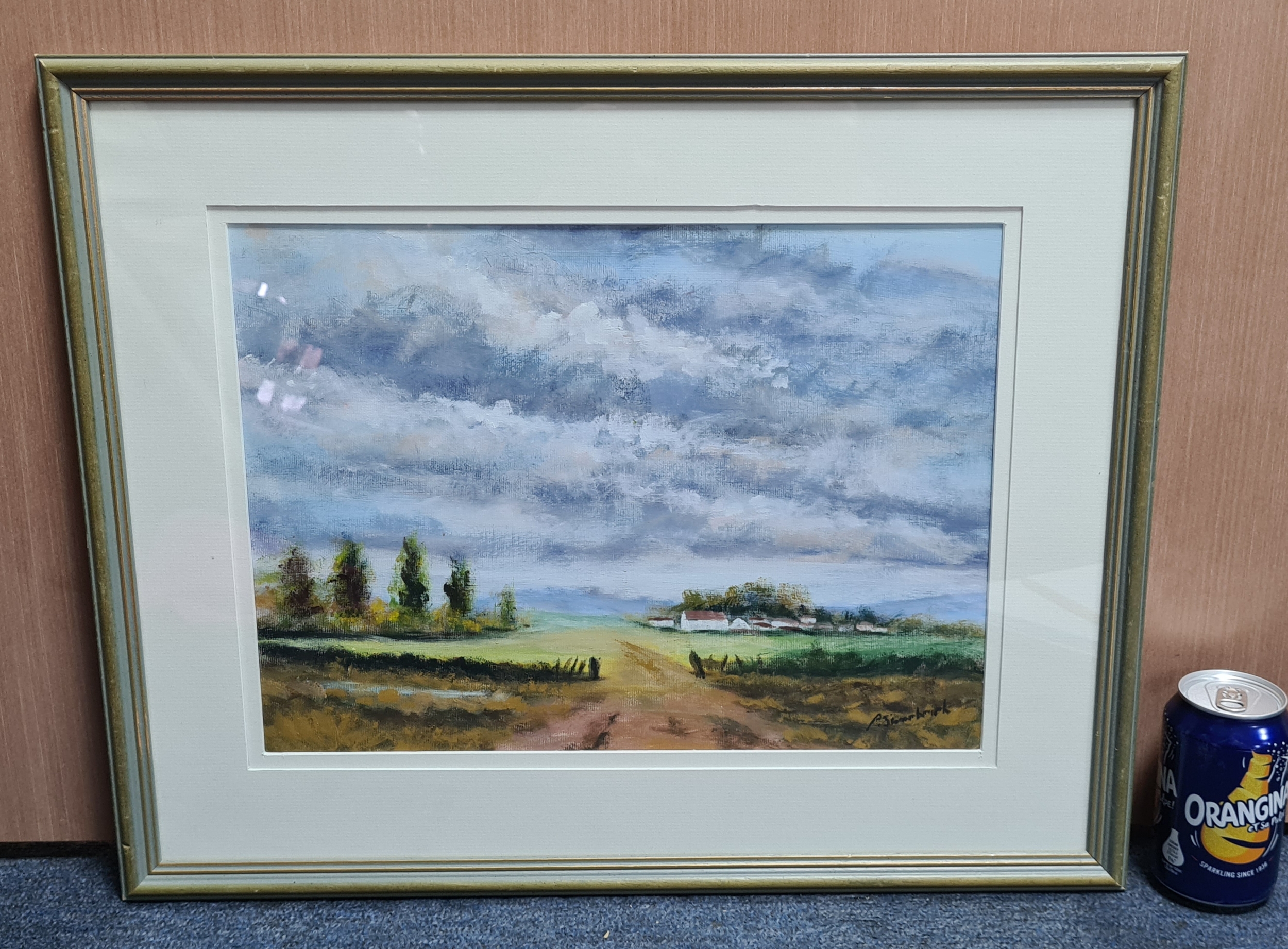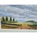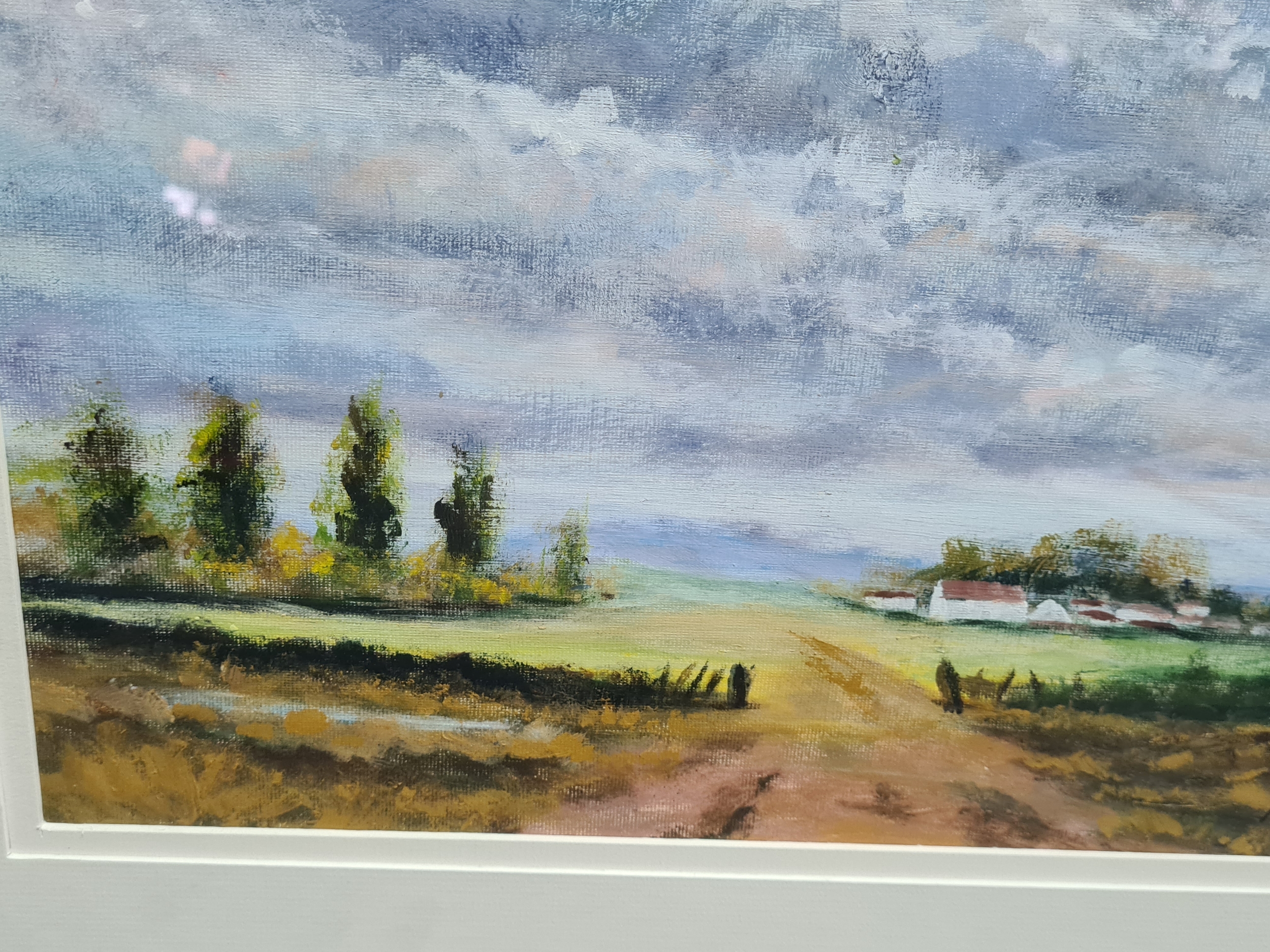Glass framed Atmospheric landscape Oil or Acrylic painting of the countryside with farmhouse. Signature illegible. Measures H44cm x54.