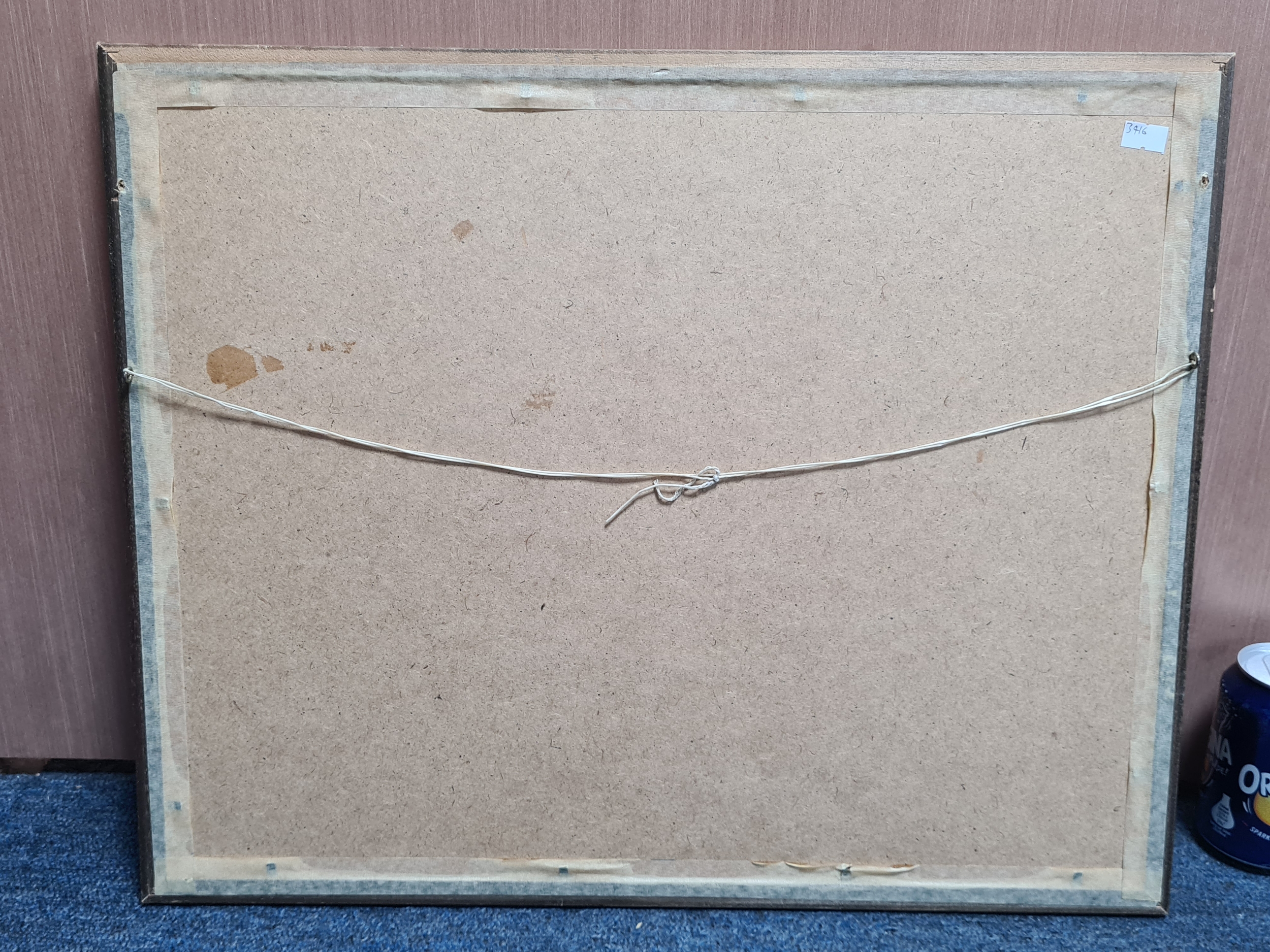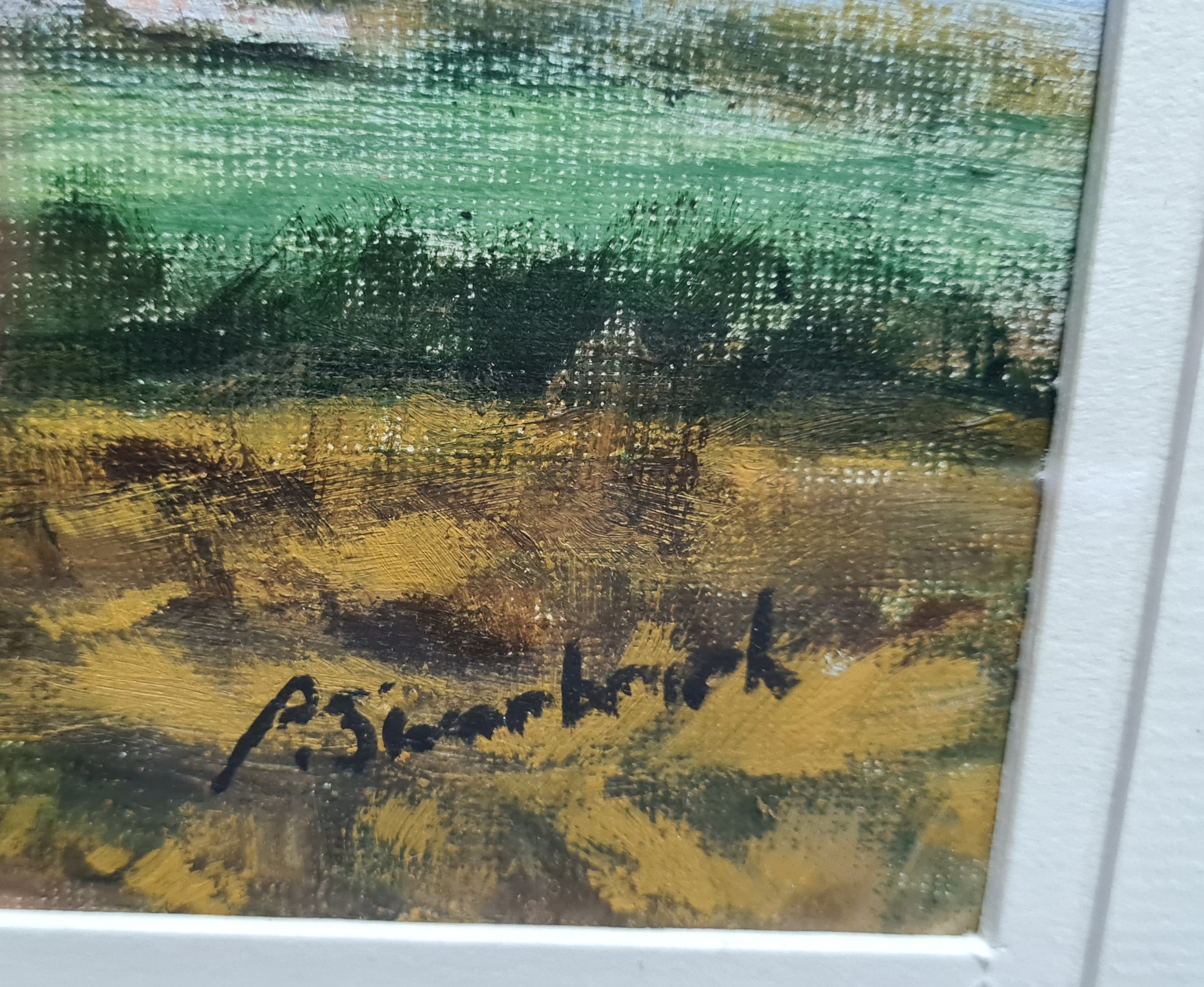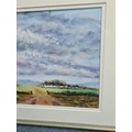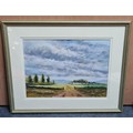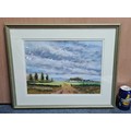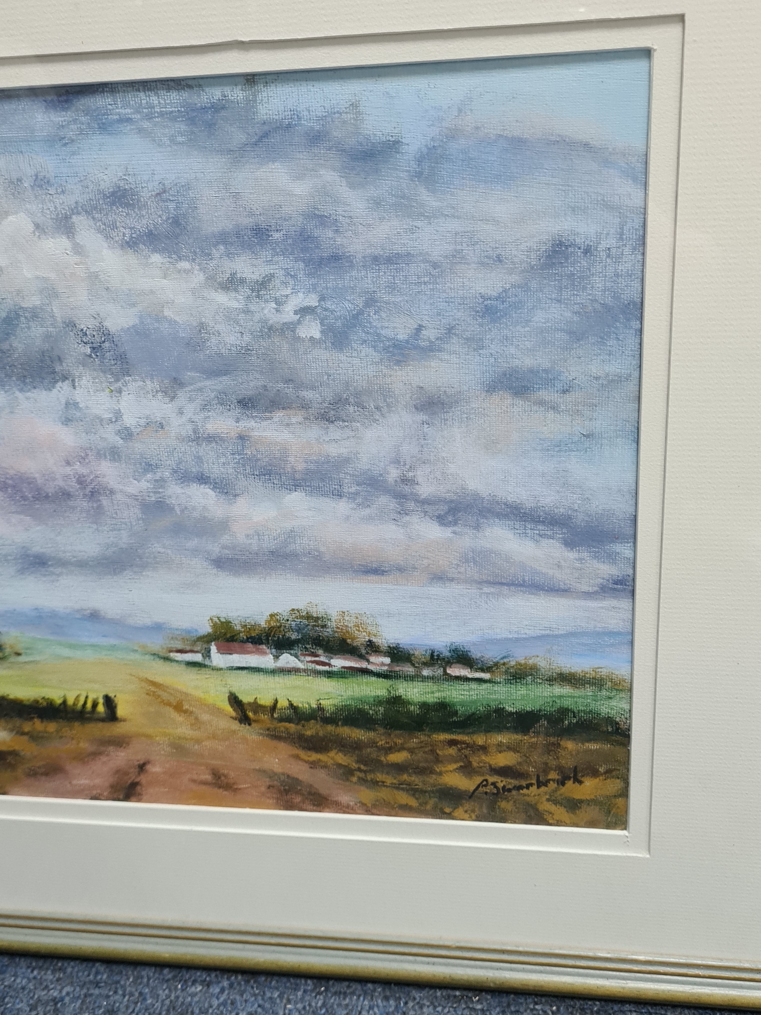 Glass framed Atmospheric landscape Oil or Acrylic painting of the countryside with farmhouse. Signature illegible. Measures H44cm x54.