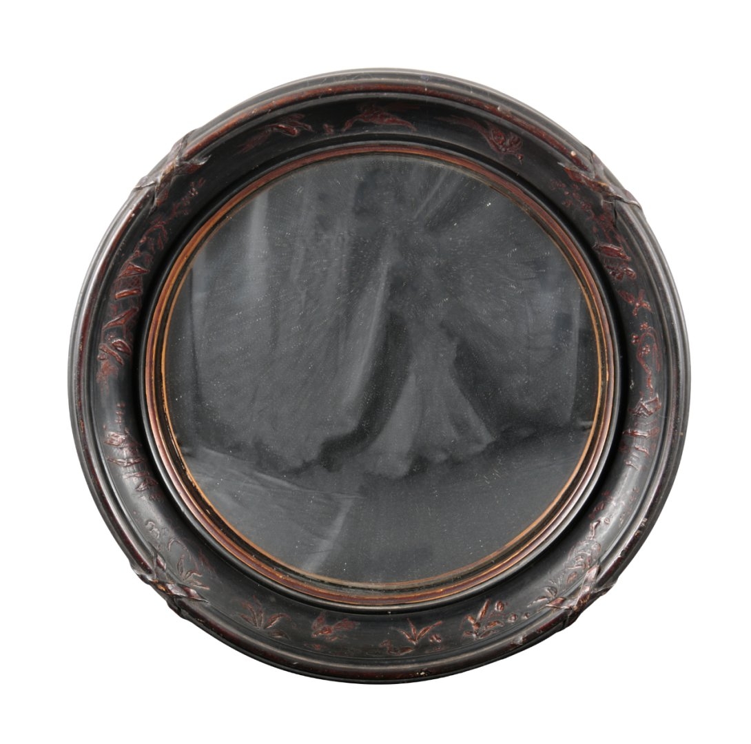 A FRENCH EBONISED CONVEX MIRRORearly 20th century, decorated in the chinoiserie style with birds and plants, 40cm wide