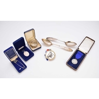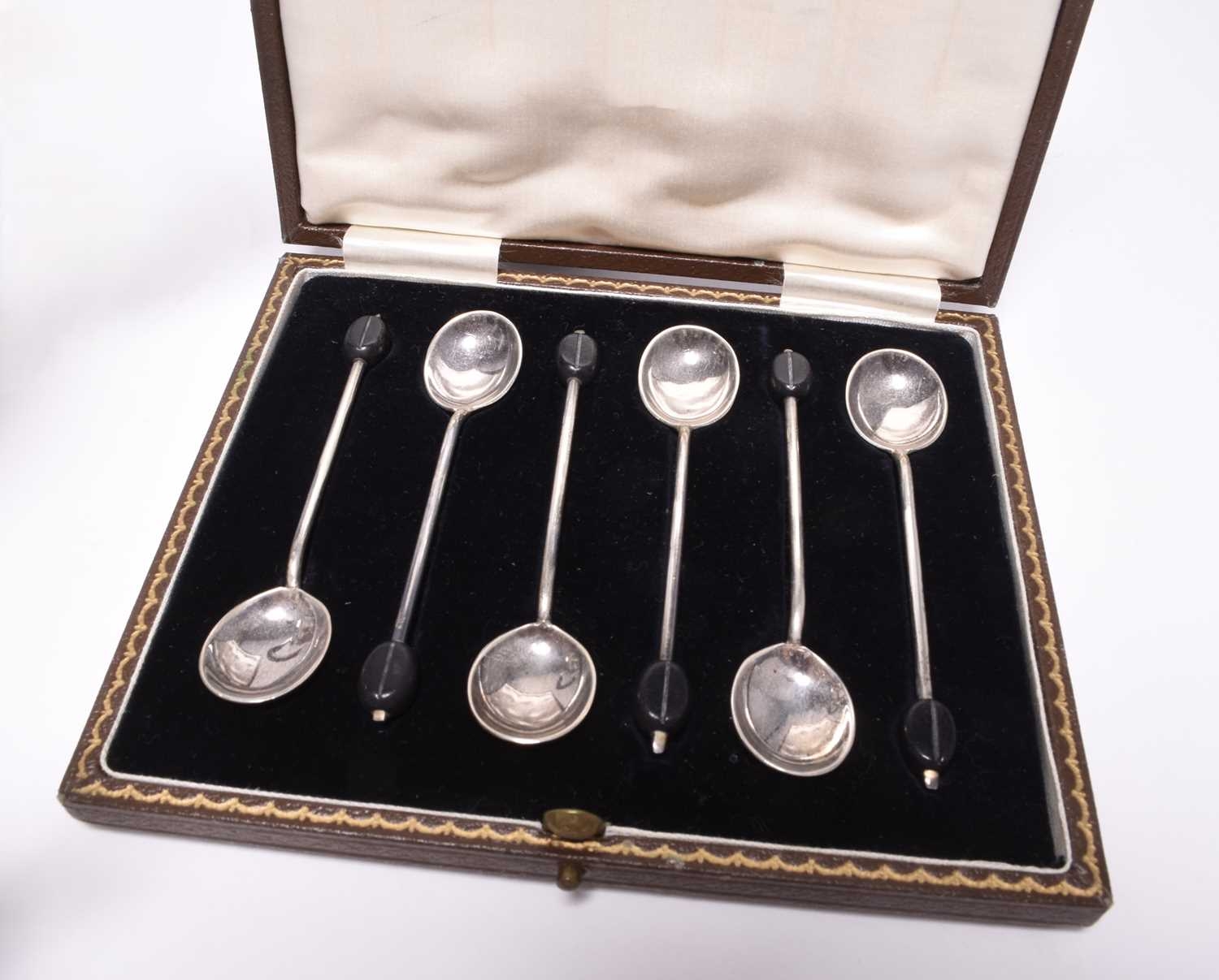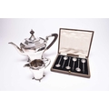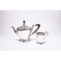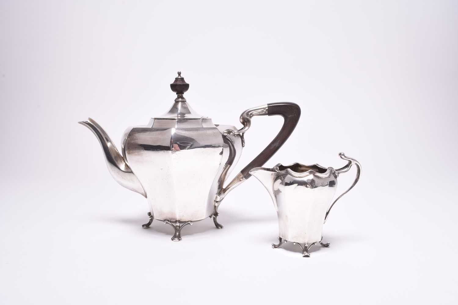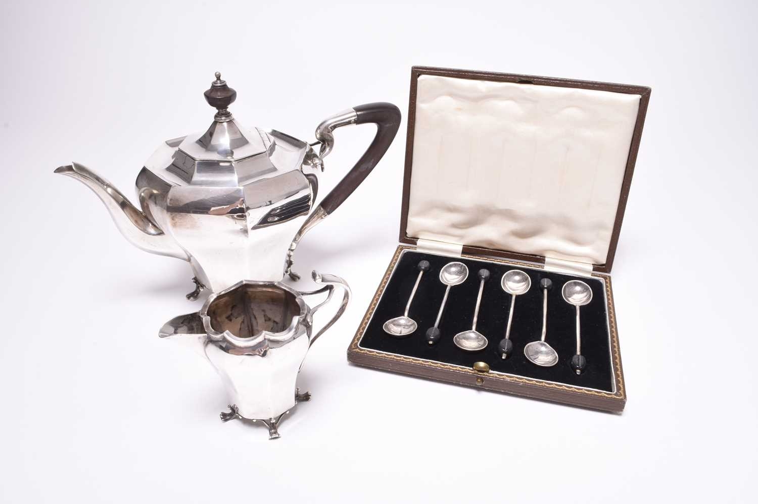 A silver teapot and cream jug, Roberts & Belk, Sheffield 1906 and 1909, each of faceted octagonal form and raised on four paw feet, together with a cased set of six silver coffee spoons with bean terminals, total weight approx 17.3oz (3)