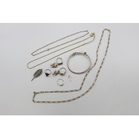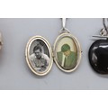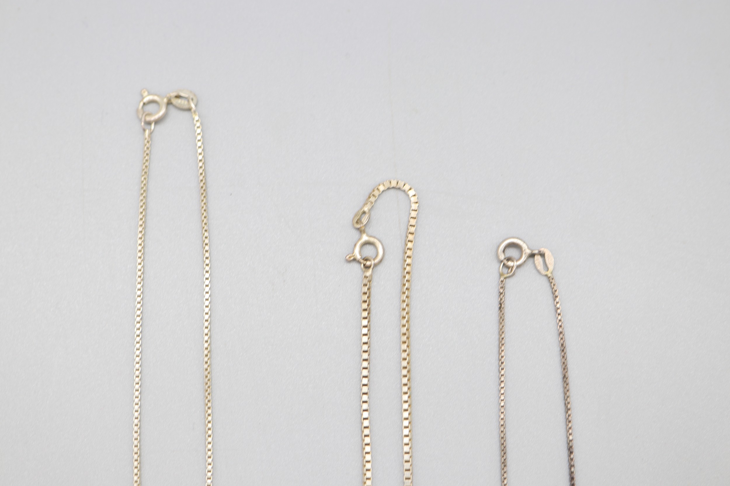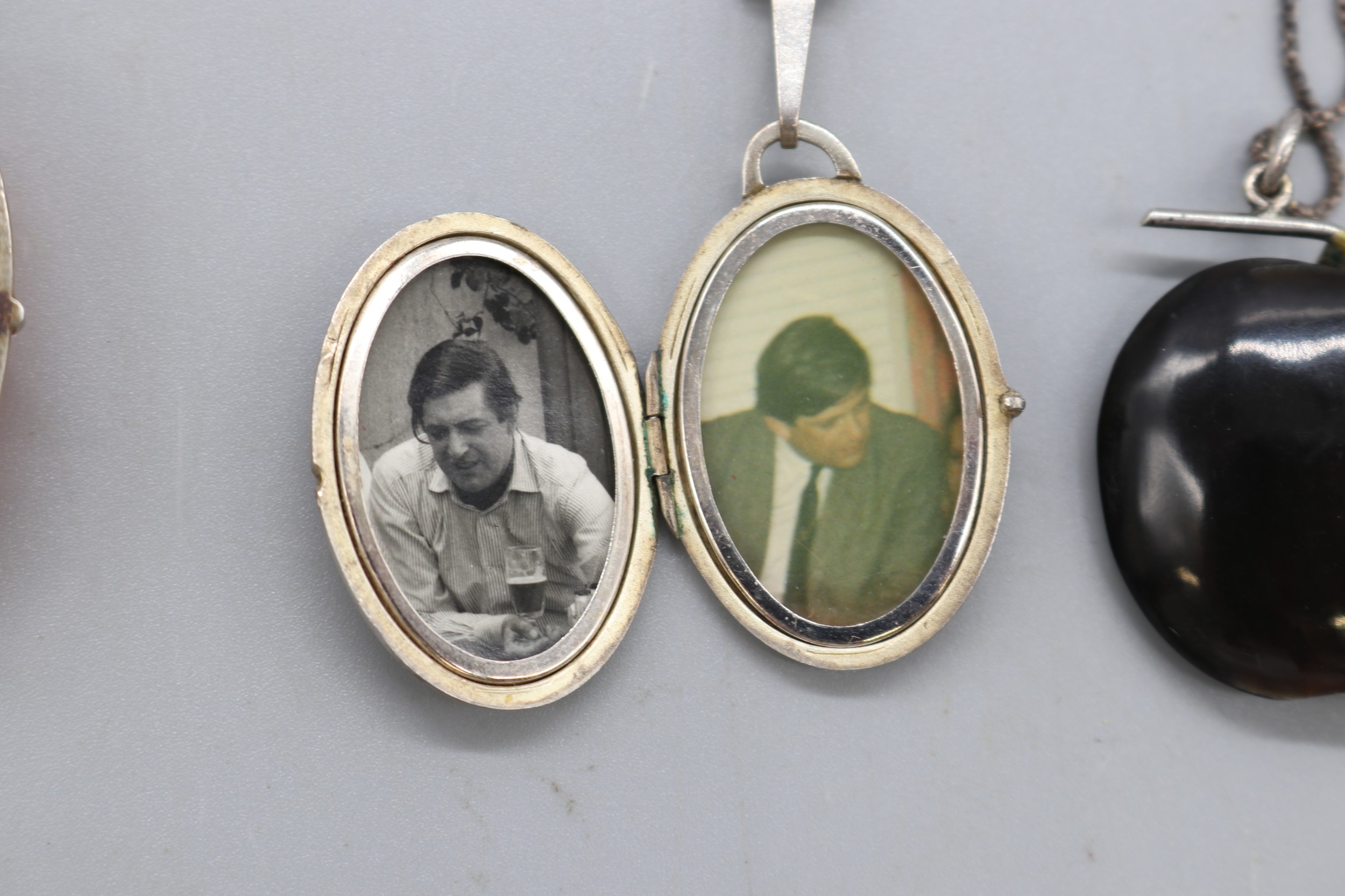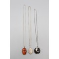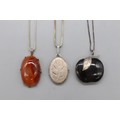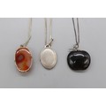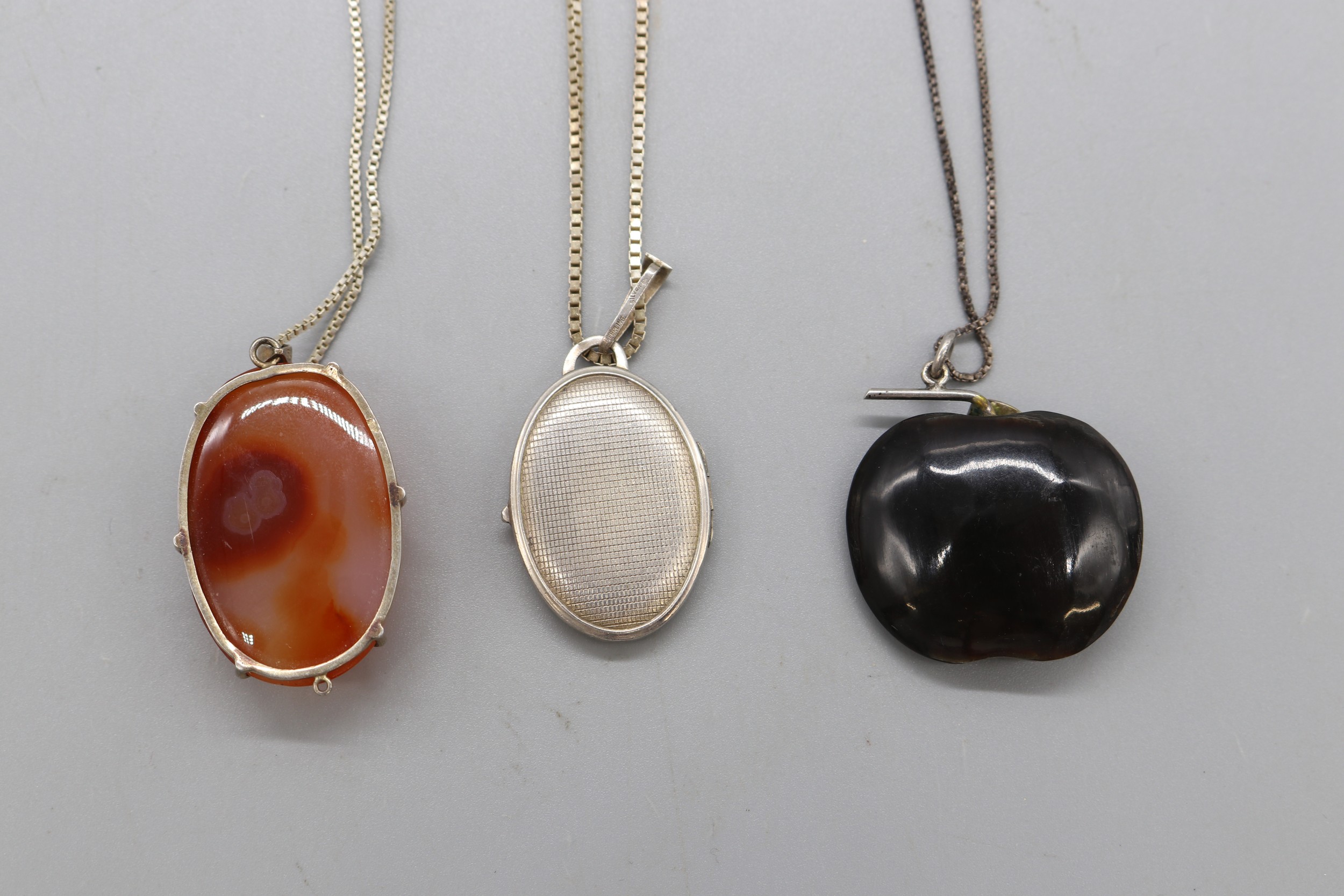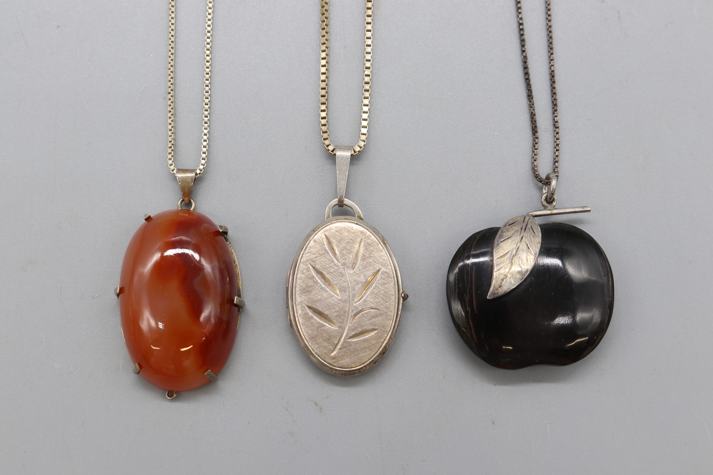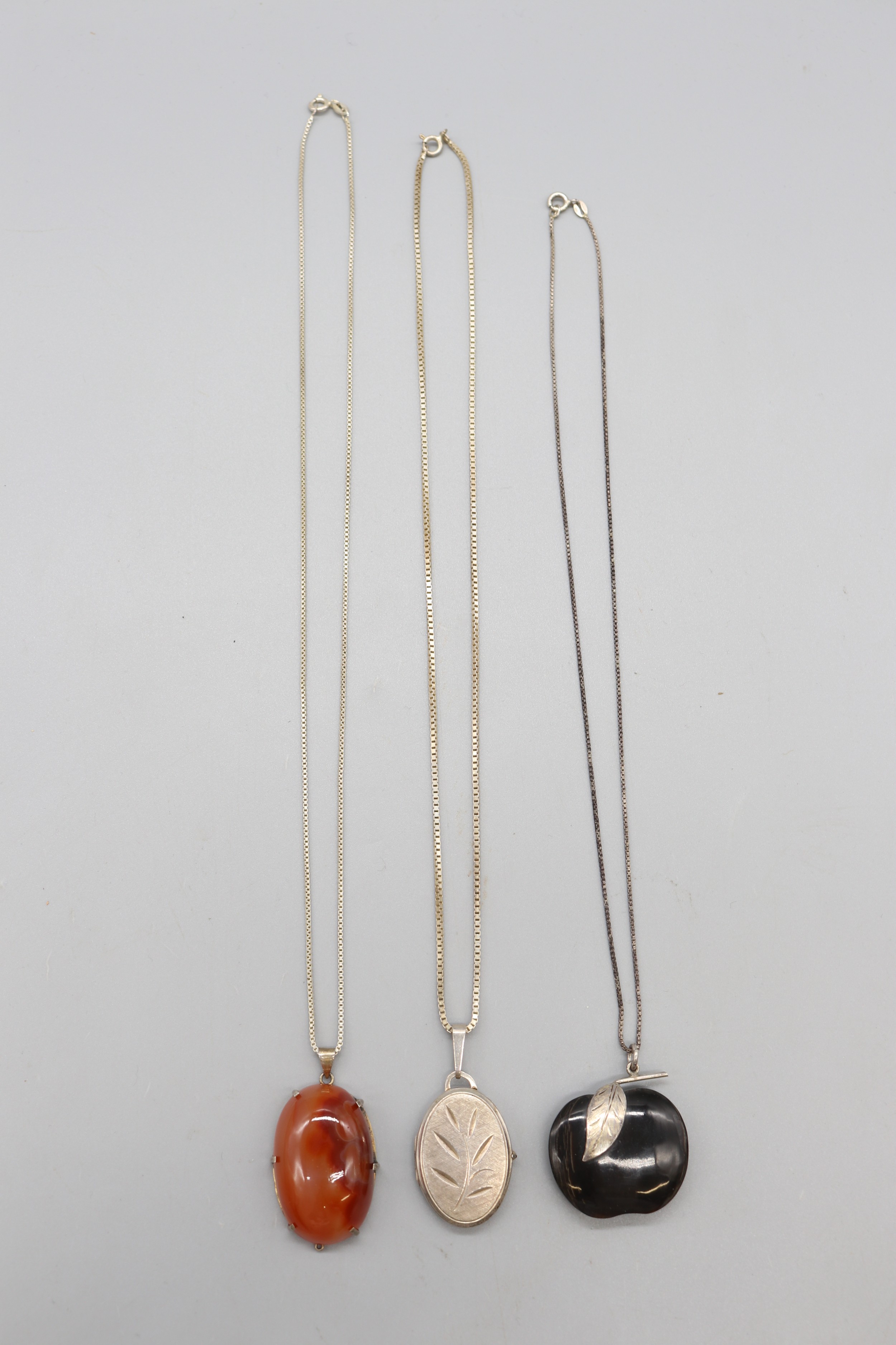 Lot of three silver pendants and chains comprised of a stamped sterling silver locket with leaf engraved front on stamped sterling box link chain, weight 19.5g, a stamped 925 sterling silver believed to be petrified wood dark stone apple pendant on box link chain, weight 9.7g and a stamped (illegible) white metal claw set banded red agate pendant on stamped sterling box link chain, weight 19.42g