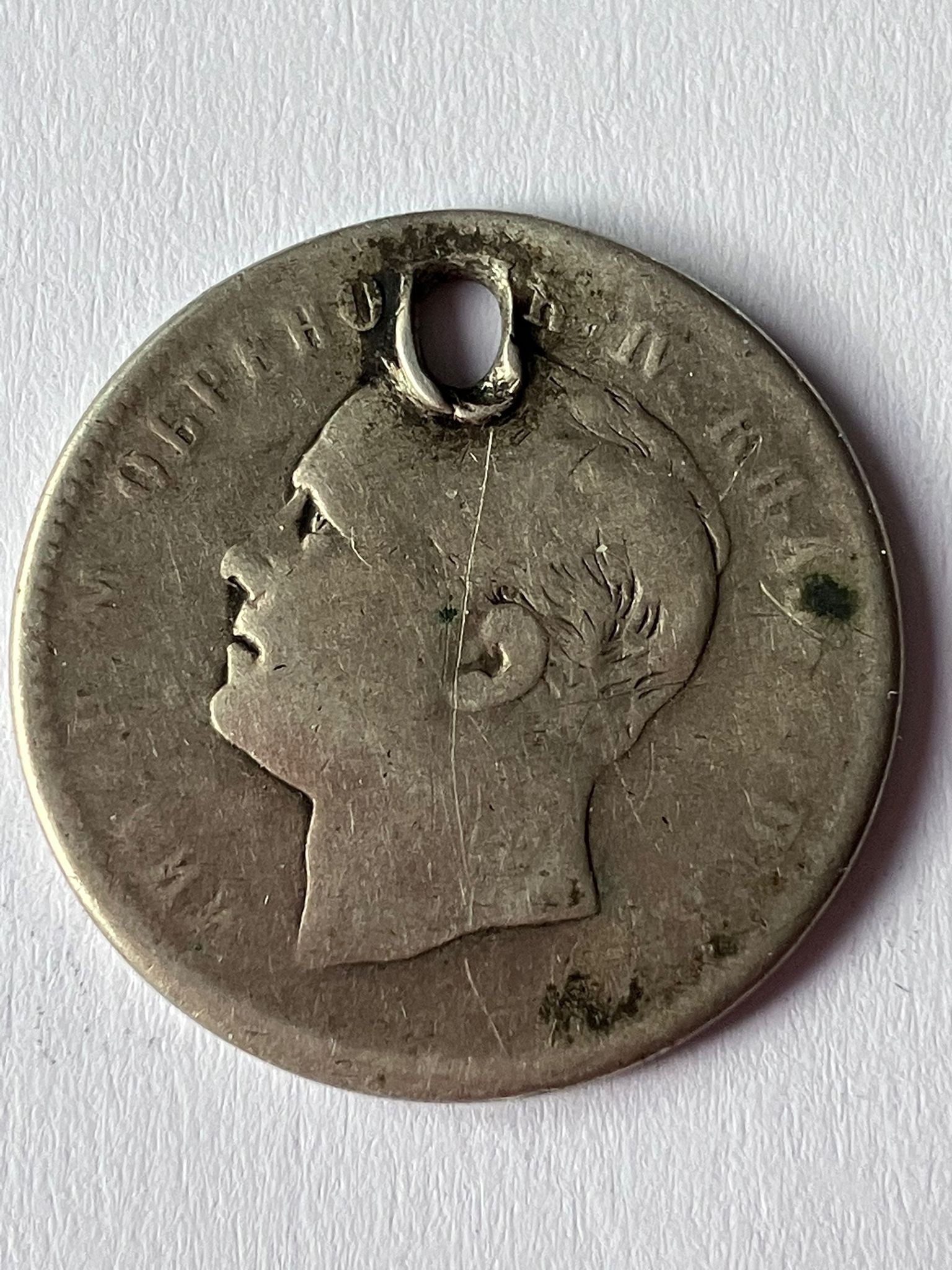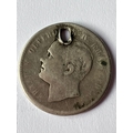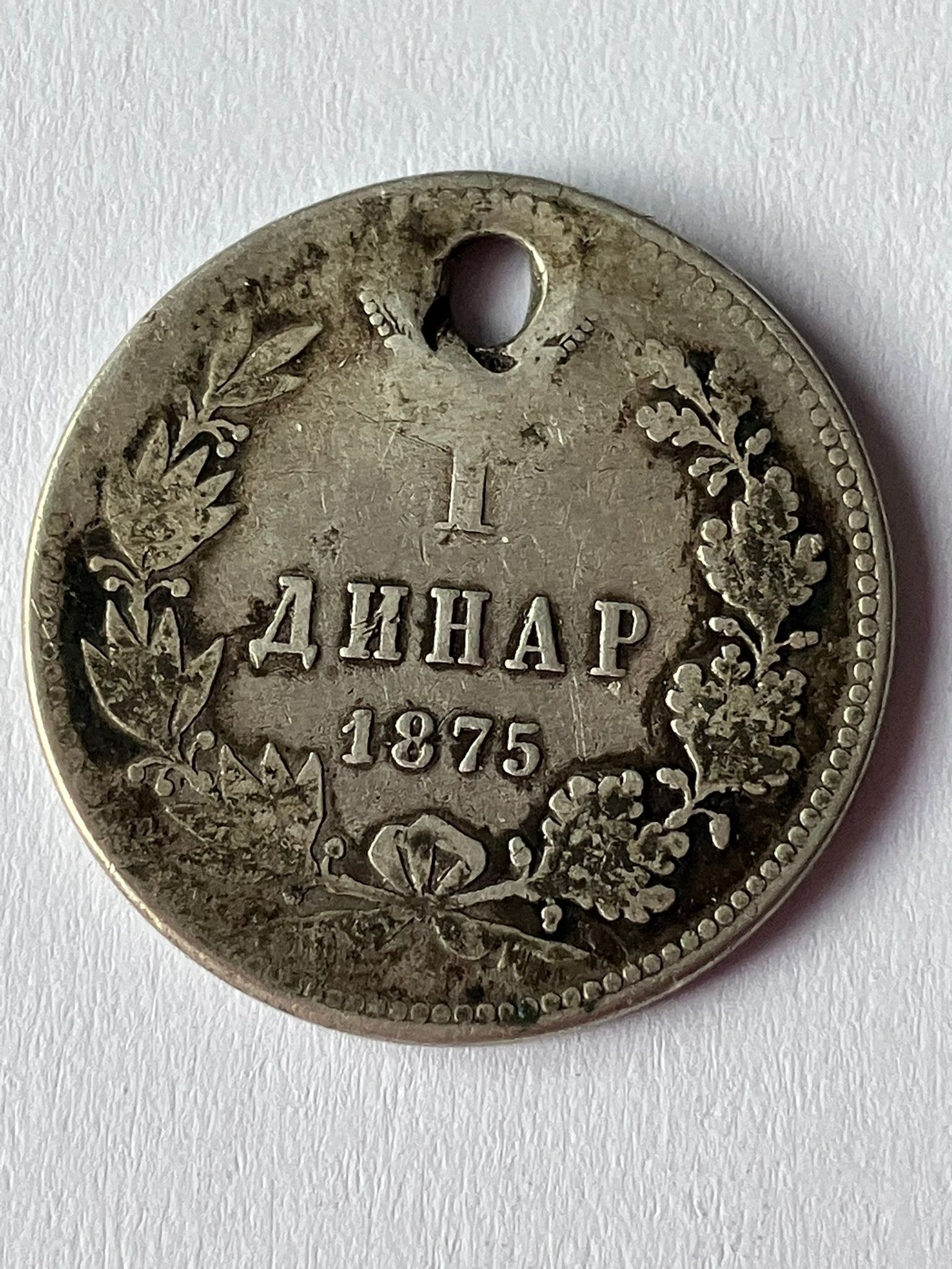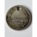 1875 SERBIAN 1 DINAR SILVER COIN. Drilled. Worn/ Fair Condition.