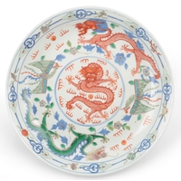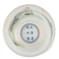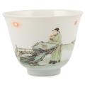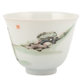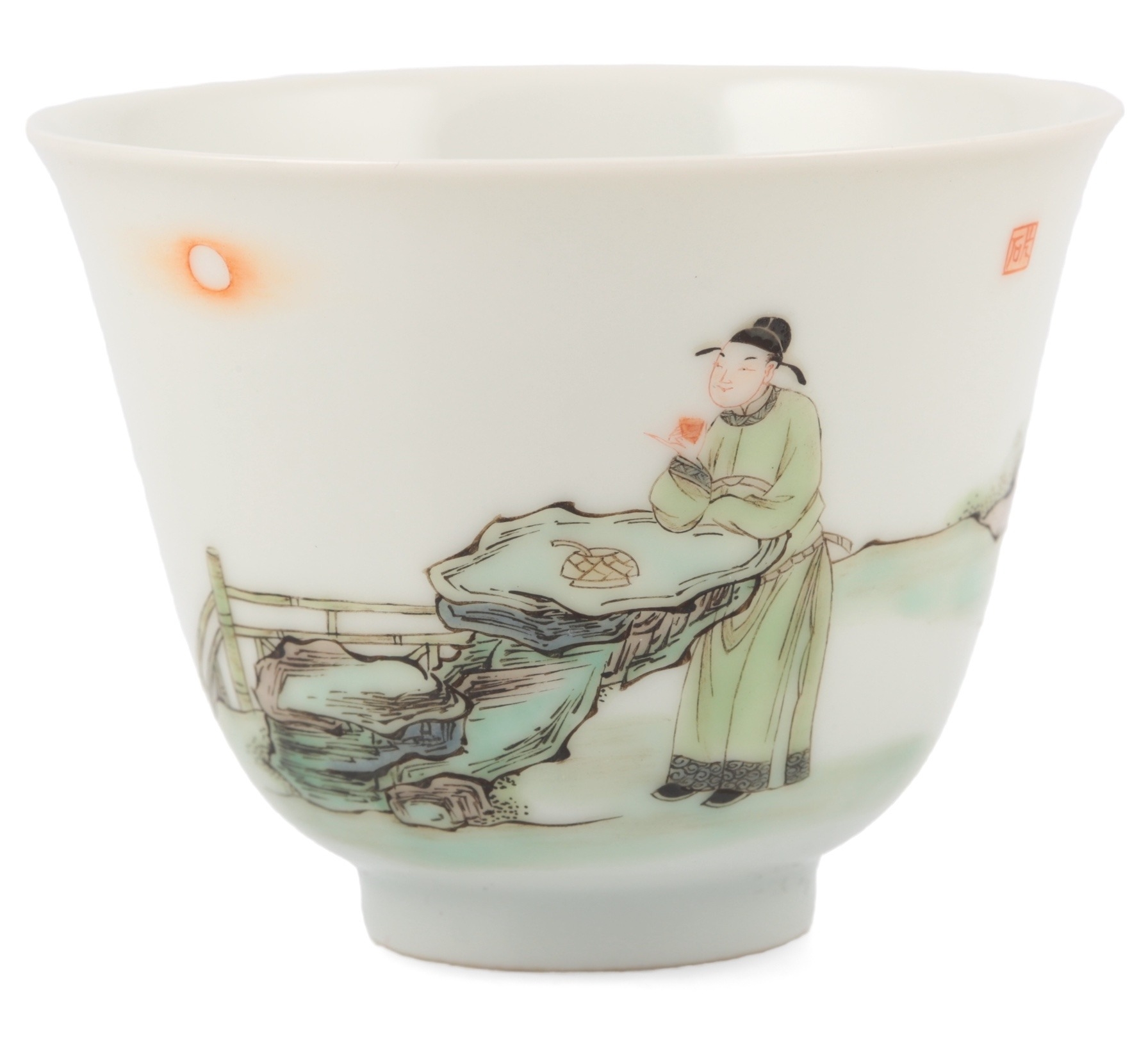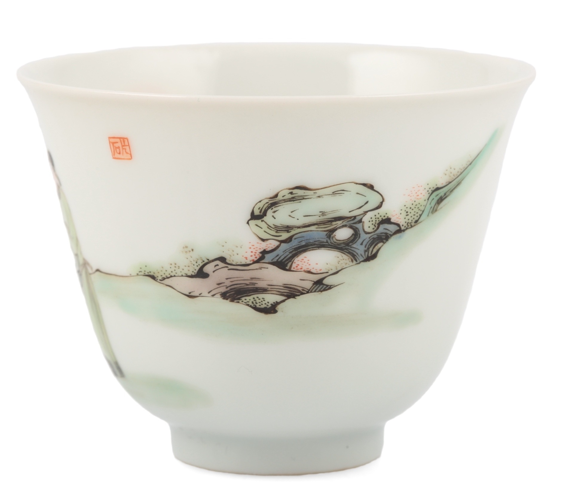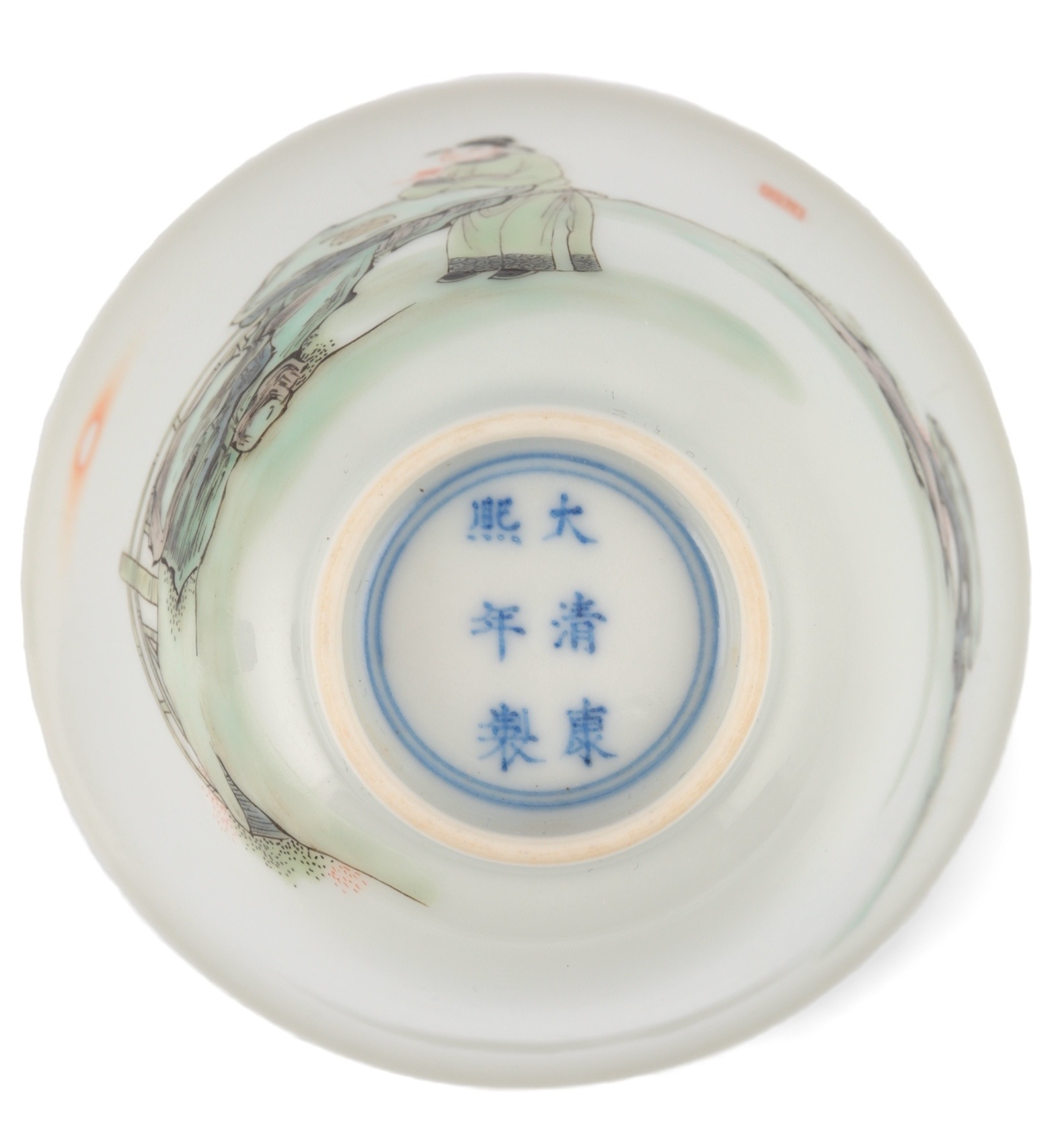 A Chinese enamelled porcelain tea cup, Kangxi mark but later, painted with a scholar drinking from a cup on a rocky outcrop in a landscape, underglaze blue six character mark, height 4.9cm