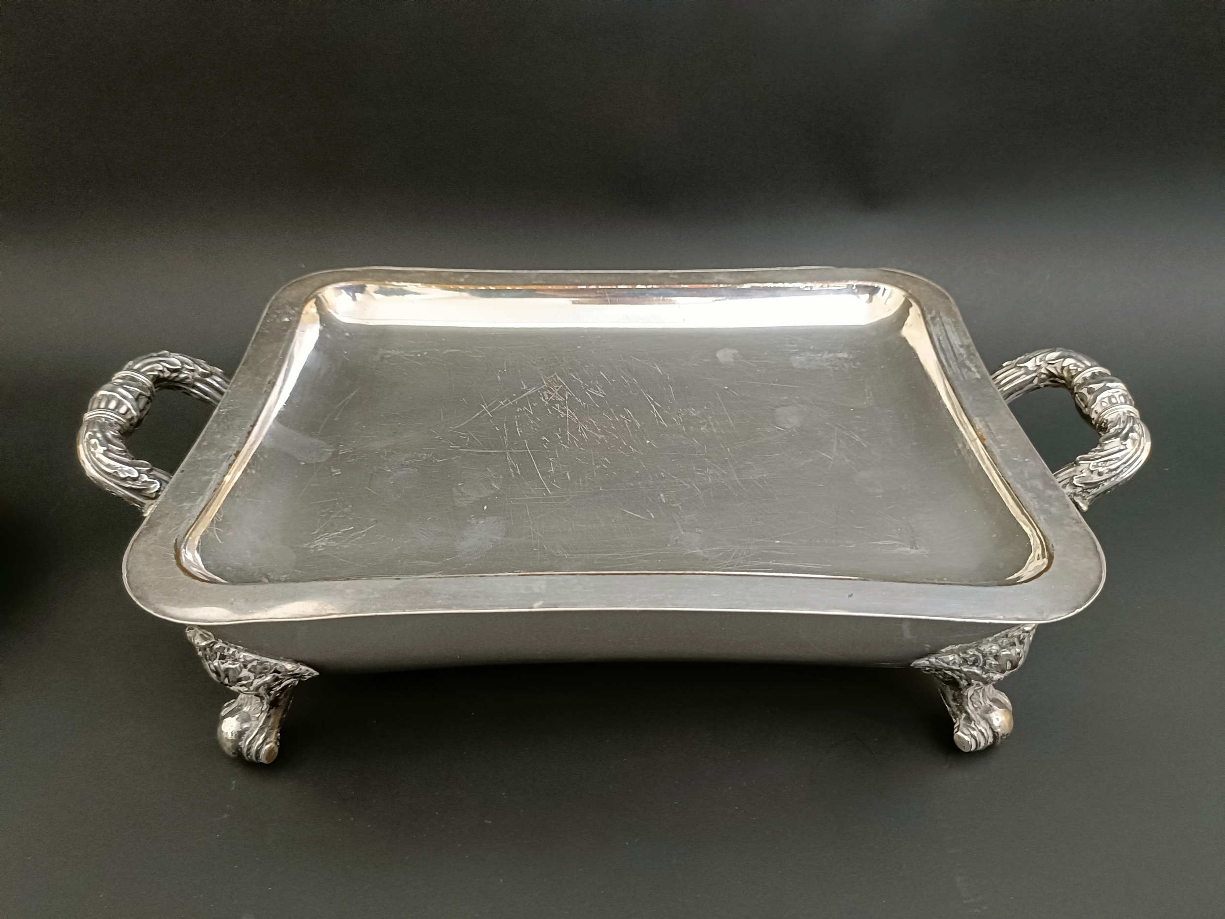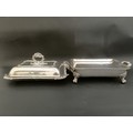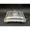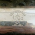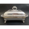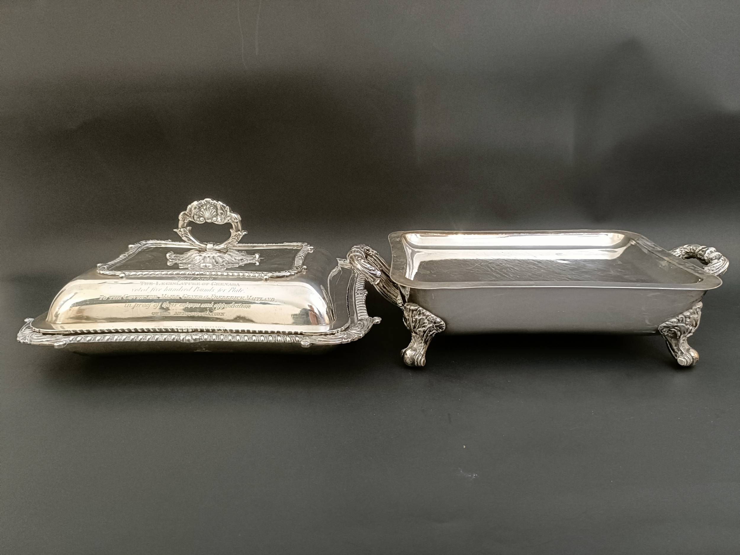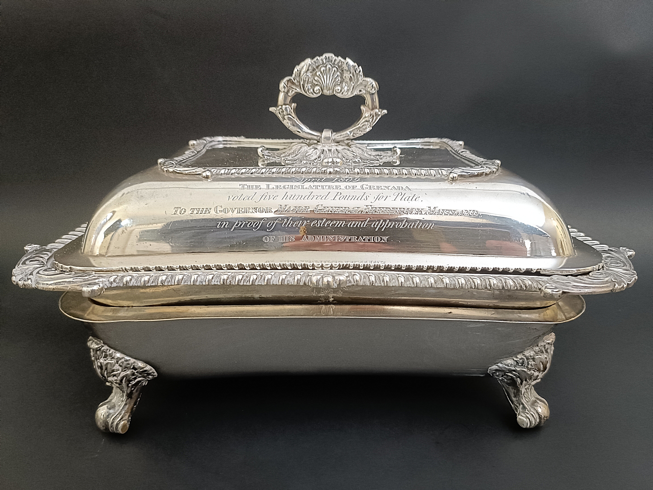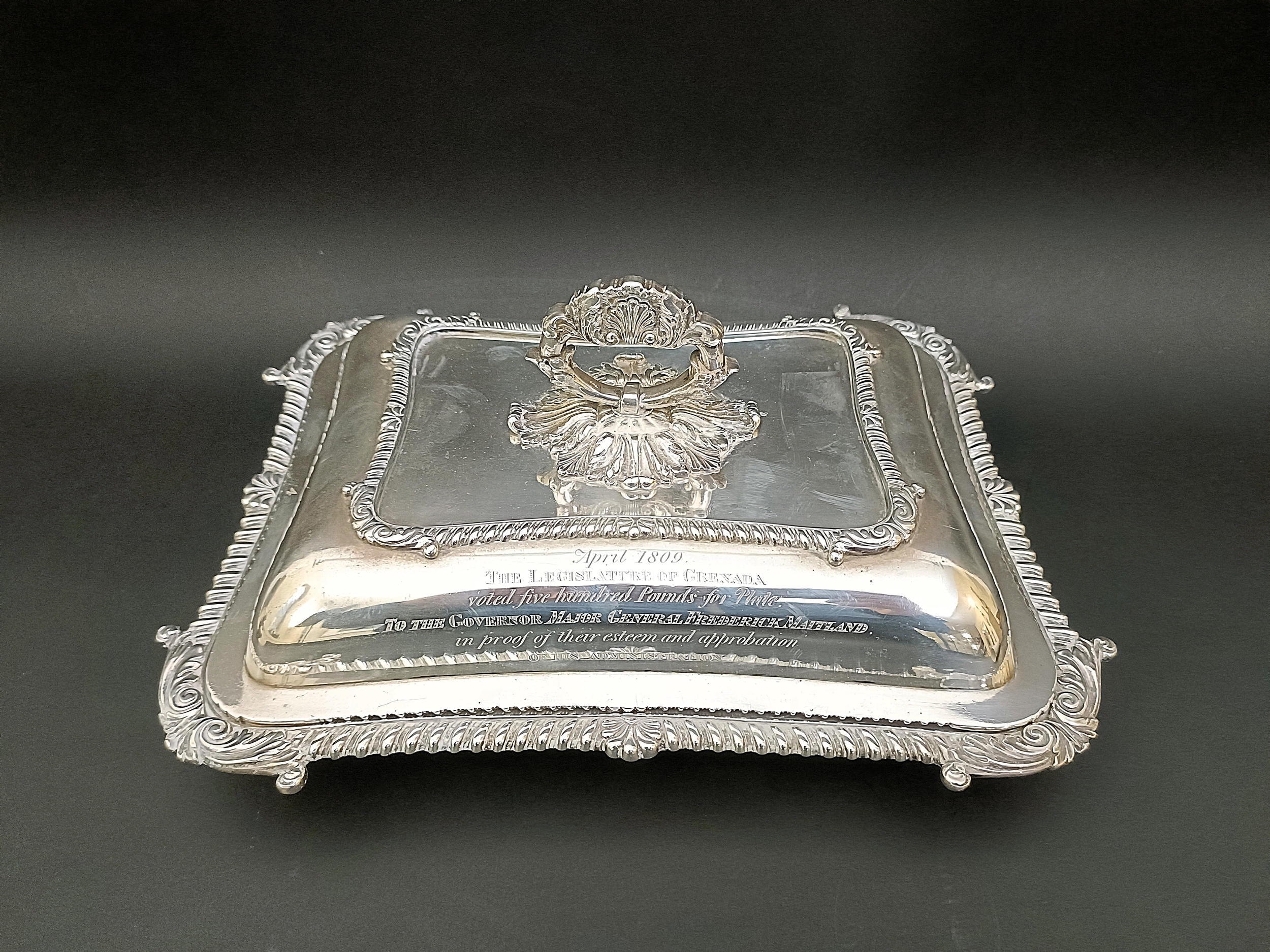 A George III silver presentation entree dish and cover, crested and engraved an armorial, engraved 'April 1809 THE LEGISLATURE OF GRANADA VOTED FIVE HUNDRED POUNDS FOR PLATE. TO THE GOVERNOR MAJOR GENERAL FREDERICK MAITLAND IN PROOF OF THEIR ESTEEM AND APPROBATION OF HIS ADMINISTRATION' London 1809, 67.4 ozt, 31 cm, on an associated sliver plated warming stand