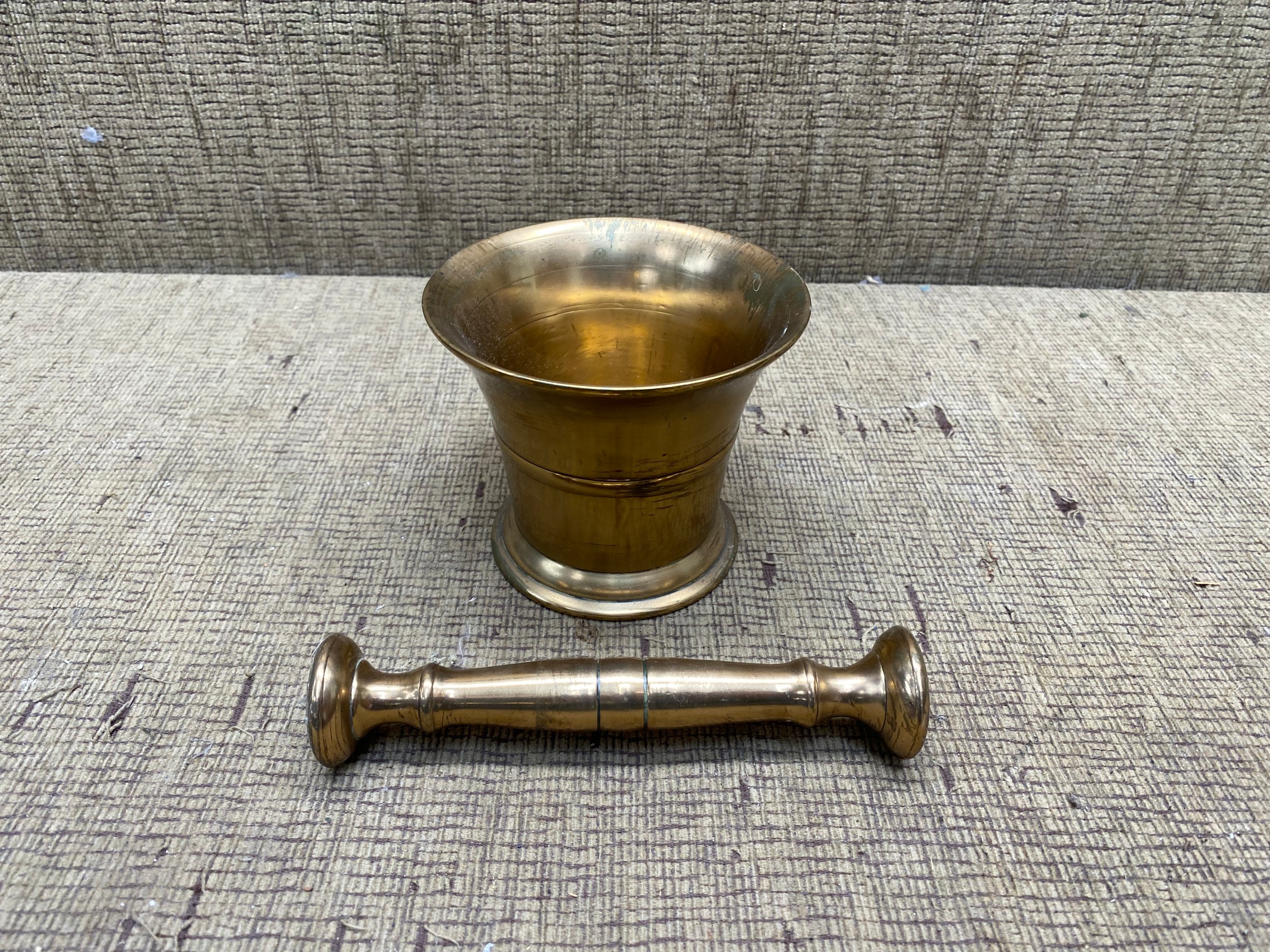 Antique brass pestle and mortar.
