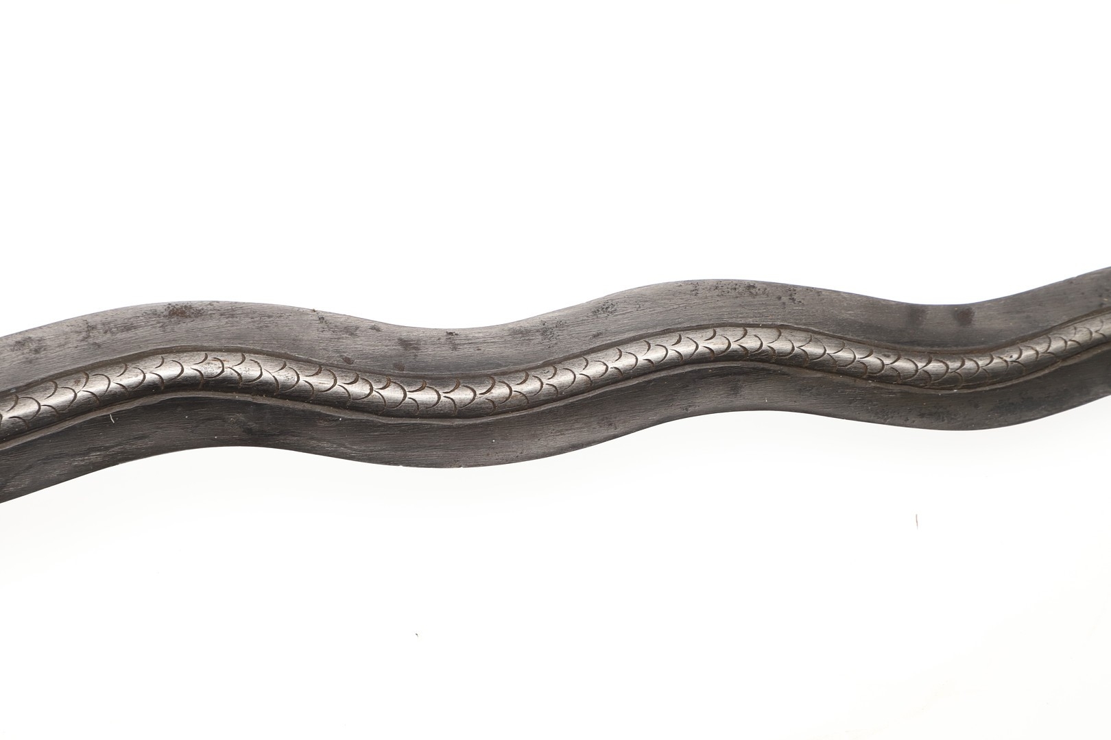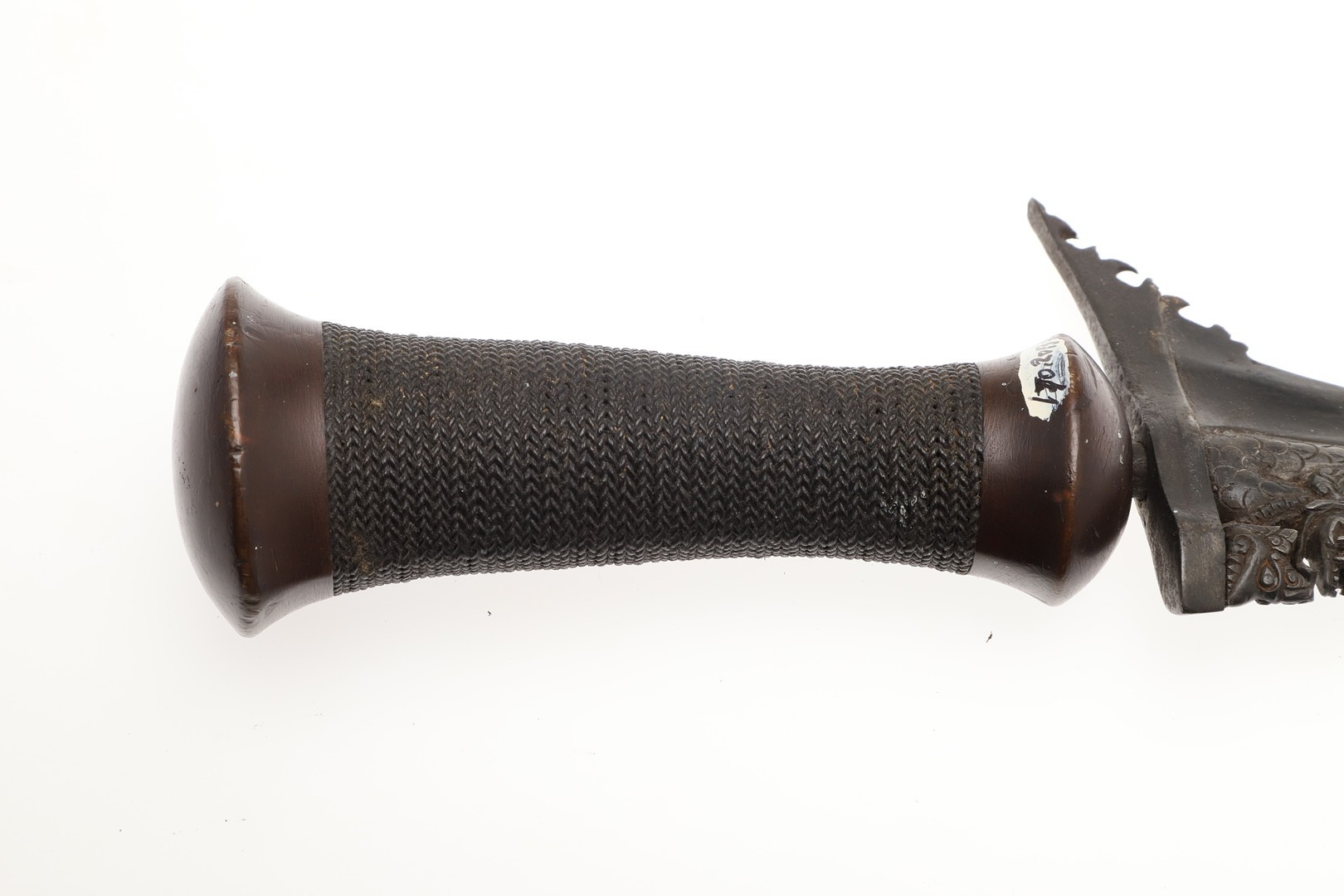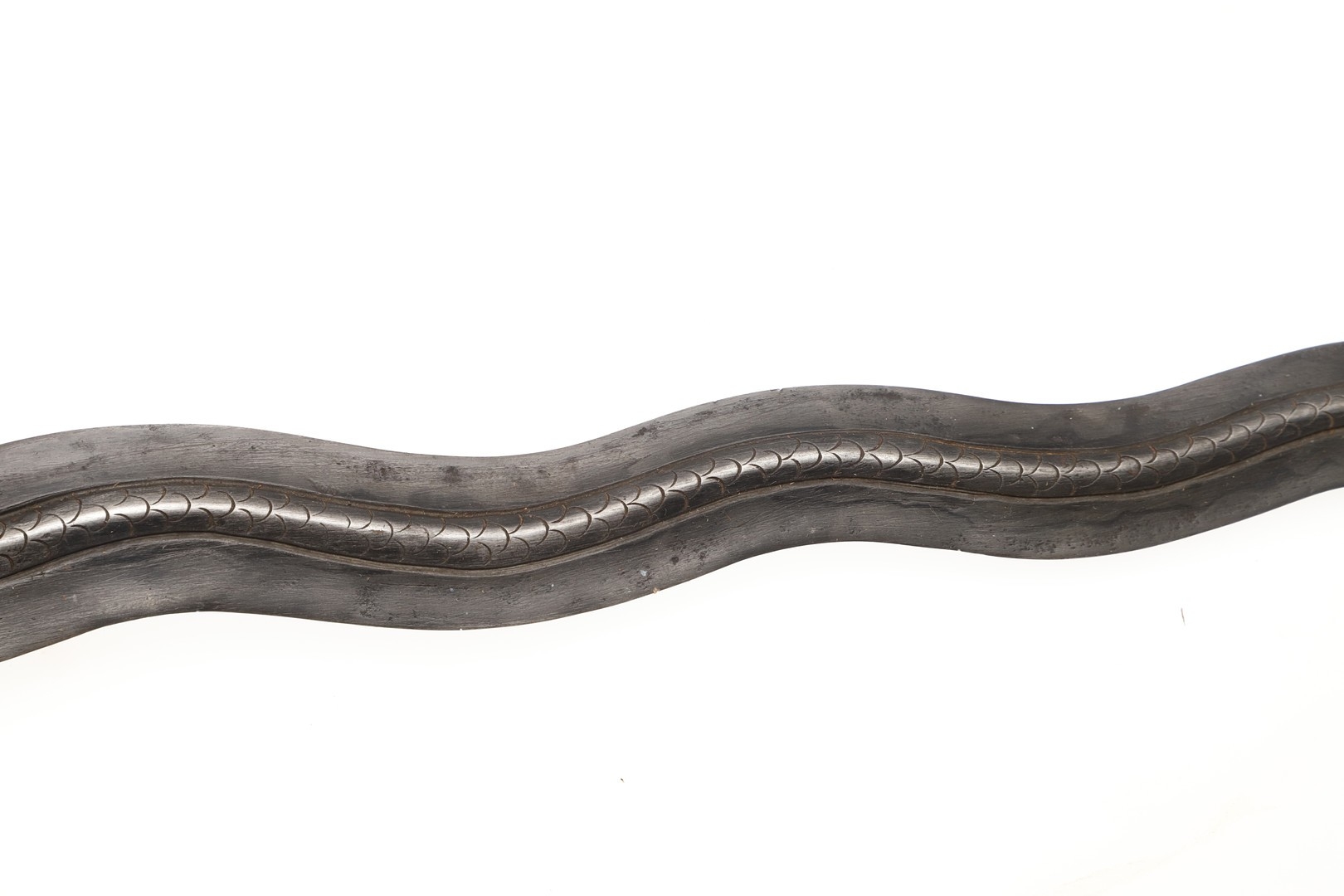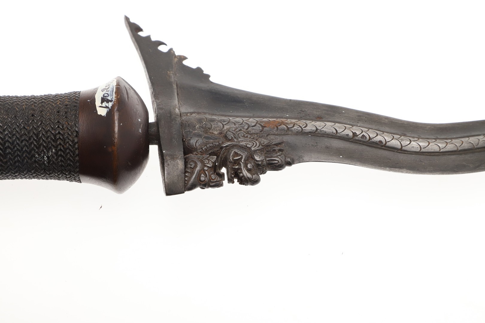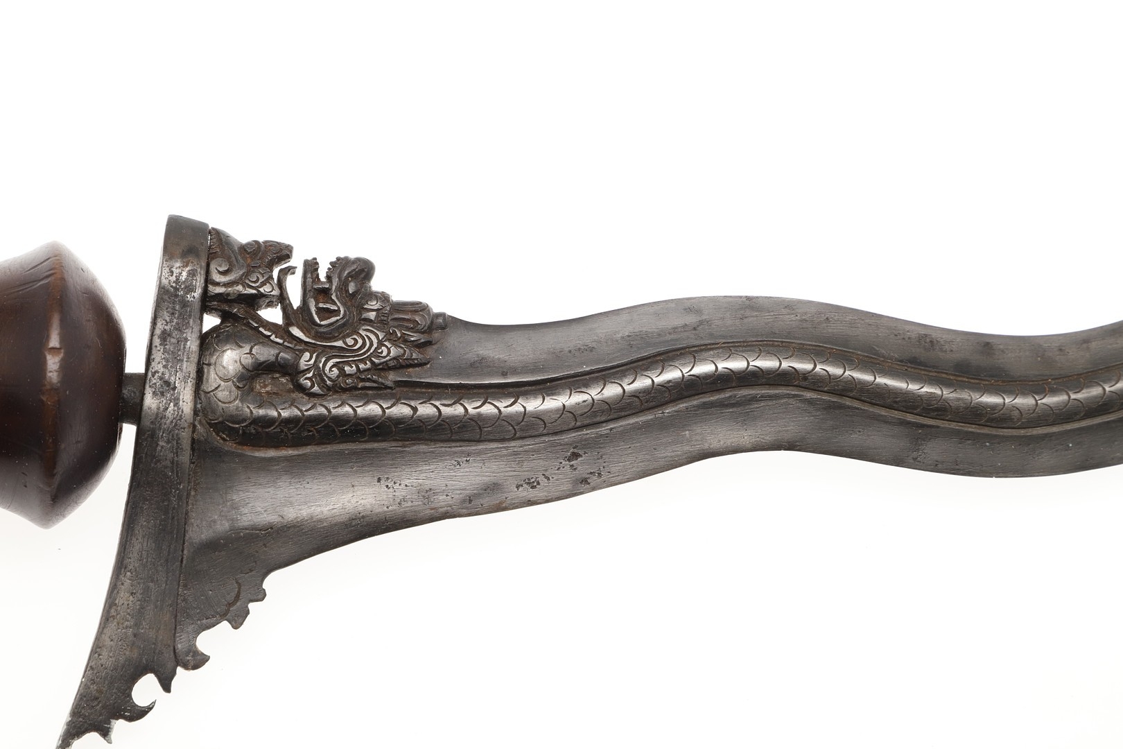 A KRIS NAGARAJA AND SCABBARD FROM LOMBOK OR BALI. The 45 cm ten curved blade with the Naga snake carved in relief to almost the entire length of the blade. The Naga wearing a royal tiara. On a turned wooden grip with a woven cover. In a plain wooden scabbard of the Lombok Bali type, the Sampir of fine black wood. 66.5 cm.